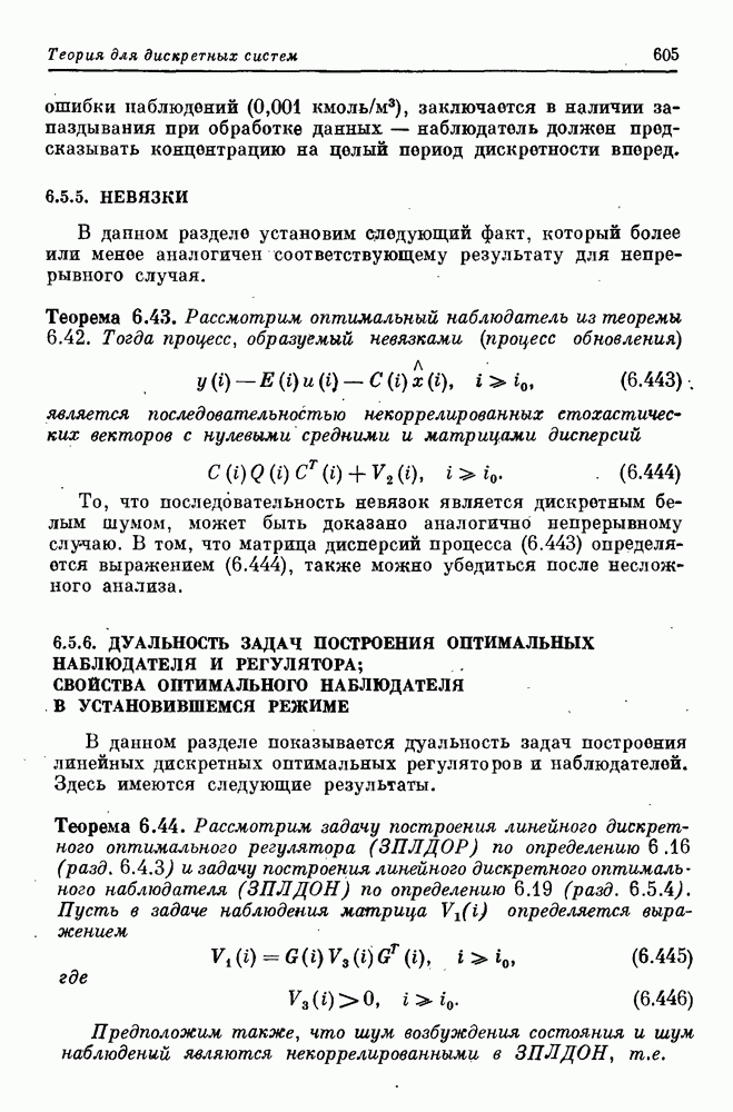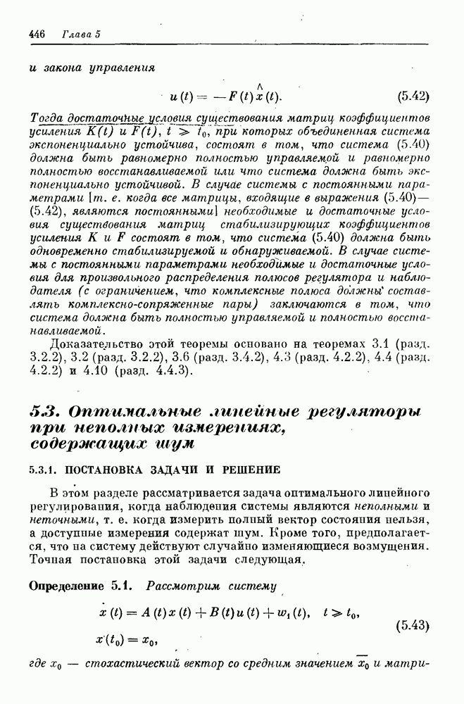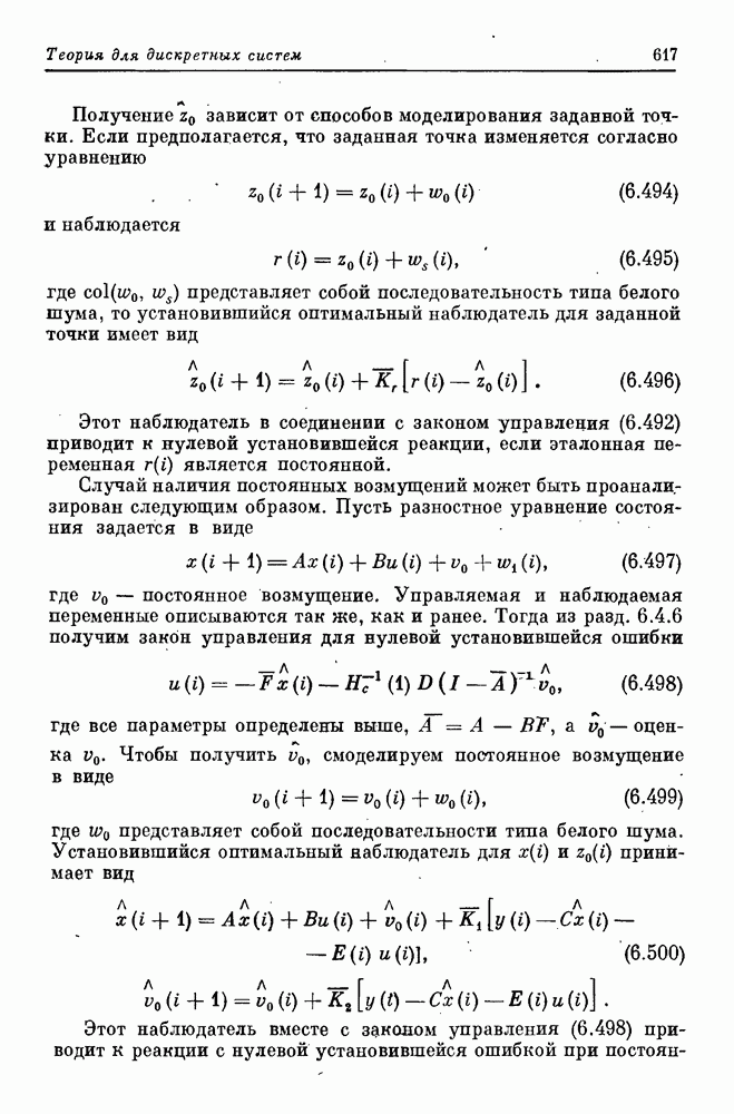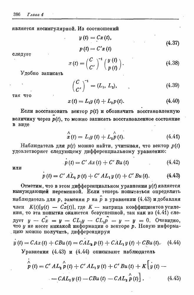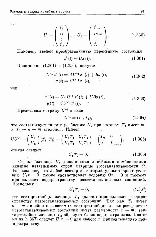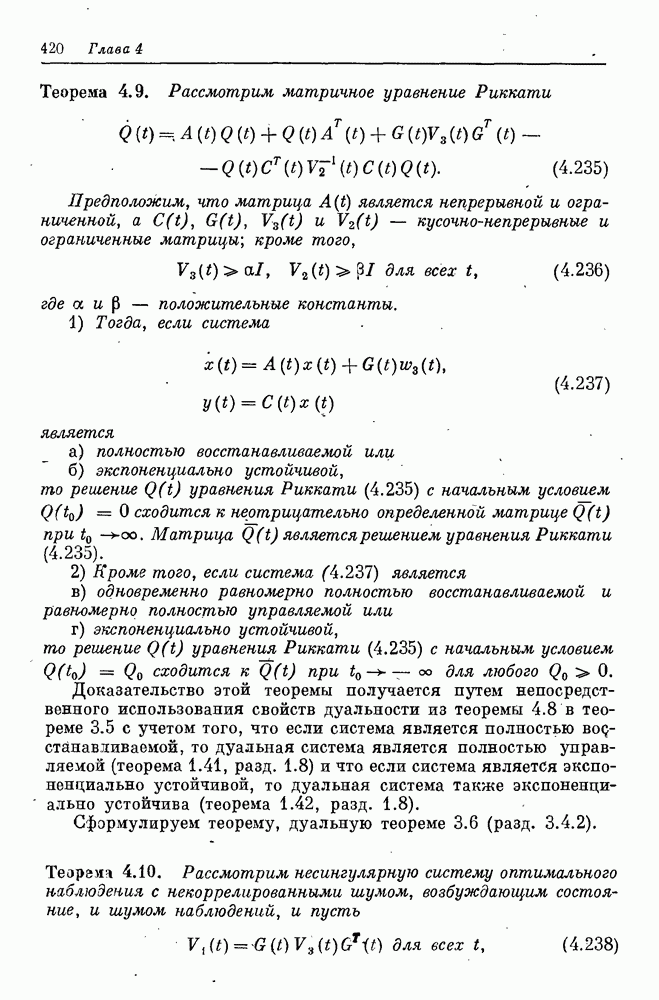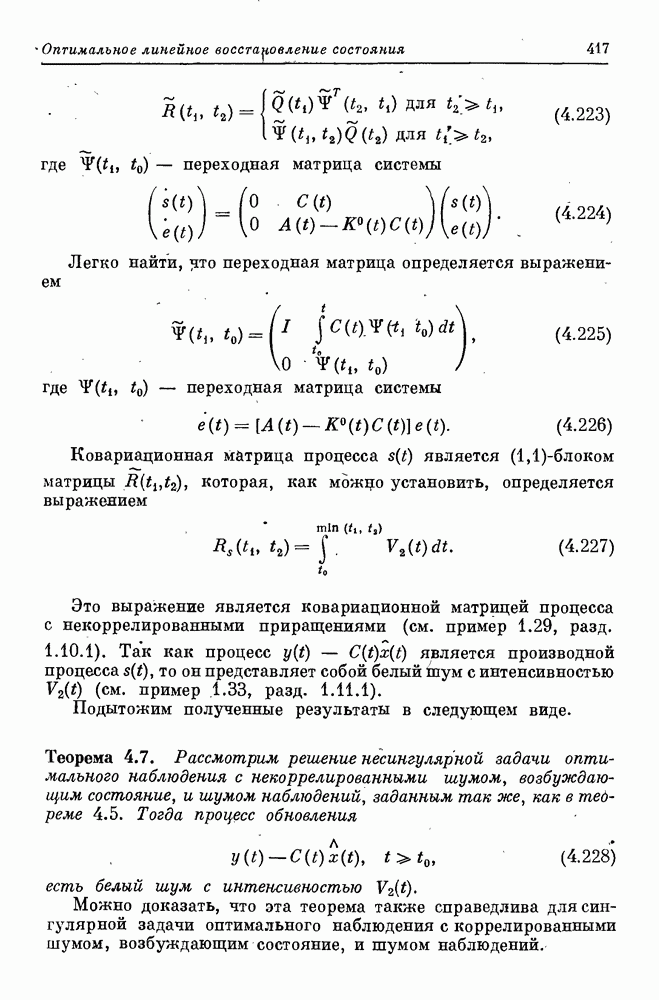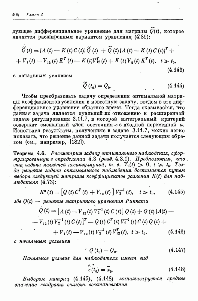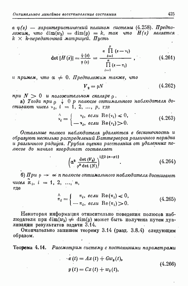 по будущим значениям выходной переменной. В задачах управления и фильтрации, однако, имеются обычно только прошлые значения выходной переменной. Поэтому более естественно рассматривать восстанавливаемость, которая ставит задачу определения настоящего состояния по прошлым наблюдениям. Нетрудно обнаружить, что для систем с постоянными параметрами из полной посстанавливаемости следует полная наблюдаемость и наоборот.