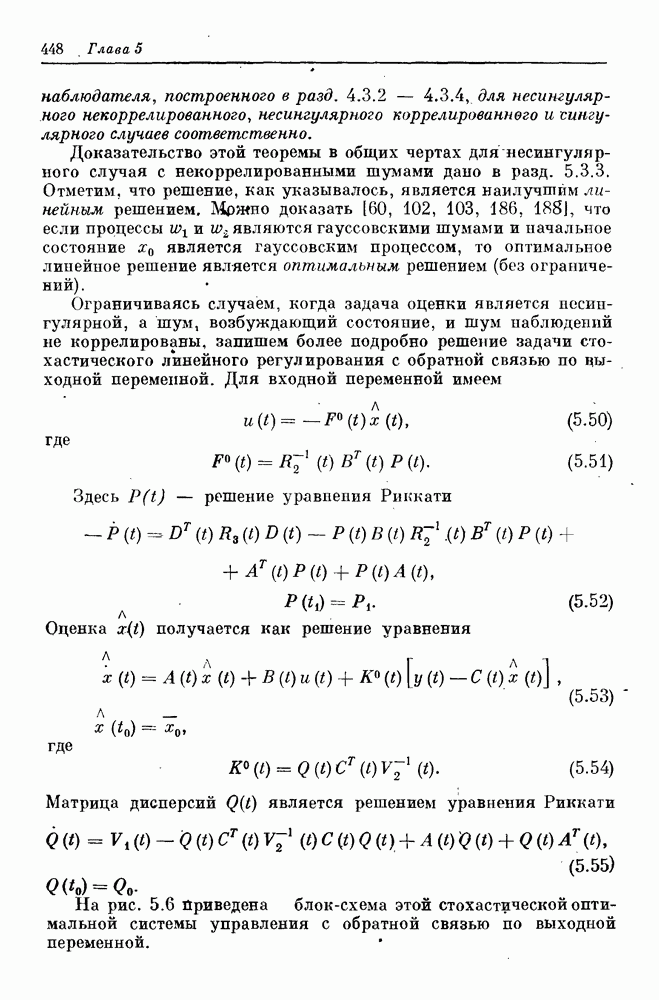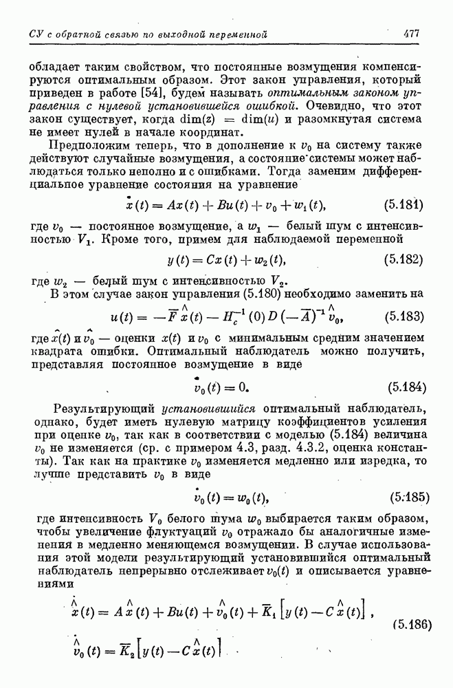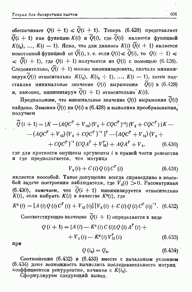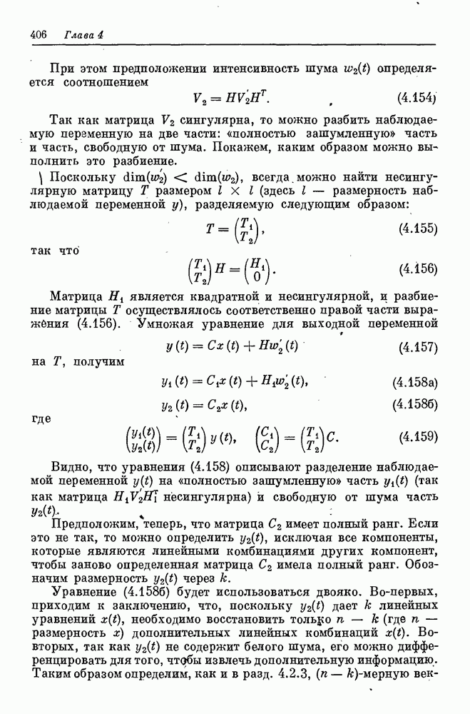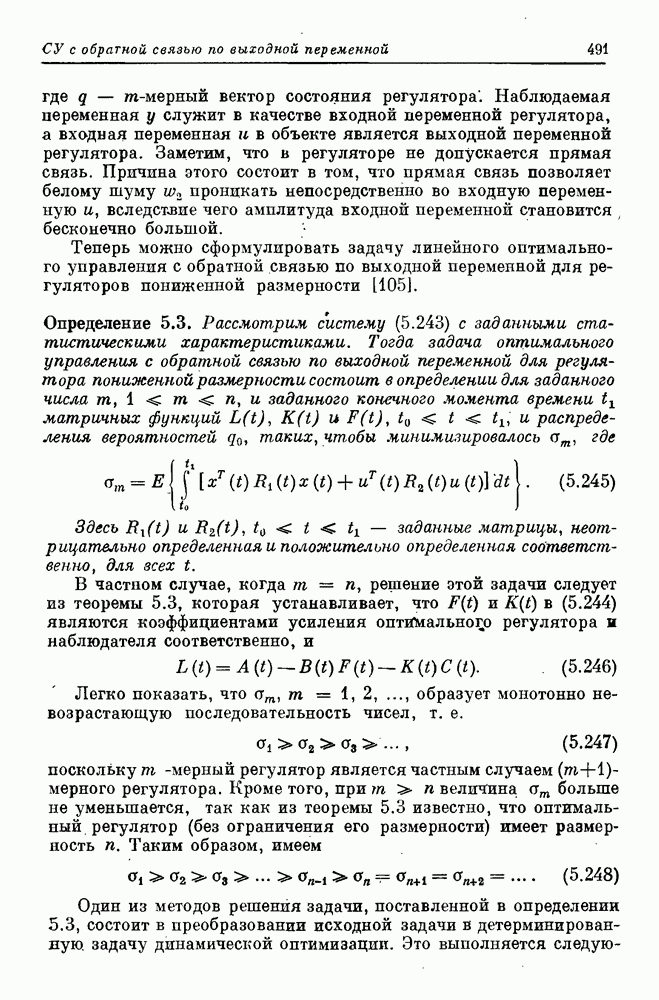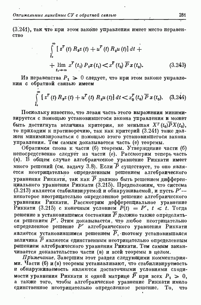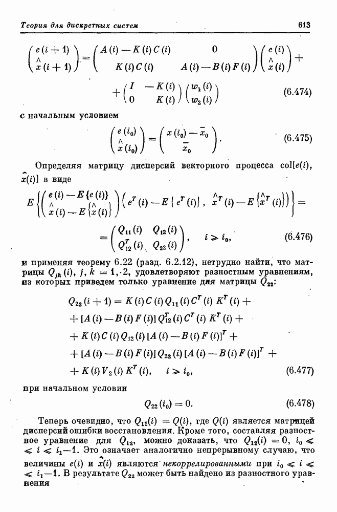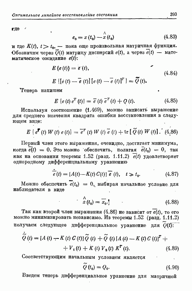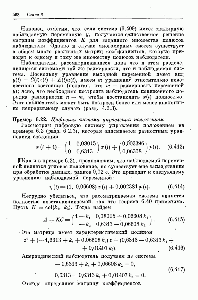по будущим значениям выходной переменной. В задачах управления и фильтрации, однако, имеются обычно только прошлые значения выходной переменной. Поэтому более естественно рассматривать восстанавливаемость, которая ставит задачу определения настоящего состояния по прошлым наблюдениям. Нетрудно обнаружить, что для систем с постоянными параметрами из полной посстанавливаемости следует полная наблюдаемость и наоборот.