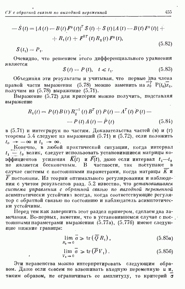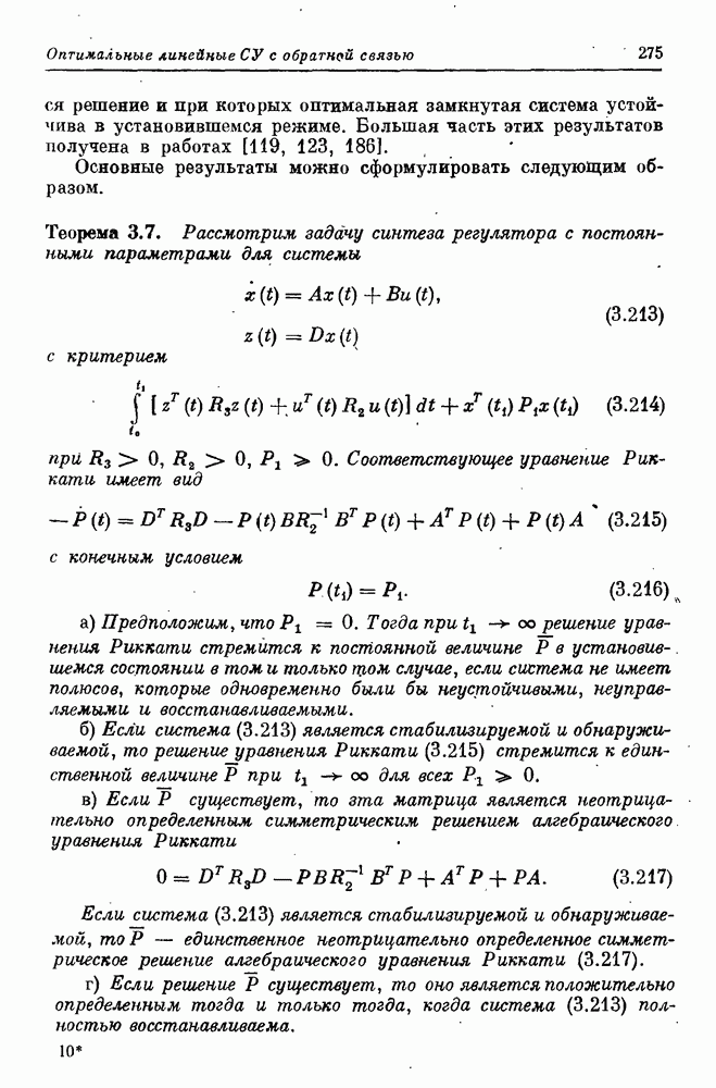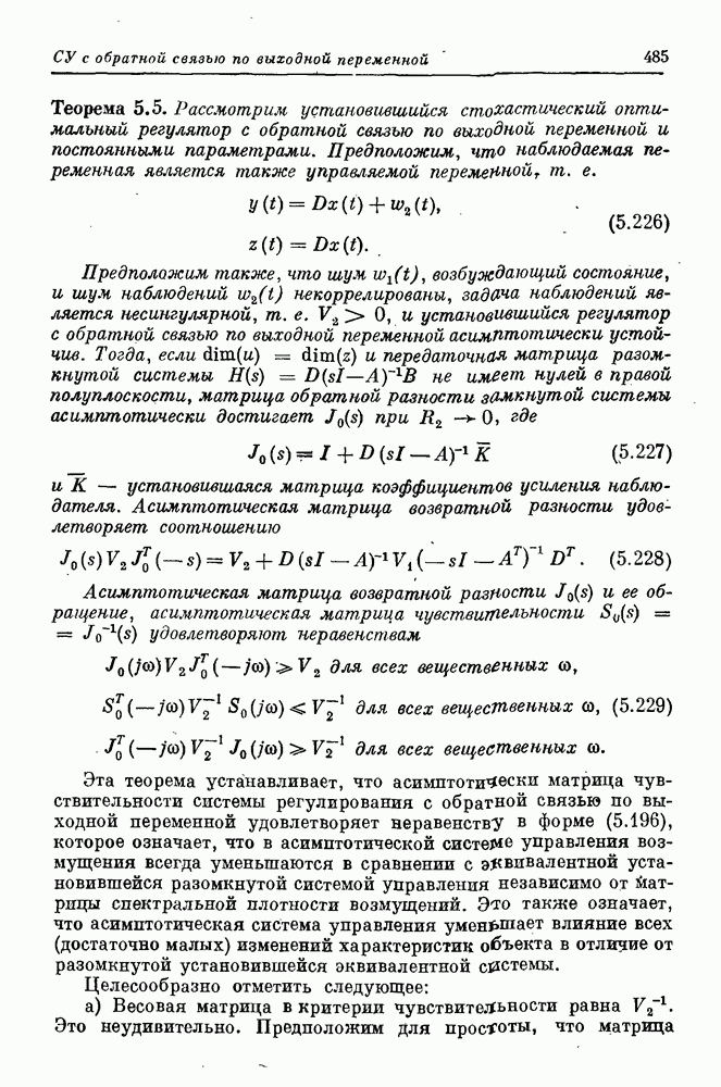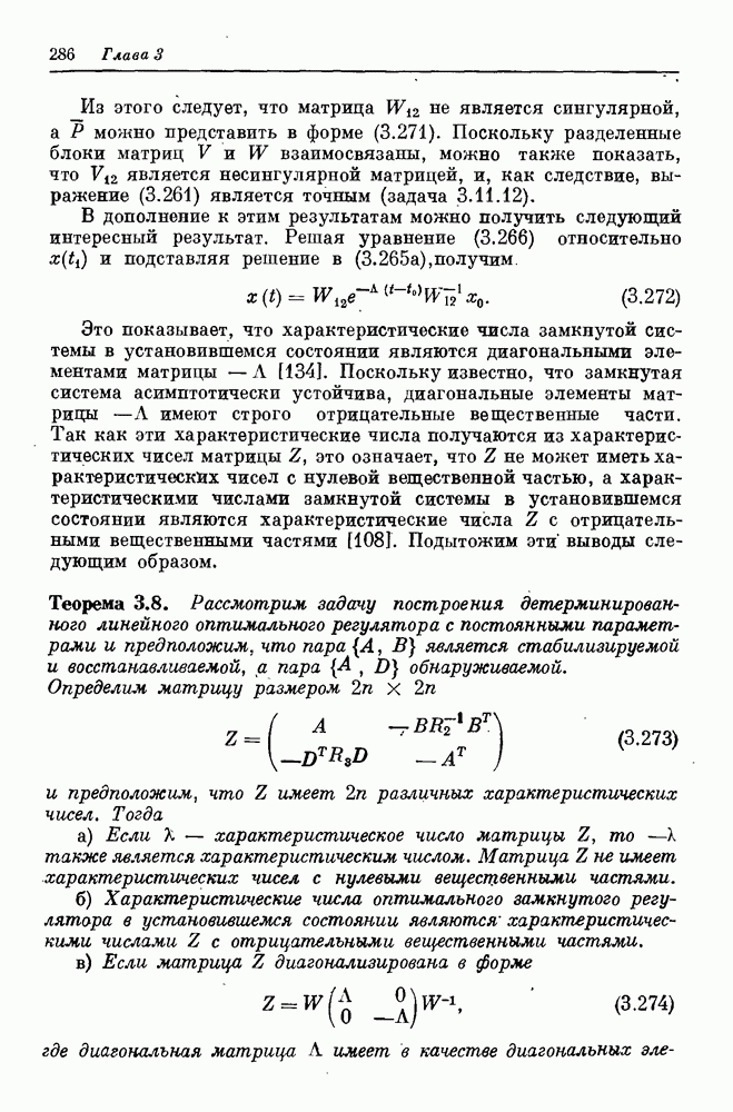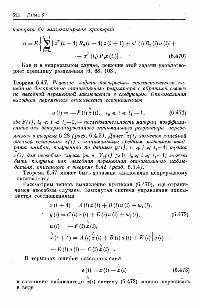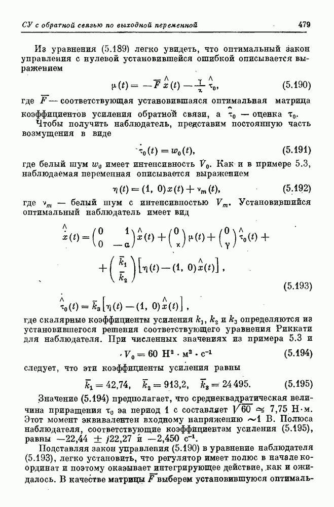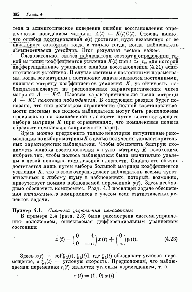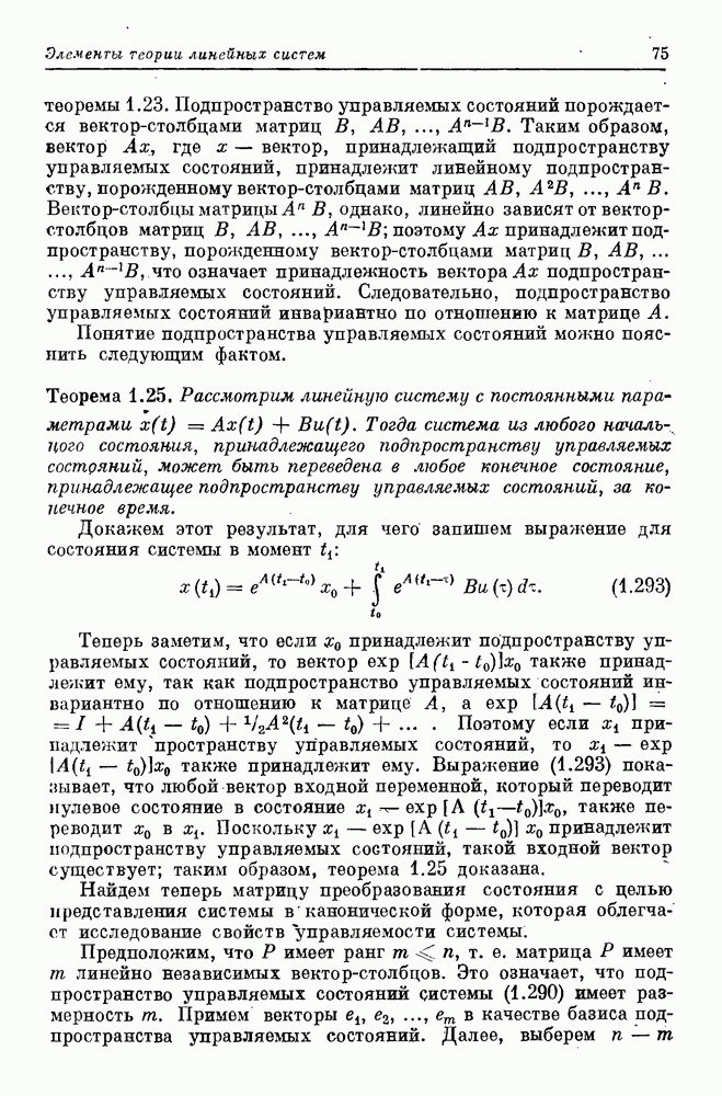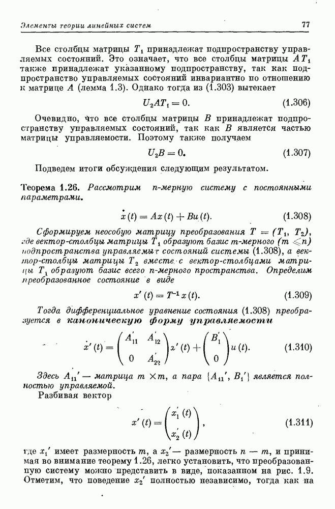 по будущим значениям выходной переменной. В задачах управления и фильтрации, однако, имеются обычно только прошлые значения выходной переменной. Поэтому более естественно рассматривать восстанавливаемость, которая ставит задачу определения настоящего состояния по прошлым наблюдениям. Нетрудно обнаружить, что для систем с постоянными параметрами из полной посстанавливаемости следует полная наблюдаемость и наоборот.