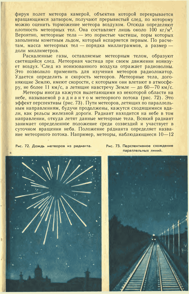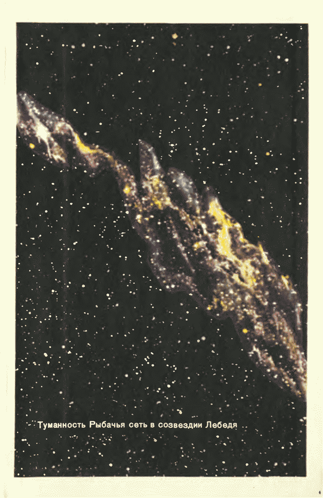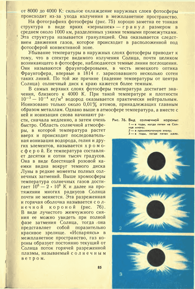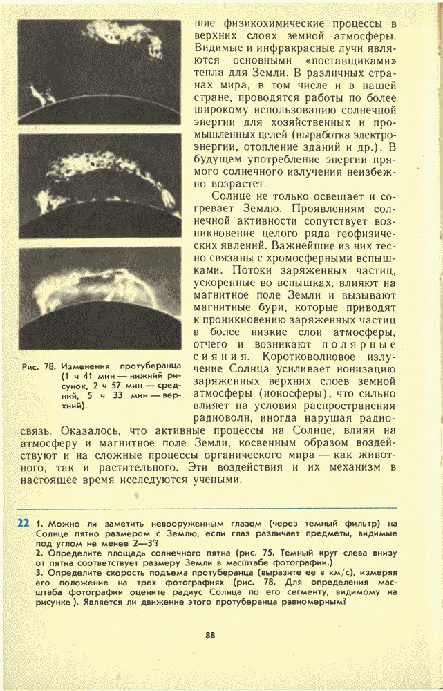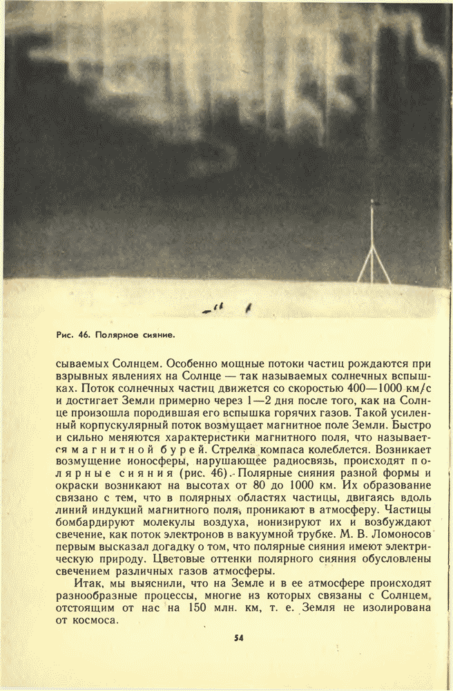 Рис. 46. Полярное сияние. Солнцем. Особенно мощные потоки частиц рождаются при взрывных явлениях на Солнце — так называемых солнечных вспышках. Поток солнечных частиц движется со скоростью 400-1000 км/с и достигает Земли примерно через 1—2 дня после того, как на Солнце произошла породившая его вспышка горячих газов. Такой усиленный корпускулярный поток возмущает магнитное поле Земли. Быстро и сильно меняются характеристики магнитного поля, что называется магнитной бурей. Стрелка компаса колеблется. Возникает возмущение ионосферы, нарушающее радиосвязь, происходят полярные сияния (рис. 46). Полярные сияния разной формы и окраски возникают на высотах от 80 до 1000 км. Их образование связано с тем, что в полярных областях частицы, двигаясь вдоль линий индукций магнитного поля, проникают в атмосферу. Частицы бомбардируют молекулы воздуха, ионизируют их и возбуждают свечение, как поток электронов в вакуумной трубке. М. В. Ломоносов первым высказал догадку о том, что полярные сияния имеют электрическую природу. Цветовые оттенки полярного сияния обусловлены свечением различных газов атмосферы. Итак, мы выяснили, что на Земле и в ее атмосфере происходят разнообразные процессы, многие из которых связаны с Солнцем, отстоящим от нас на 150 млн. км, т. е. Земля не изолирована от космоса.