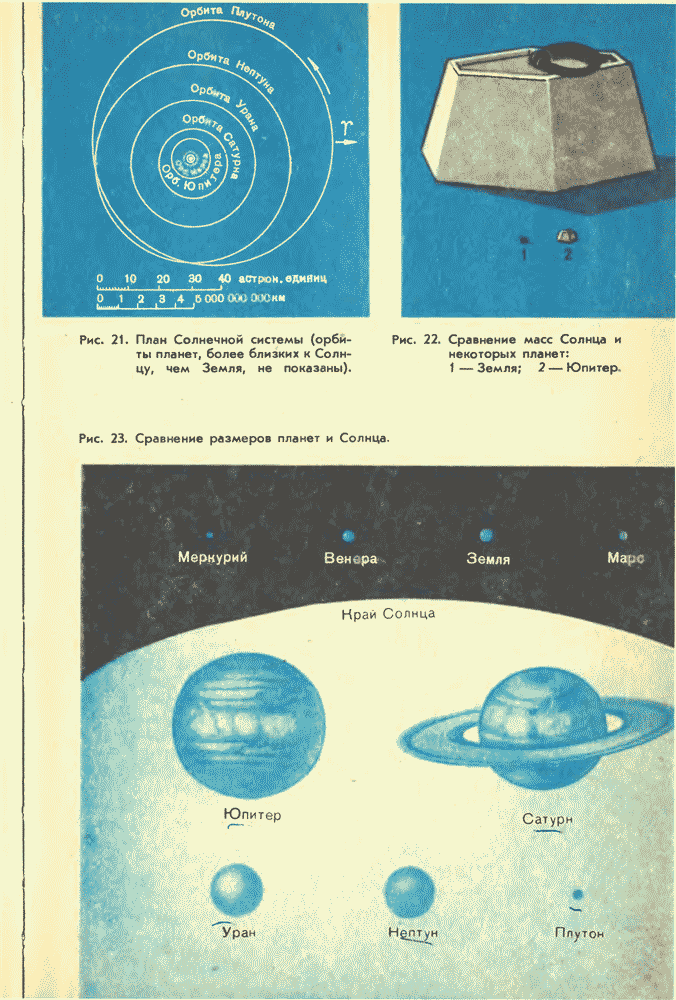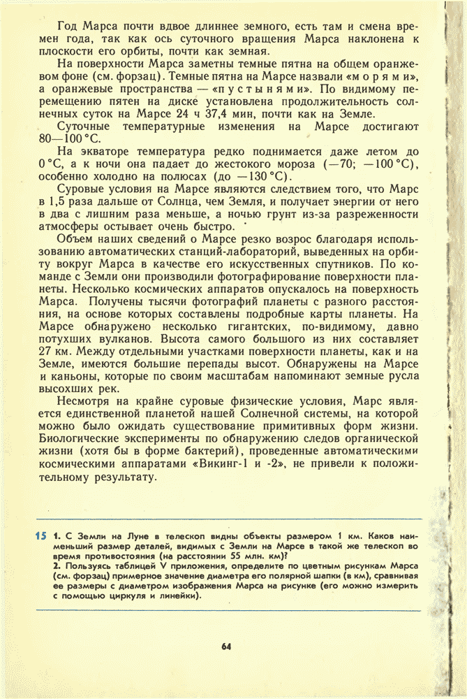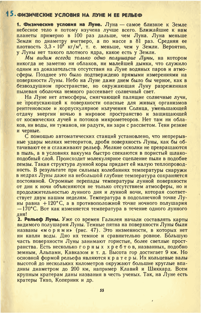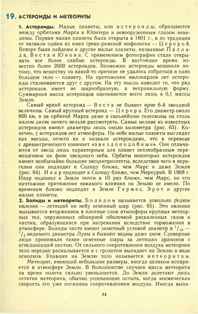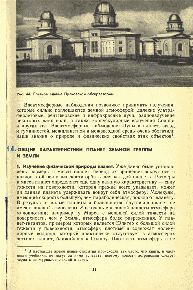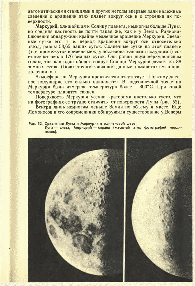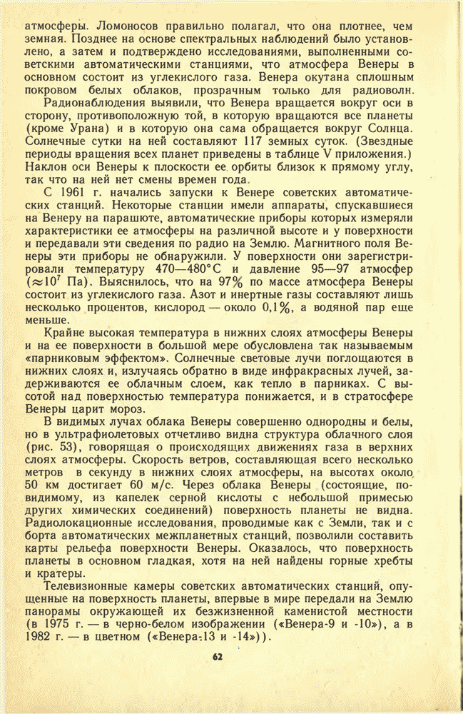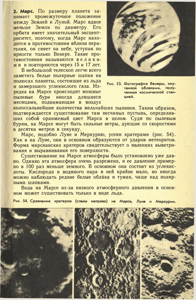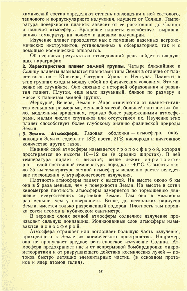 14. ОБЩИЕ ХАРАКТЕРИСТИКИ ПЛАНЕТ ЗЕМНОЙ ГРУППЫ И ЗЕМЛИ1. Изучение физической природы планет.Уже давно были установлены размеры и массы планет, период их вращения вокруг оси и наклон этой оси к плоскости орбиты для каждой планеты. Размеры и масса планет определяют еще одну важную характеристику — силу тяжести на поверхности, которая прежде всего указывает, может ли данная планета удерживать вокруг себя атмосферу. Молекулы, имеющие скорость большую, чем параболическая, покидают планету. В результате малые планеты и большинство спутников планет не имеют никакой атмосферы. У не очень массивной планеты атмосфера малоплотная; например, у Марса с меньшей силой тяжести на поверхности, чем у Земли, атмосфера более разреженная. У планет-гигантов, примером которых является Юпитер с большой силой тяжести у поверхности, атмосферы плотные и содержат молекулярный водород, который практически отсутствует в атмосферах четырех планет, ближайших к Солнцу. Плотность атмосферы и ее химический состав определяют степень поглощения в ней светового, теплового и корпускулярного излучения, идущего от Солнца. Температура поверхности планеты зависит от ее расстояния до Солнца и наличия атмосферы. Вращение планеты способствует выравниванию температур на ночном и дневном полушарии. Изучение планет проводится как с помощью наземных астрономических инструментов, установленных в обсерваториях, так и с помощью космических аппаратов. Об основных результатах исследований речь пойдет в следующих параграфах. 2. Характеристика планет земной группы.Четыре ближайшие к Солнцу планеты называются планетами типа Земли в отличие от планет-гигантов — Юпитера, Сатурна, Урана и Нептуна. Планеты в этих группах сходны между собой по физическим условиям. Это явление не случайное. Оно связано с историей образования и развития планет. Плутон, еще мало изученный, близок по размеру и массе к планетам земной группы. Меркурий, Венера, Земля и Марс отличаются от планет-гигантов меньшими размерами, меньшей массой, большей плотностью, более медленным вращением, гораздо более разреженными атмосферами, малым числом спутников или отсутствием их. Изучение этих планет способствует более глубокому знанию физической природы Земли. 3. Земля. Атмосфера.Газовая оболочка — атмосфера, окружающая Землю, содержит 18% азота, 21% кислорода и ничтожное количество других газов. Нижний слой атмосферы называется тропосферой, которая простирается до высоты 10—12 км (в средних широтах). В ней температура падает с высотой; выше лежит стратосфера — слой постоянной температуры порядка —40° С. С высоты около 25 км температура земной атмосферы медленно растет вследствие поглощения ультрафиолетового излучения. Плотность атмосферы падает с высотой. На высоте около 6 км она в 2 раза меньше, чем у поверхности Земли. На высоте в сотни километров плотность атмосферы измеряется по торможению движения искусственных спутников Земли. Там она в миллионы раз меньше, чем у поверхности. Выше, до нескольких радиусов Земли, имеется только разреженный водород. Плотность там порядка сотен атомов в кубическом сантиметре. В верхних слоях земной атмосферы солнечное излучение производит сильную ионизацию. Ионизованные слои атмосферы называются ионосферой. Атмосфера отражает или поглощает большую часть излучения, прих