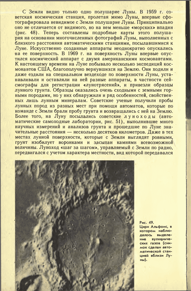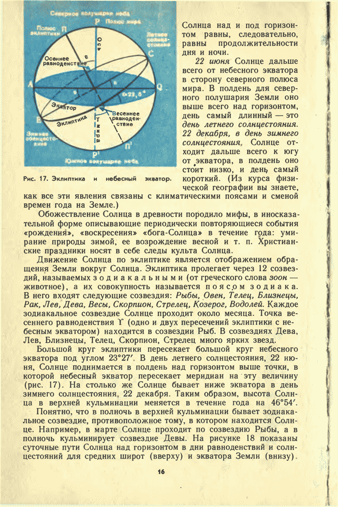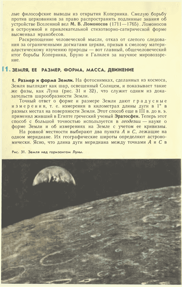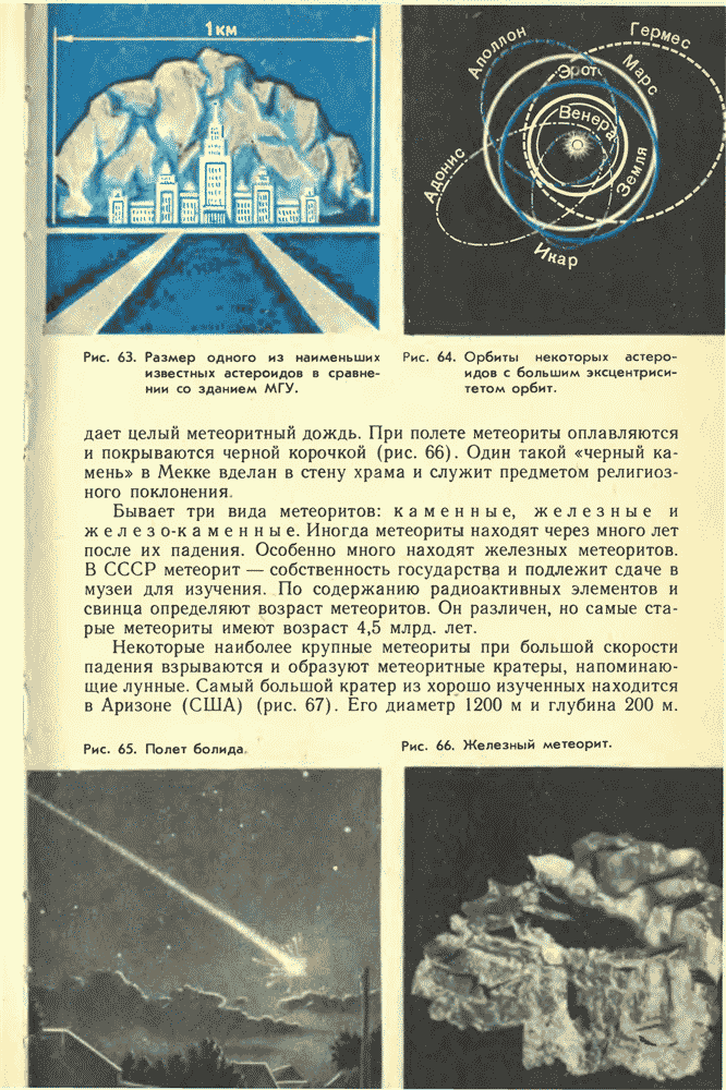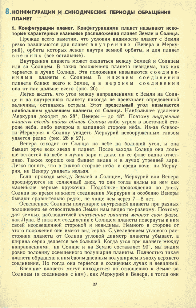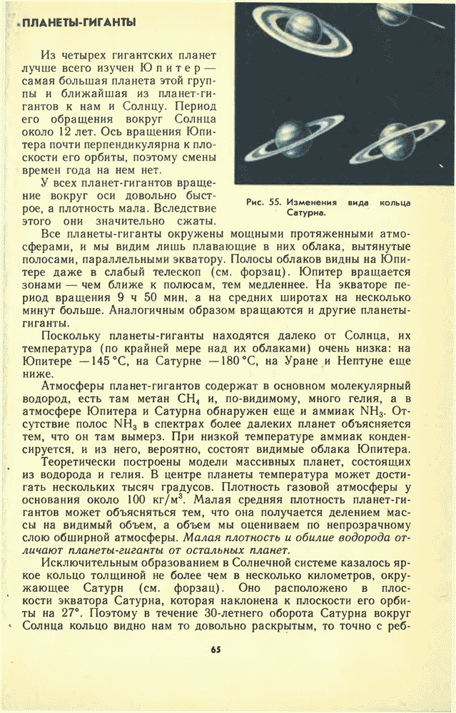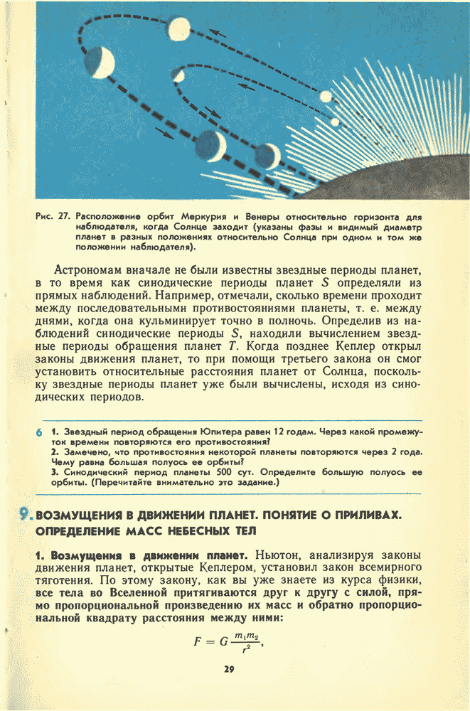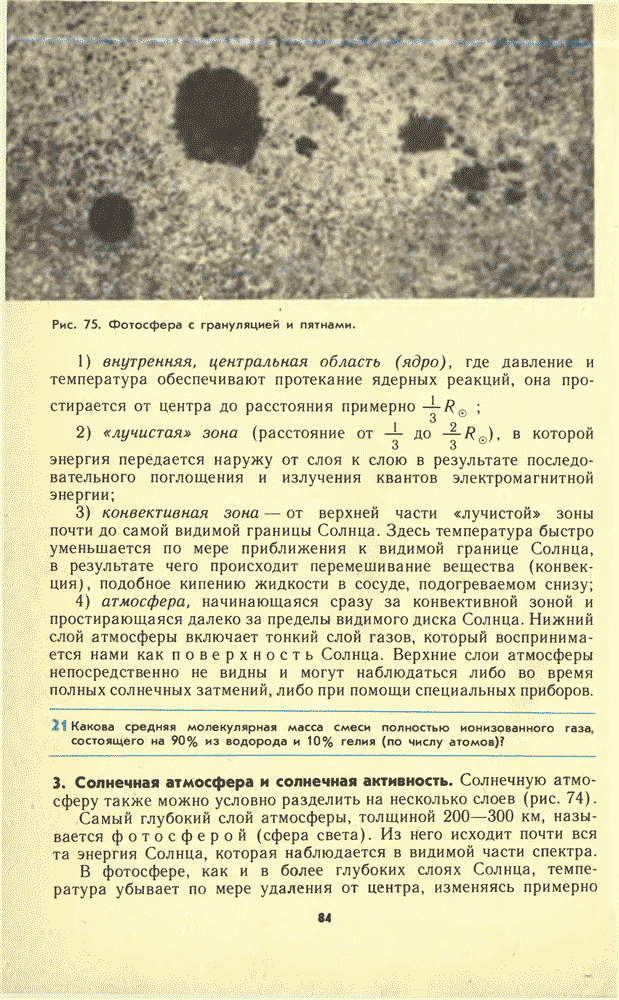 14. ОБЩИЕ ХАРАКТЕРИСТИКИ ПЛАНЕТ ЗЕМНОЙ ГРУППЫ И ЗЕМЛИ1. Изучение физической природы планет.Уже давно были установлены размеры и массы планет, период их вращения вокруг оси и наклон этой оси к плоскости орбиты для каждой планеты. Размеры и масса планет определяют еще одну важную характеристику — силу тяжести на поверхности, которая прежде всего указывает, может ли данная планета удерживать вокруг себя атмосферу. Молекулы, имеющие скорость большую, чем параболическая, покидают планету. В результате малые планеты и большинство спутников планет не имеют никакой атмосферы. У не очень массивной планеты атмосфера малоплотная; например, у Марса с меньшей силой тяжести на поверхности, чем у Земли, атмосфера более разреженная. У планет-гигантов, примером которых является Юпитер с большой силой тяжести у поверхности, атмосферы плотные и содержат молекулярный водород, который практически отсутствует в атмосферах четырех планет, ближайших к Солнцу. Плотность атмосферы и ее химический состав определяют степень поглощения в ней светового, теплового и корпускулярного излучения, идущего от Солнца. Температура поверхности планеты зависит от ее расстояния до Солнца и наличия атмосферы. Вращение планеты способствует выравниванию температур на ночном и дневном полушарии. Изучение планет проводится как с помощью наземных астрономических инструментов, установленных в обсерваториях, так и с помощью космических аппаратов. Об основных результатах исследований речь пойдет в следующих параграфах. 2. Характеристика планет земной группы.Четыре ближайшие к Солнцу планеты называются планетами типа Земли в отличие от планет-гигантов — Юпитера, Сатурна, Урана и Нептуна. Планеты в этих группах сходны между собой по физическим условиям. Это явление не случайное. Оно связано с историей образования и развития планет. Плутон, еще мало изученный, близок по размеру и массе к планетам земной группы. Меркурий, Венера, Земля и Марс отличаются от планет-гигантов меньшими размерами, меньшей массой, большей плотностью, более медленным вращением, гораздо более разреженными атмосферами, малым числом спутников или отсутствием их. Изучение этих планет способствует более глубокому знанию физической природы Земли. 3. Земля. Атмосфера.Газовая оболочка — атмосфера, окружающая Землю, содержит 18% азота, 21% кислорода и ничтожное количество других газов. Нижний слой атмосферы называется тропосферой, которая простирается до высоты 10—12 км (в средних широтах). В ней температура падает с высотой; выше лежит стратосфера — слой постоянной температуры порядка —40° С. С высоты около 25 км температура земной атмосферы медленно растет вследствие поглощения ультрафиолетового излучения. Плотность атмосферы падает с высотой. На высоте около 6 км она в 2 раза меньше, чем у поверхности Земли. На высоте в сотни километров плотность атмосферы измеряется по торможению движения искусственных спутников Земли. Там она в миллионы раз меньше, чем у поверхности. Выше, до нескольких радиусов Земли, имеется только разреженный водород. Плотность там порядка сотен атомов в кубическом сантиметре. В верхних слоях земной атмосферы солнечное излучение производит сильную ионизацию. Ионизованные слои атмосферы называются ионосферой. Атмосфера отражает или поглощает большую часть излучения, прих