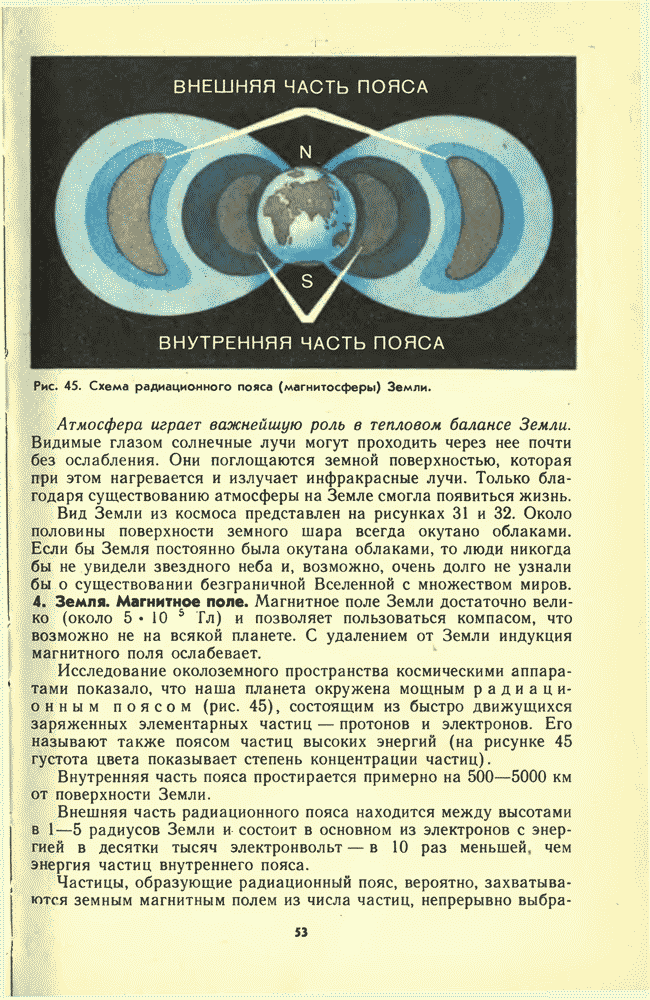 Рис. 45. Схема радиационного пояса (магнитосферы) Земли. Атмосфера играет важнейшую роль в тепловом балансе Земли. Видимые глазом солнечные лучи могут проходить через нее почти без ослабления. Они поглощаются земной поверхностью, которая при этом нагревается и излучает инфракрасные лучи. Только благодаря существованию атмосферы на Земле смогла появиться жизнь. Вид Земли из космоса представлен на рисунках 31 и 32. Около половины поверхности земного шара всегда окутано облаками. Если бы Земля постоянно была окутана облаками, то люди никогда бы не увидели звездного неба и, возможно, очень долго не узнали бы о существовании безграничной Вселенной с множеством миров. 4. Земля. Магнитное поле.Магнитное поле Земли достаточно велико (около Исследование околоземного пространства космическими аппаратами показало, что наша планета окружена мощным радиационным поясом (рис. 45), состоящим из быстро движущихся заряженных элементарных частиц — протонов и электронов. Его называют также поясом частиц высоких энергий (на рисунке 45 густота цвета показывает степень концентрации частиц). Внутренняя часть пояса простирается примерно на 500—5000 км от поверхности Земли. Внешняя часть радиационного пояса находится между высотами в 1—5 радиусов Земли и состоит в основном из электронов с энергией в десятки тысяч электронвольт — в 10 раз меньшей, чем энергия частиц внутреннего пояса. Частицы, образующие радиационный пояс, вероятно, захватываются земным магнитным полем из числа частиц, непрерывно выбрасываемых