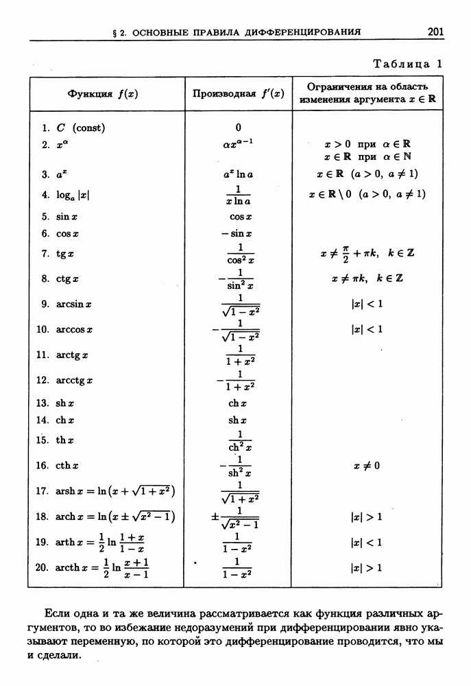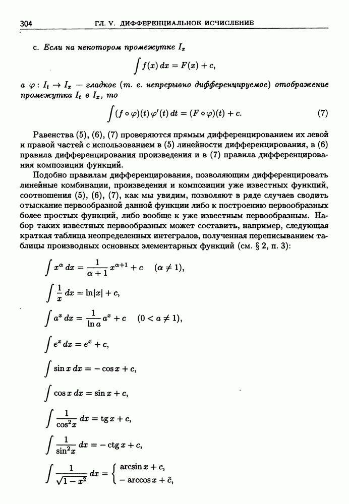 Равенства (5), (6), (7) проверяются прямым дифференцированием их левой и правой частей с использованием в (5) линейности дифференцирования, в (6) правила дифференцирования произведения и в (7) правила дифференцирования композиции функций. Подобно правилам дифференцирования, позволяющим дифференцировать линейные комбинации, произведения и композиции уже известных функций, соотношения (5), (6), (7), как мы увидим, позволяют в ряде случаев сводить отыскание первообразной данной функции либо к построению первообразных более простых функций, либо вообще к уже известным первообразным. Набор таких известных первообразных может составить, например, следующая краткая таблица неопределенных интегралов, полученная переписыванием таблицы производных основных элементарных функций (см. § 2, п. 3):