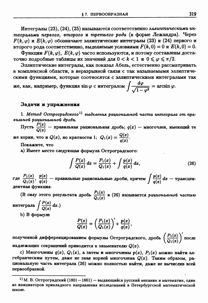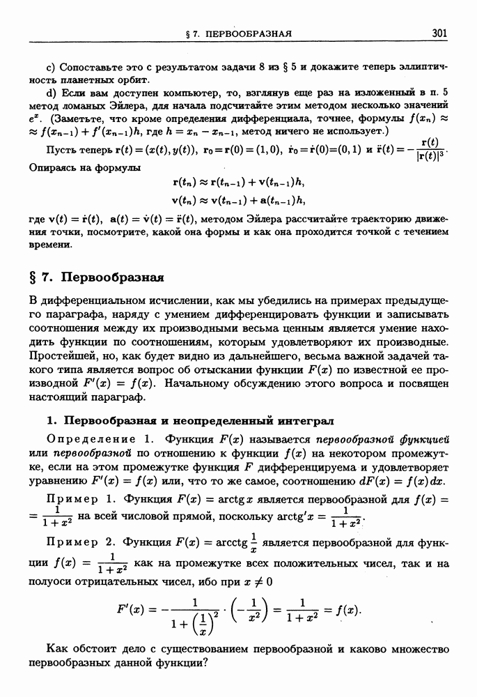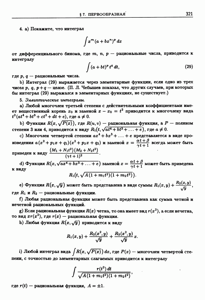 Уже этот небольшой набор разобранных примеров показывает, что при отыскании первообразных даже элементарных функций часто приходится прибегать к дополнительным преобразованиям и ухищрениям, чего совсем не было при отыскании производных композиции тех функций, производные которых нам были известны. Оказывается, это не случайная трудность. Например, в отличие от дифференцирования, переход к первообразной элементарной функции может привести к функции, которая уже не является композицией элементарных. Поэтому не следует отождествлять фразу «найти первообразную» с невыполнимым порой заданием «выразить первообразную данной элементарной функции через элементарные функции». Вообще, класс элементарных функций — вещь очень условная. Имеется еще много важных для приложений специальных функций, которые изучены и затабулированы ничуть не хуже, чем, скажем, Аналогично, функция