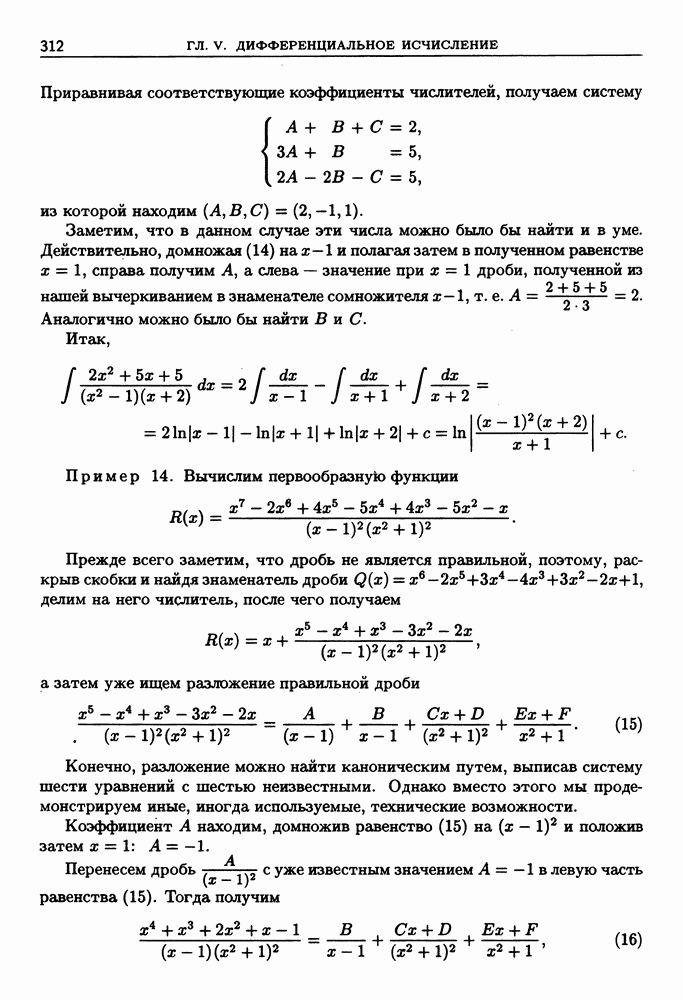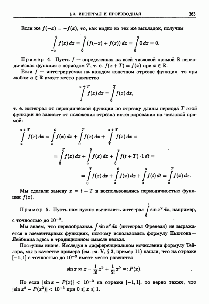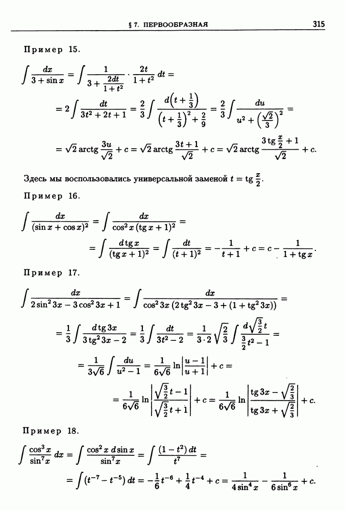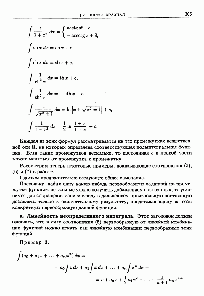 Каждая из этих формул рассматривается на тех промежутках вещественной оси Рассмотрим теперь некоторые примеры, показывающие соотношения (5), (6) и (7) в работе. Сделаем предварительно следующее общее замечание. Поскольку, найдя одну какую-нибудь первообразную заданной на промежутке функции, остальные можно получить добавлением постоянных, то условимся для сокращения записи всюду в дальнейшем произвольную постоянную добавлять только к окончательному результату, представляющему из себя конкретную первообразную данной функции. а. Линейность неопределенного интеграла.Этот заголовок должен означать, что в силу соотношения (5) первообразную от линейной комбинации функций можно искать как линейную комбинацию первообразных этих функций. Пример 3.