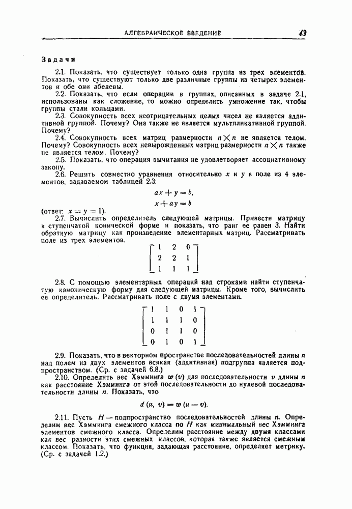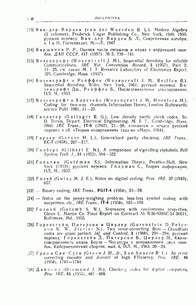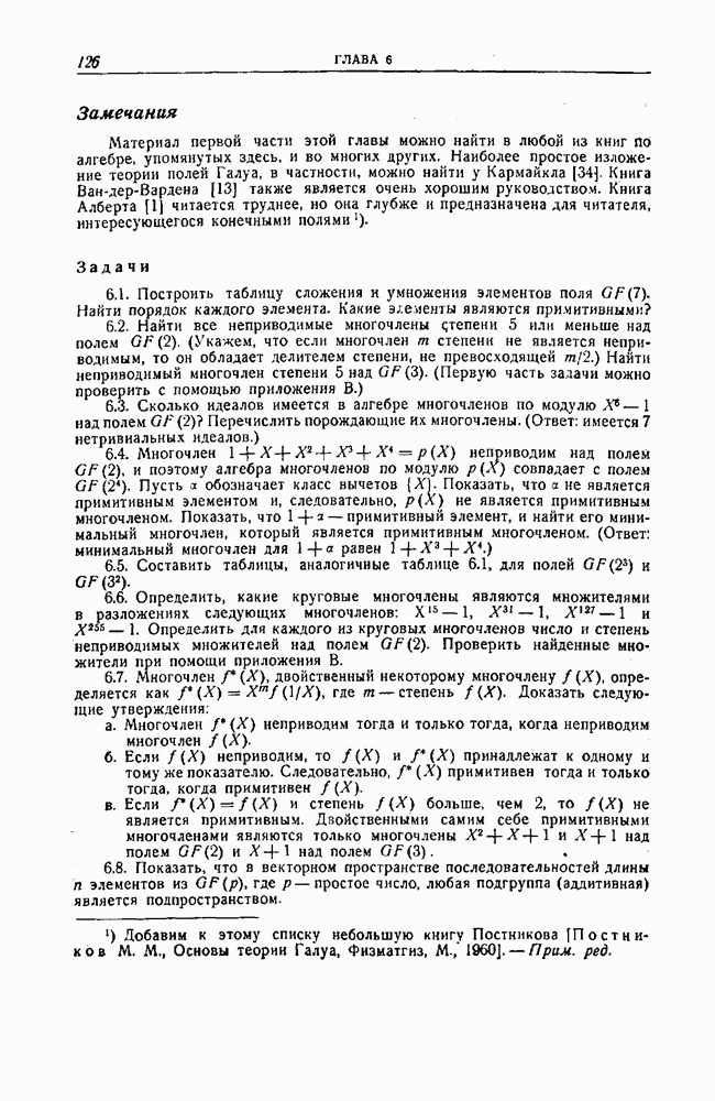 Материал первой части этой главы можно найти в любой из книг По алгебре, упомянутых здесь, и во многих других. Наиболее простое изложение теории полей Галуа, в частности, можно найти у Кармайкла [34]. Книга Ван-дер-Вардена [13] также является очень хорошим руководством. Книга Алберта [1] читается труднее, но она глубже и предназначена для читателя, интересующегося конечными полями.