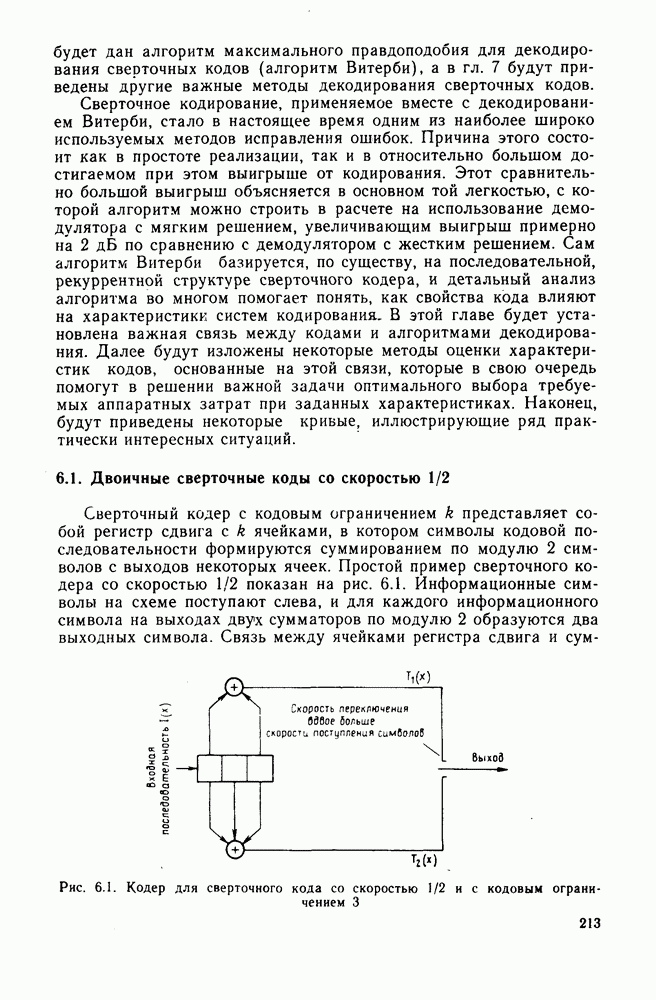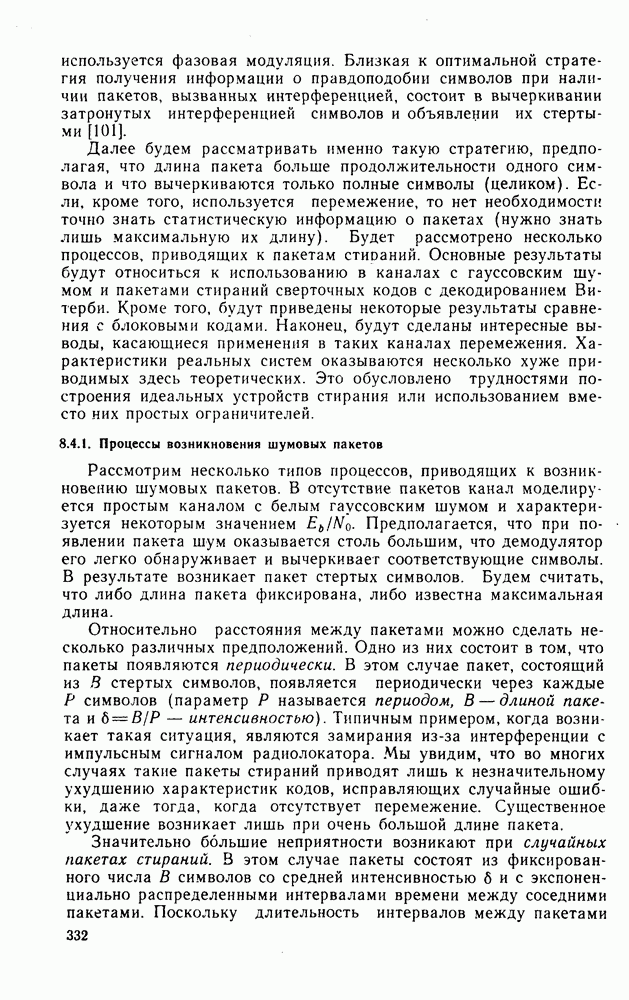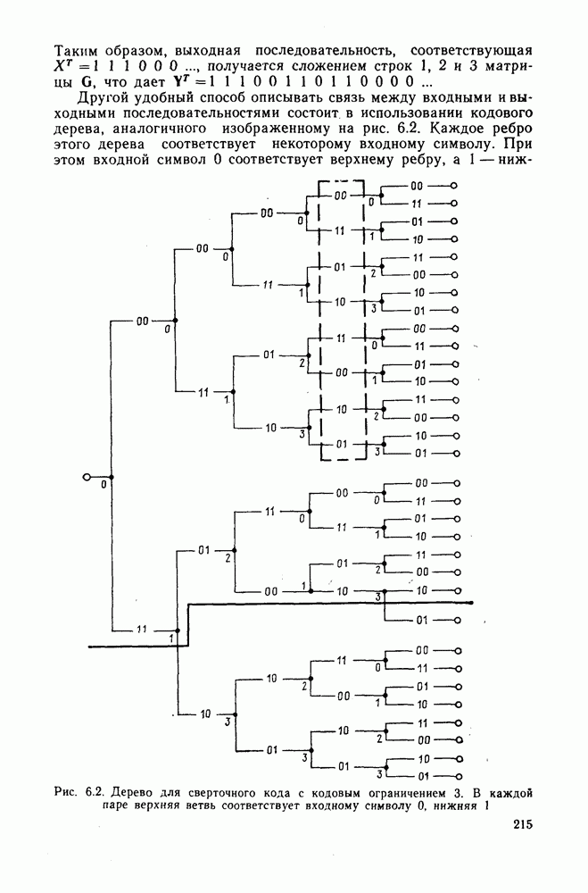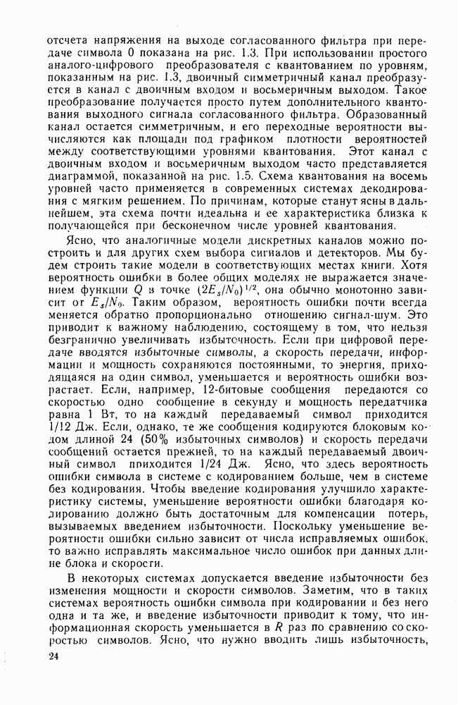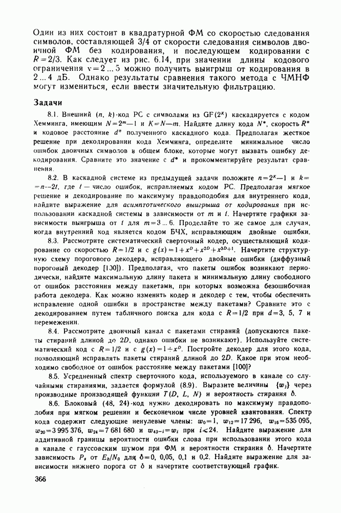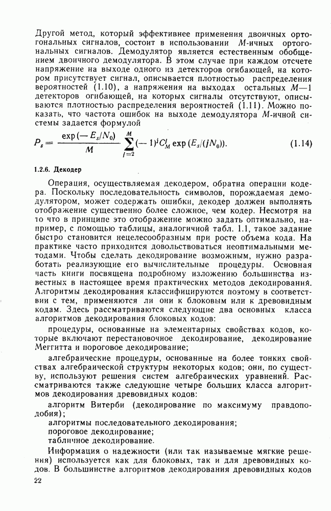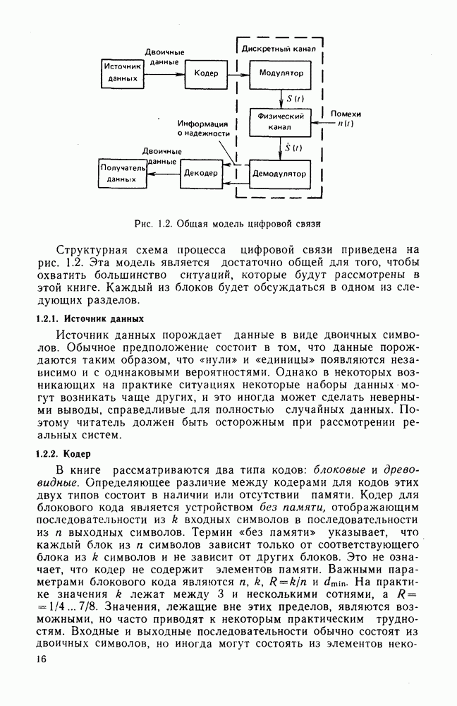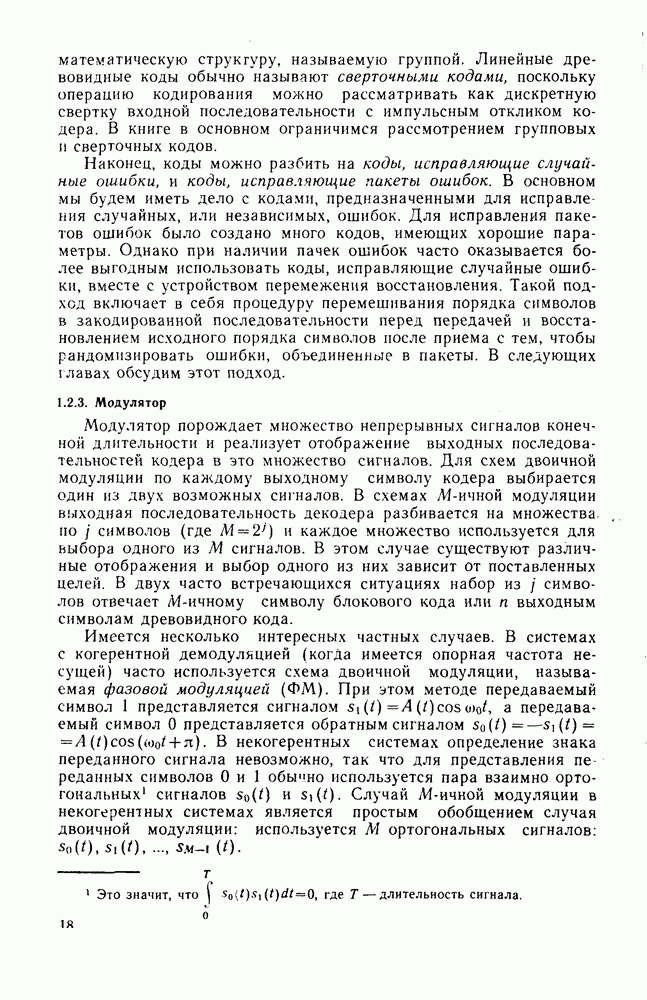 Модулятор порождает множество непрерывных сигналов конечной длительности и реализует отображение выходных последовательностей кодера в это множество сигналов. Для схем двоичной модуляции по каждому выходному символу кодера выбирается один из двух возможных сигналов. В схемах -ичной модуляции выходная последовательность декодера разбивается на множества, но символов (где и каждое множество используется для выбора одного из сигналов. В этом случае существуют различные отображения и выбор одного из них зависит от поставленных целей. В двух часто встречающихся ситуациях набор из символов отвечает -ичному символу блокового кода или выходным символам древовидного кода.