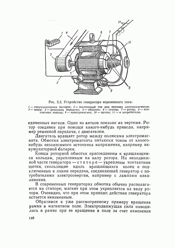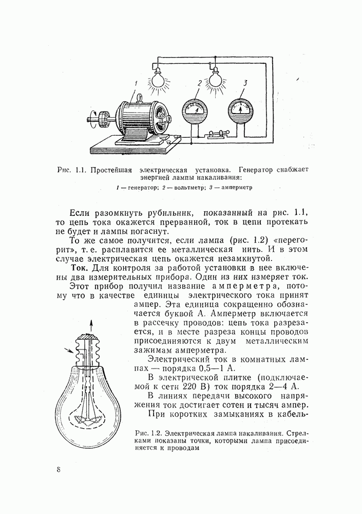 Рис. 11.8. Расслаивая сердечник на изолированные друг от друга стальные листы, мы уменьшаем потери от вихревых токов: 1 — сердечник; 2 — обмотка; 3 — пути вихревых токов Сопоставим теперь два фактора: во-первых, сталь является проводником электрического тока и, во-вторых, в стали существует переменный магнитный поток. На первый взгляд, между ними нельзя установить никакой связи, но, подумав, мы убедимся, что это не так, что следствием этих факторов будет появление электрического тока в стали. Всякое изменение магнитного потока внутри какого-нибудь замкнутого контура индуктирует в нем напряжение. Если этим замкнутым контуром является проводниковая цепь, то в ней появится ток. Что же будет происходить в контуре, показанном пунктирной линией на рис. 11.7? Чертеж представляет сердечник трансформатора. Обмотка снята с него, чтобы не усложнять чертежа. Чтобы мы имели возможность заглянуть «внутрь» стали, сплошной магнитопровод показан разрезанным. Линии переменного магнитного потока замыкаются внутри стали. Часть линий пронизывает наш контур. Налицо изменение магнитного потока в контуре, а следовательно, и индуктированное напряжение. А так как сталь является проводником, то в ней должны протекать электрические токи. Здесь несомненная трудность для начинающего. Трудность эта объясняется тем, что в нас глубоко сидит привычка представлять себе электрические токи идущими лишь по тонким длинным проводникам. Верно, что электрик старается направлять путь тока Попытаемся обратиться к нашим привычным представлениям. Вообразим, что сердечник сделан из какого-то материала, который, с одной стороны, обладает такой же магнитной проницаемостью, как и сталь, а с другой, не проводит тока, т. е. является диэлектриком. Далее, предположим, что показанный на чертеже контур представляет собой уложенный в сердечник виток стальной проволоки. Тогда наша схема мало чем будет отличаться от схемы трансформатора, а наш виток — от вторичной обмотки, работающей в условиях короткого замыкания. Единственное различие состоит в том, что вторичная обмотка трансформатора пронизывается не полным магнитным потоком сердечника, а какой-то его частью. Это обстоятельство лишь снизит величину индуктированного в витке напряжения. При сделанных нами предположениях появление тока в витке, а также его направление не могут вызвать никаких сомнений. Понятным является и допущенное на чертеже кажущееся отступление от правила штопора. Вспомним, что магнитный поток сердечника создан током первичной, а не вторичной обмотки и что правилом штопора следует пользоваться для определения направлений магнитного потока и первичного тока. Но мы знаем, что направления токов в первичной и вторичной обмотках противоположны друг другу. Чтобы перейти от рассмотренной картины к действительной, нам надо лишь представить себе, что проводящей является не часть стального сердечника, не один мысленно выделенный из его объема виток, а весь сердечник. Следовательно, токи будут протекать по всей толще сердечника, охватывая линии магнитного потока. Эти токи называют вихревыми. Разумеется, они будут переменными. Протекание тока по проводнику неизбежно связано с потерями. Вихревые токи будут нагревать сердечник. Это не только означает лишнюю затрату мощности, но и представляет опасность для изо