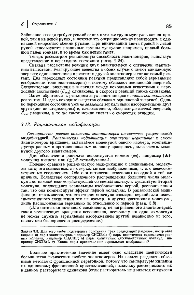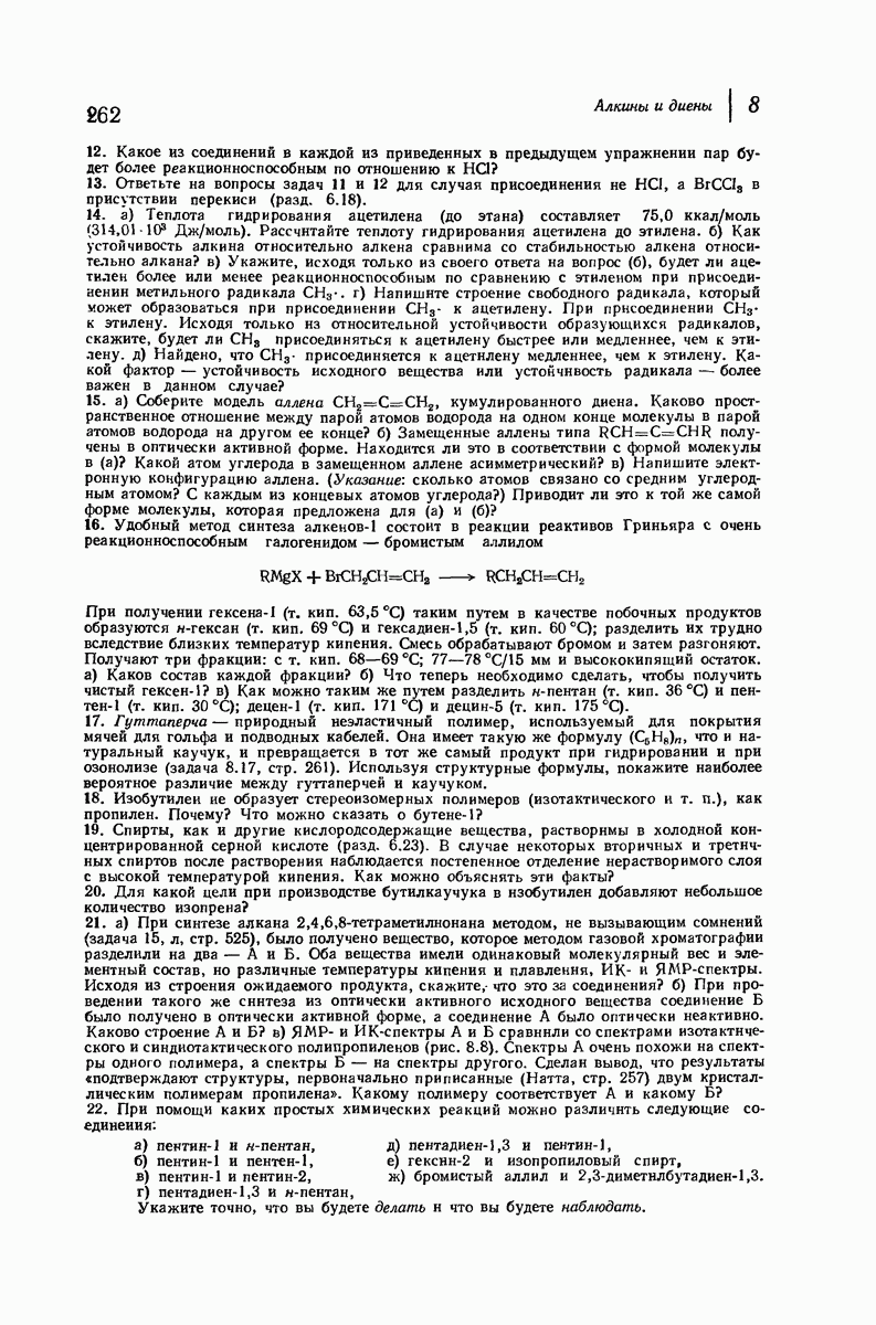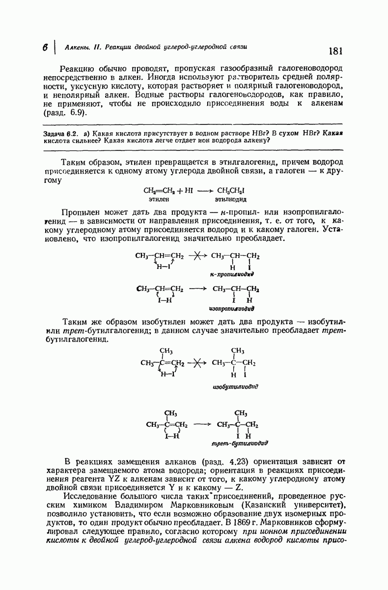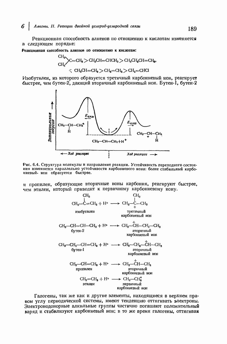 Изучение кинетики этой реакции показывает, что скорость галогенирования не зависит от концентрации галогена, но зависит от концентрации кетона и (для данного случая) от концентрации кислоты. В этом случае мы также наблюдаем очень примечательный факт идентичности констант скоростей внешне очень различных реакций: бромирования и иодирования ацетона и обмена его атомов водорода на дейтерий; иодирования и рацемизации