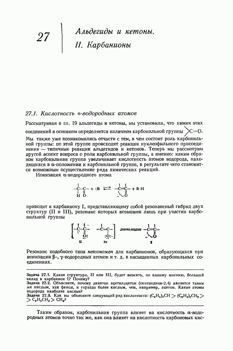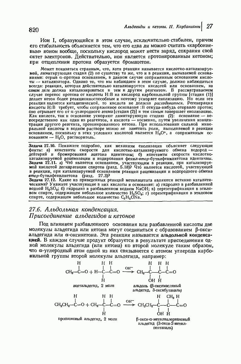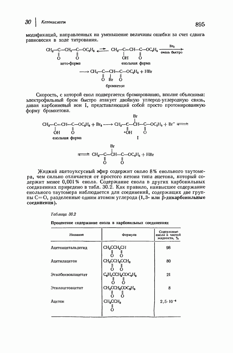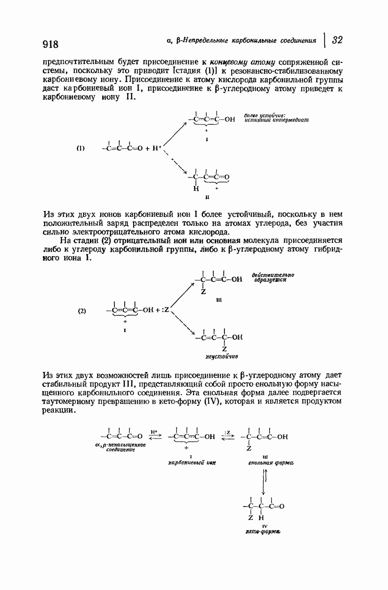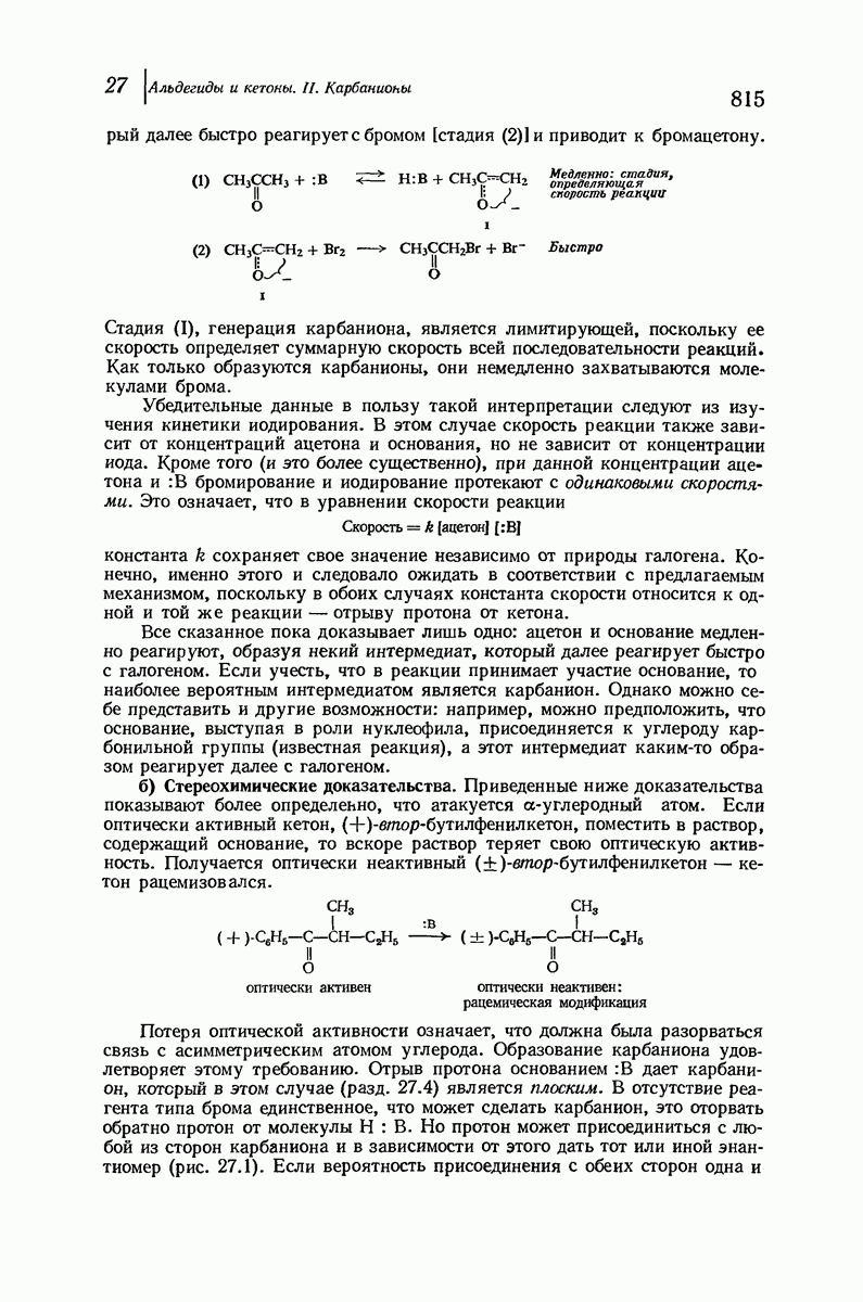 -углеродного атома [стадия (2)] и тем самым завершает енолизацию. Как кислота, так и основание ускоряют лимитирующую стадию (2): основание — непосредственно как один из реагентов, а кислота — косвенно, путем увеличения концентрации другого реагента, протонированного кетона. При использовании сильной минеральной кислоты в водном растворе можно не заметить роли, выполняемой в реакции основанием, поскольку в этих условиях кислотой является