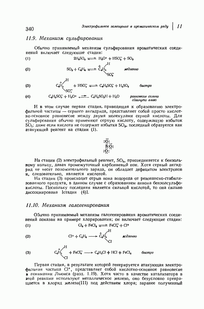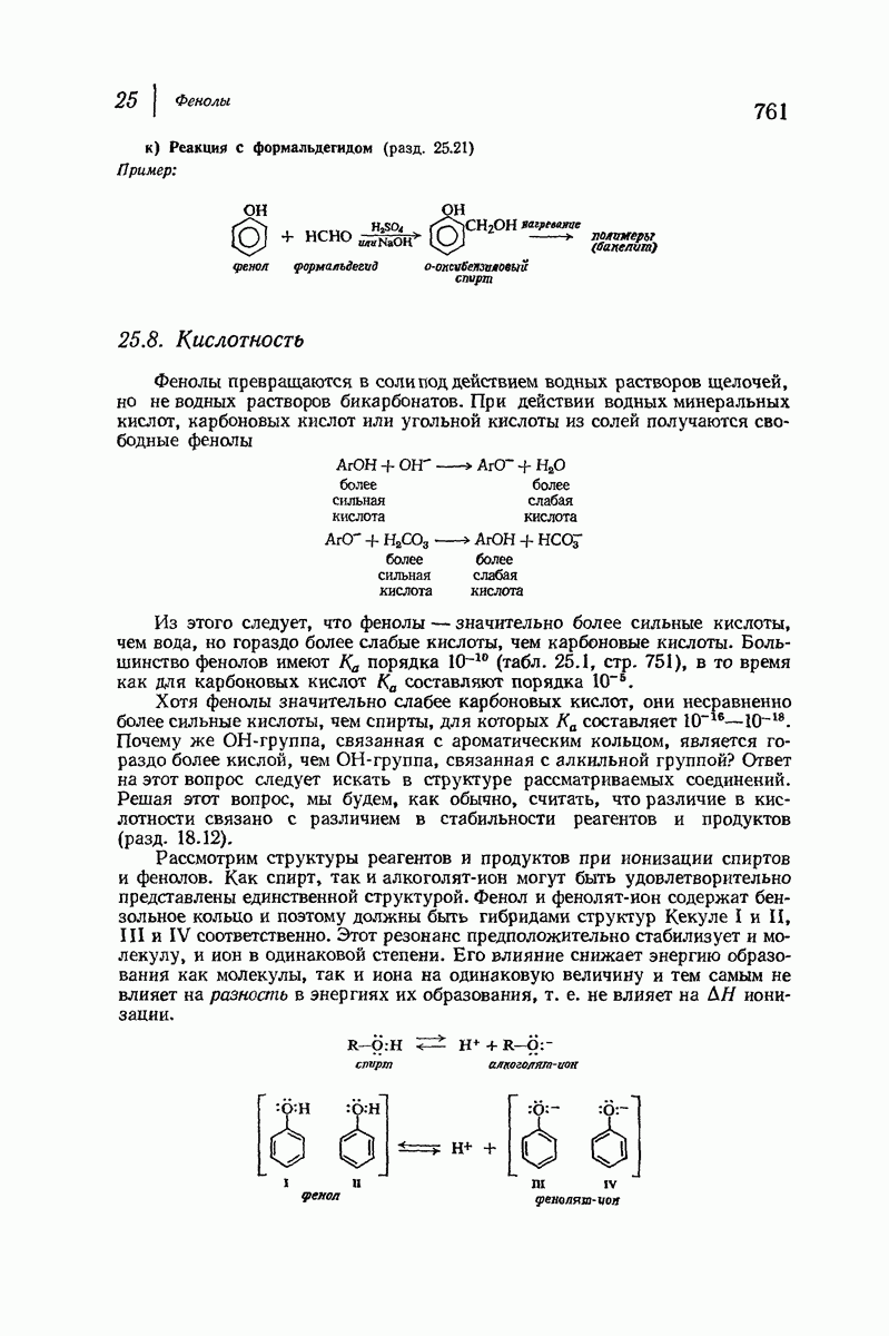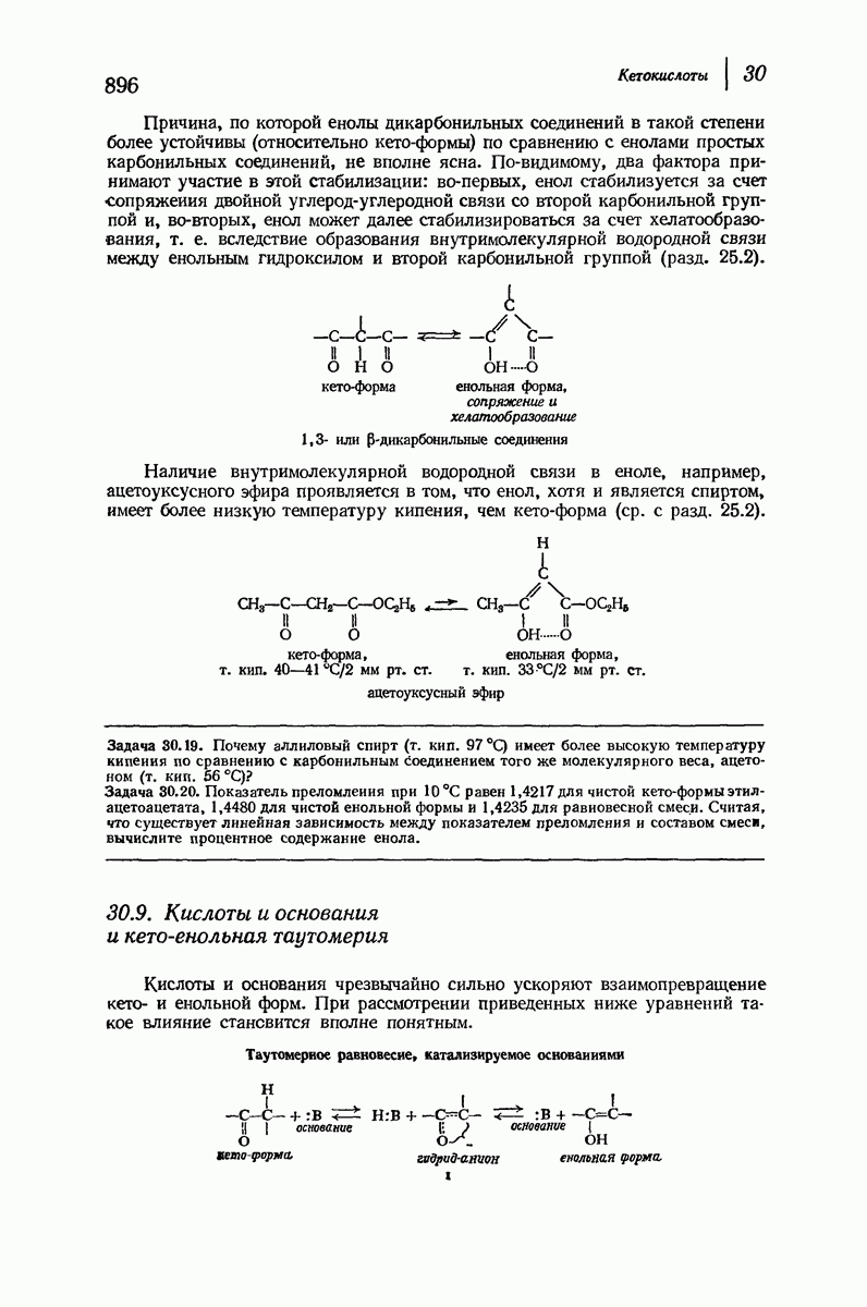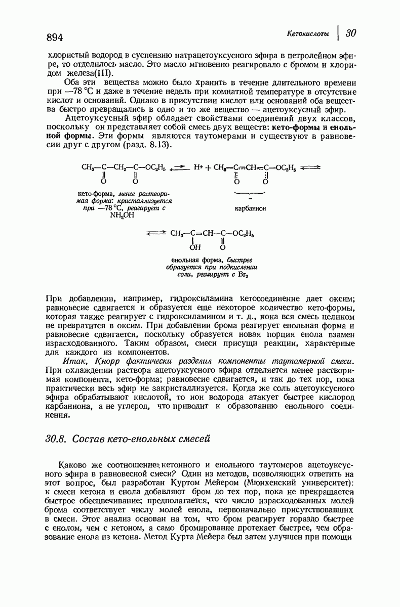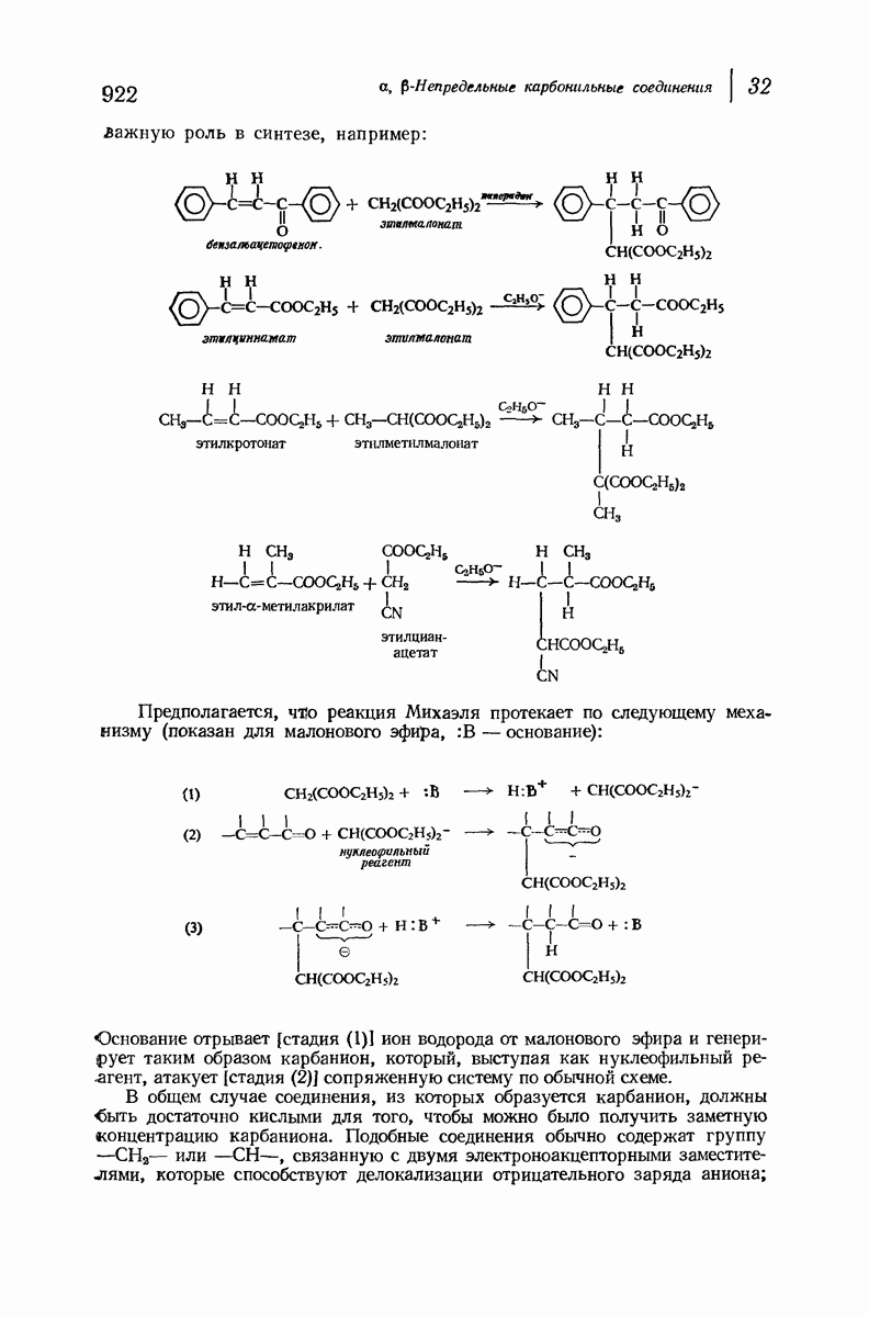 -углеродного атома [стадия (2)] и тем самым завершает енолизацию. Как кислота, так и основание ускоряют лимитирующую стадию (2): основание — непосредственно как один из реагентов, а кислота — косвенно, путем увеличения концентрации другого реагента, протонированного кетона. При использовании сильной минеральной кислоты в водном растворе можно не заметить роли, выполняемой в реакции основанием, поскольку в этих условиях кислотой является