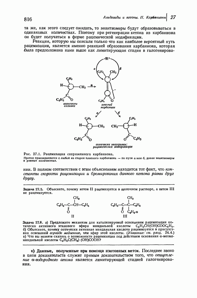Интерпретация в этом случае в основном не отличается от описанной ранее: стадии присоединения галогена предшествует лимитирующая стадия, которая может привести не только к галогенированию, но также к рацемизации и обмену водорода.