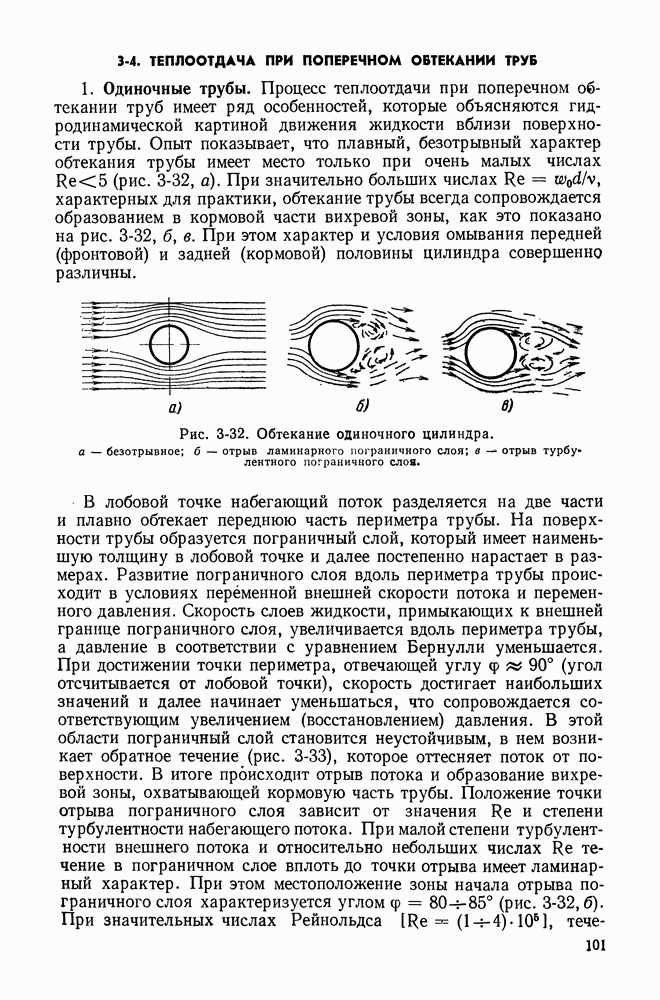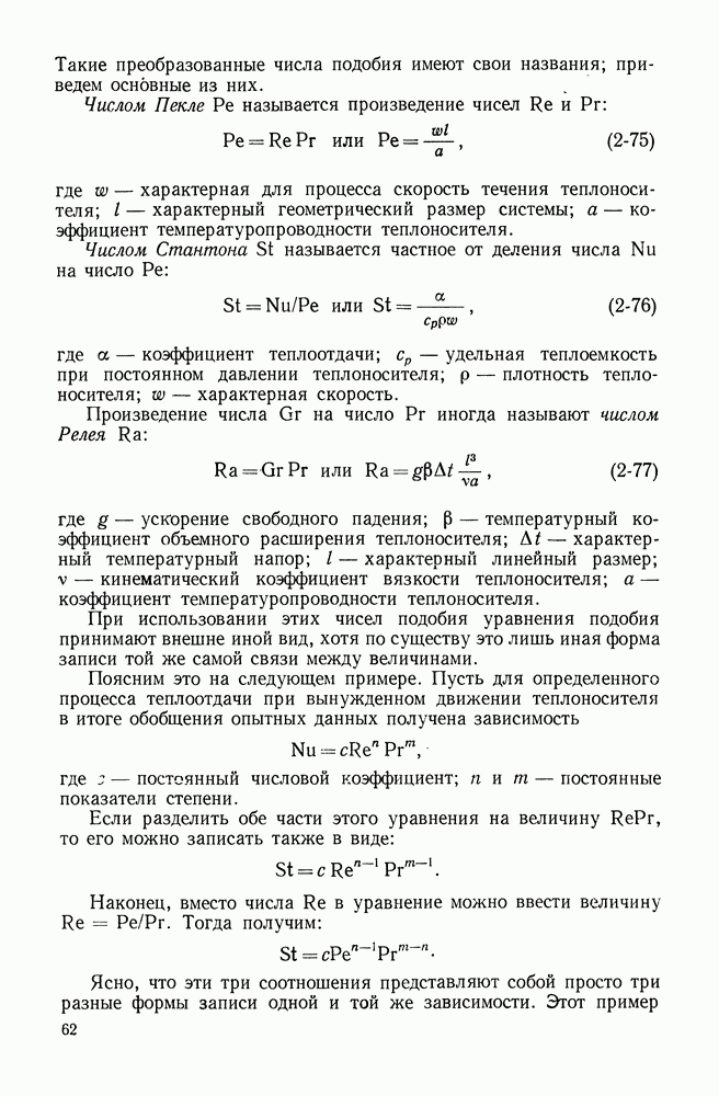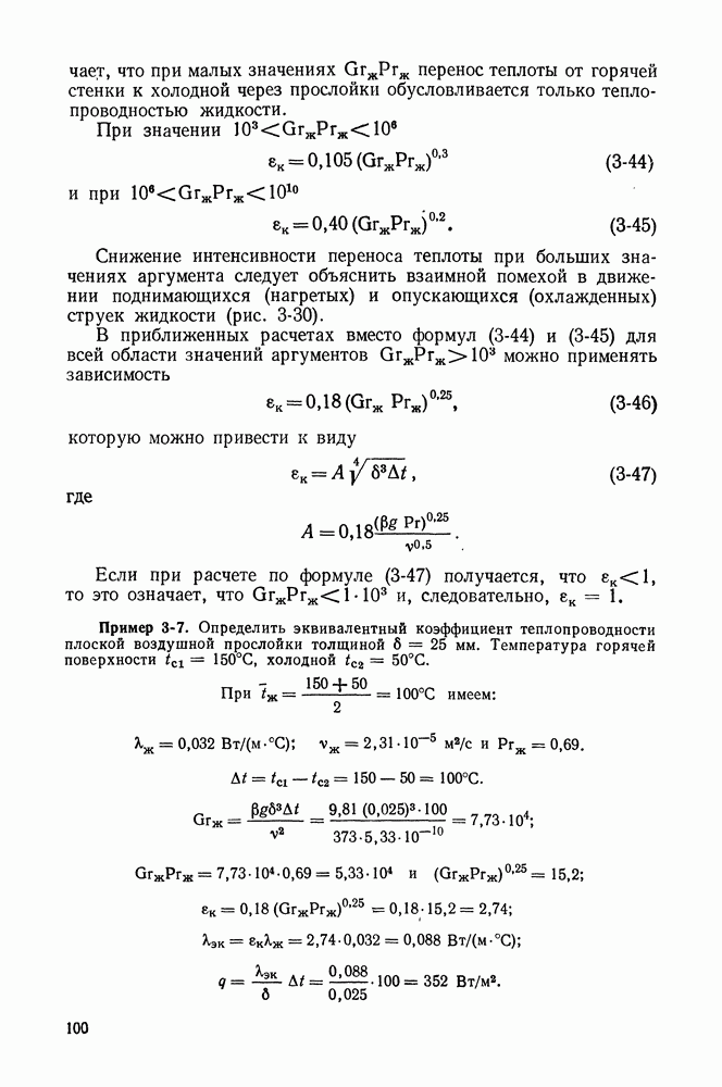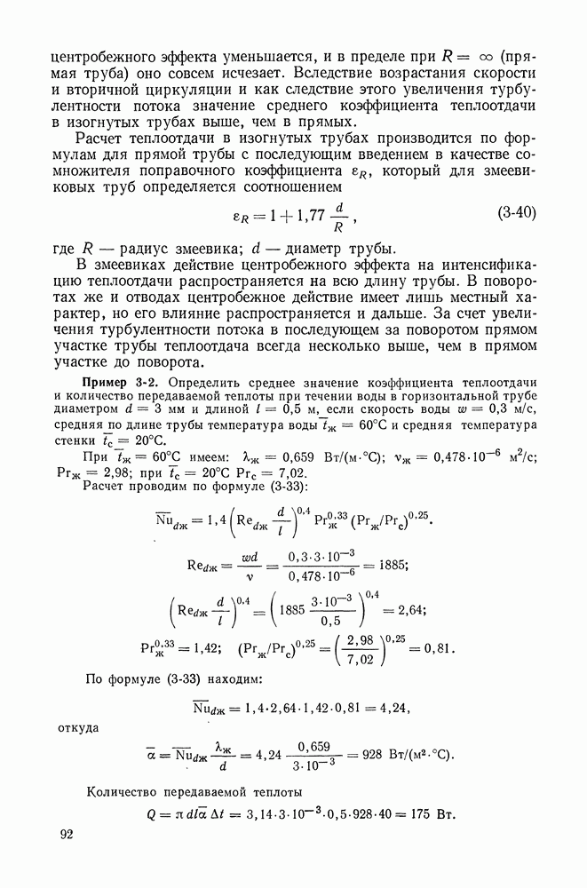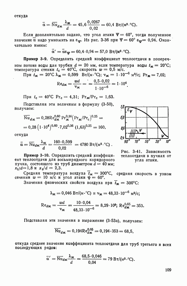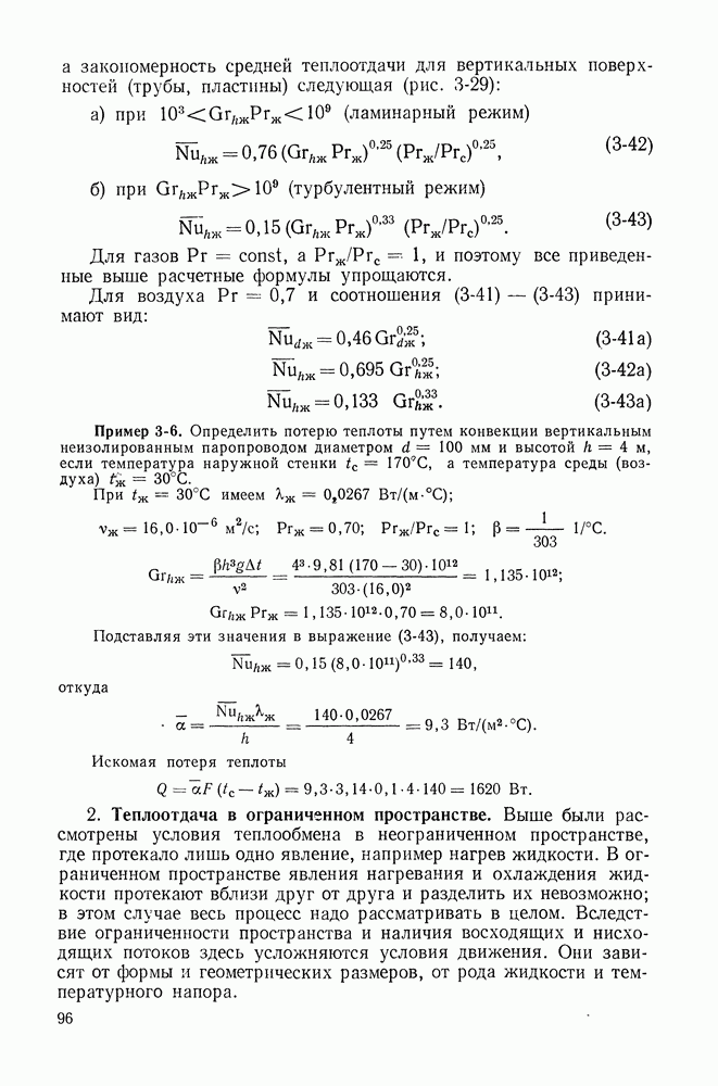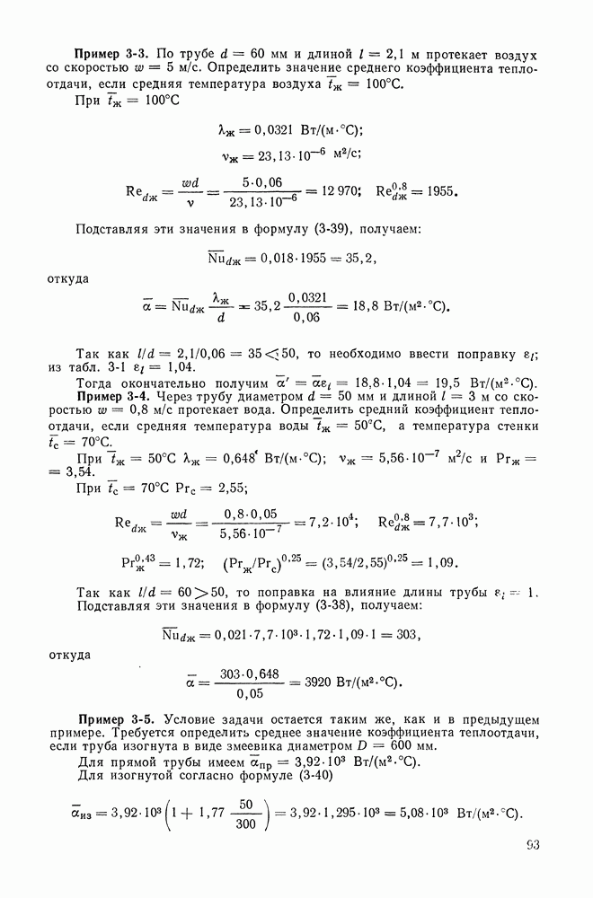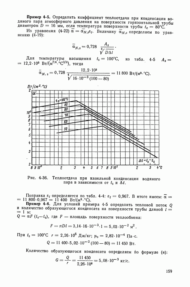 Пример 4-3. Найти коэффициент теплоотдачи и плотность теплового потока, отводимого конвективным путем от поверхности горизонтальной трубы Расчет коэффициента теплоотдачи проводим по формуле (4-13). Определяющая температура Физические свойства водяного пара при этой температуре и атмосферном давлении (см. табл. П-5): Подставляя эти величины в формулу (4-13), имеем:
