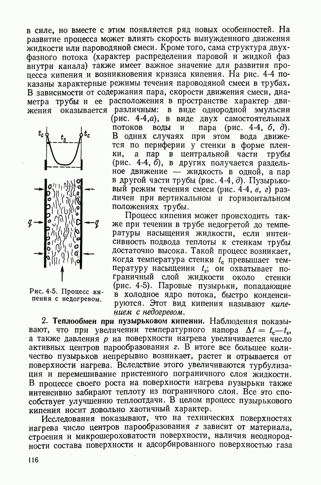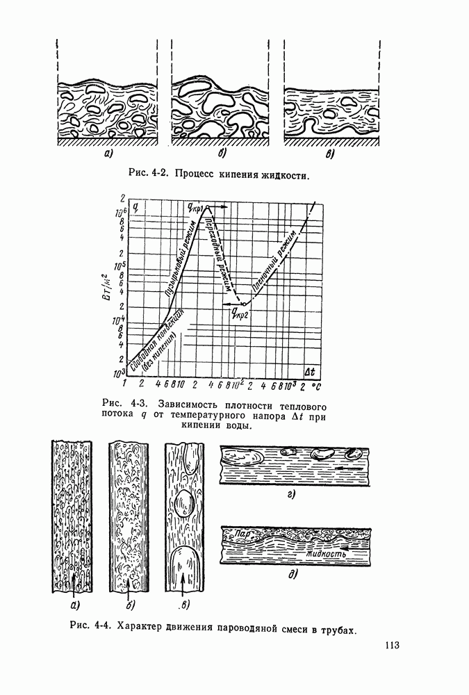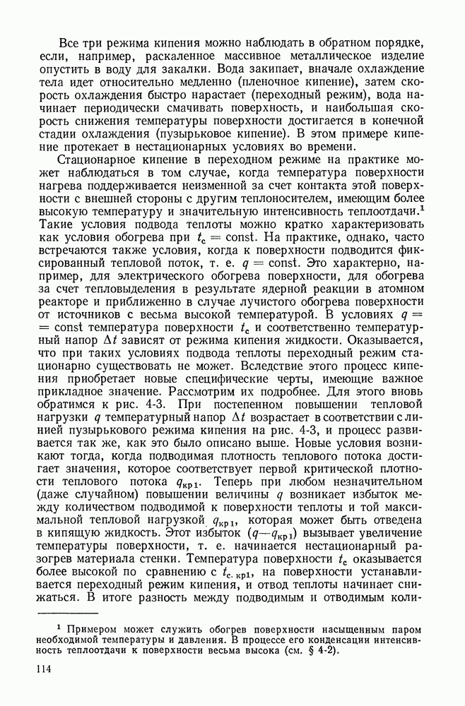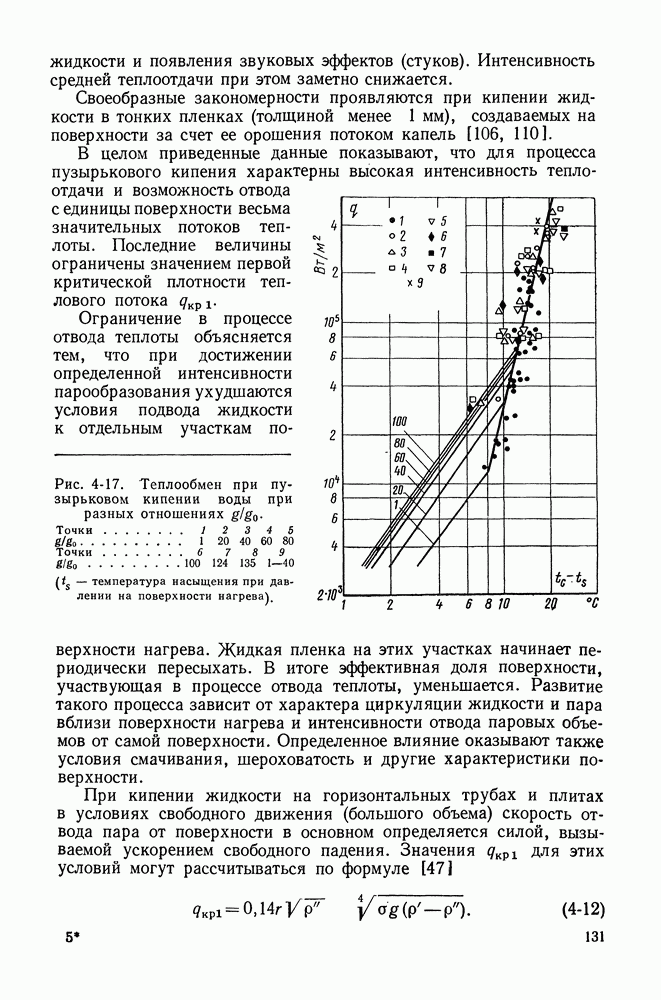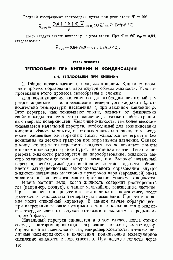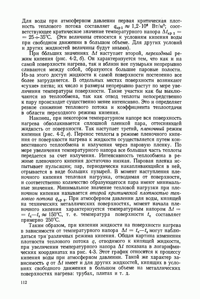 ГЛАВА ЧЕТВЕРТАЯ. ТЕПЛООБМЕН ПРИ КИПЕНИИ И КОНДЕНСАЦИИ4-1. ТЕПЛООБМЕН ПРИ КИПЕНИИ1. Общие представления о процессе кипения. Кипением называют процесс образования пара внутри объема жидкости. Условия протекания этого процесса своеобразны и сложны. Для возникновения кипения всегда необходим некоторый перегрев жидкости, т. е. превышение температуры жидкости относительно температуры насыщения Иначе обстоит дело, когда жидкость содержит растворенный газ (например, воздух), а также мельчайшие взвешенные частицы. При ее нагревании процесс кипения начинается почти сразу после достижения жидкостью температуры насыщения. При этом кипение носит спокойный характер. В данном случае образующиеся при нагревании газовые пузырьки, а также находящиеся в жидкости твердые частицы, служат готовыми начальными зародышами паровой фазы. Начальный перегрев снижается и в том случае, когда стенки сосуда, в котором происходит нагревание жидкости, имеют адсорбированный на поверхности газ, микрошероховатость, а также различные неоднородности и включения, понижающие молекулярное сцепление жидкости с поверхностью. При подводе теплоты через такую поверхность образование пузырьков наблюдается в отдельных точках поверхности, так называемых центрах парообразования. Таким образом, процесс кипения в этом случае начинается в слоях жидкости, контактирующих с поверхностью и имеющих одинаковую с ней температуру. Для практики этот вид кипения представляет наибольший интерес. Рассмотрим его основные характеристики. По мере увеличения температуры поверхности нагрева Паровые пузырьки периодически отрываются от поверхности и, всплывая к свободной поверхности, продолжают расти в объеме. Последнее объясняется тем, что температура в объеме кипящей жидкости, как показывают опытные данные, не равна температуре насыщения, а несколько превышает