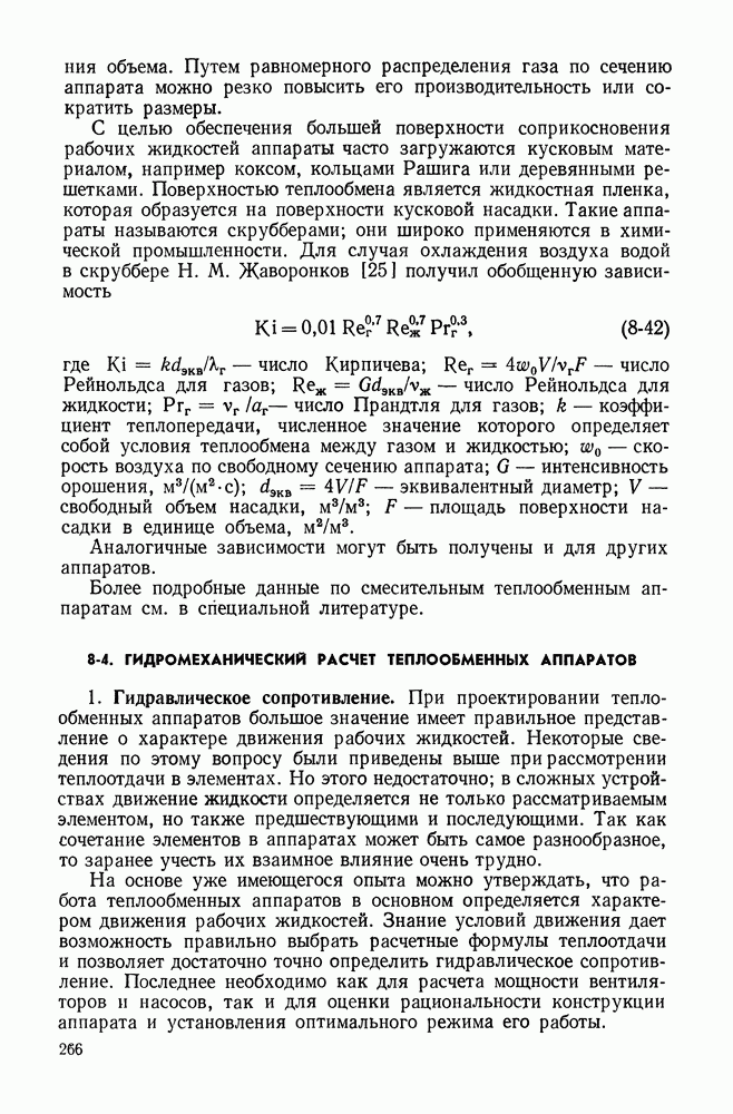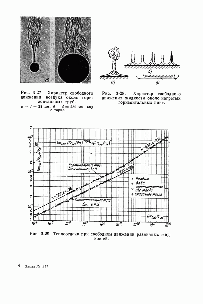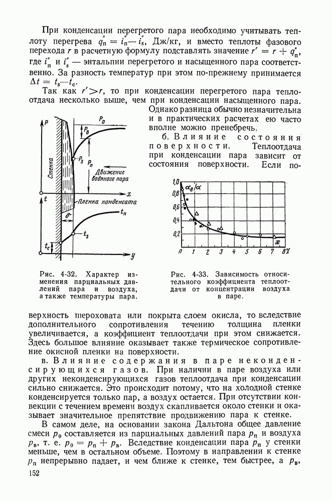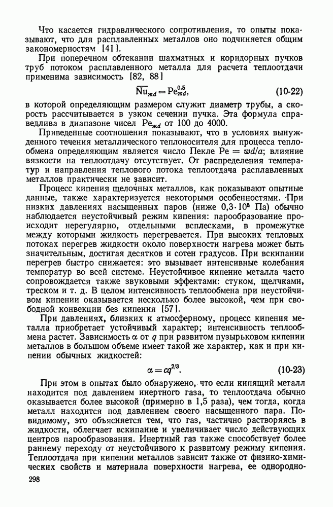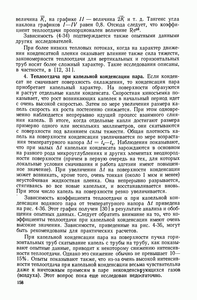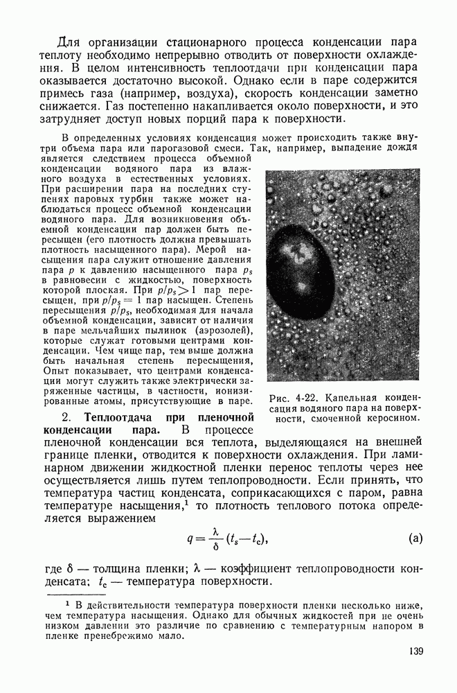 ГЛАВА ЧЕТВЕРТАЯ. ТЕПЛООБМЕН ПРИ КИПЕНИИ И КОНДЕНСАЦИИ4-1. ТЕПЛООБМЕН ПРИ КИПЕНИИ1. Общие представления о процессе кипения. Кипением называют процесс образования пара внутри объема жидкости. Условия протекания этого процесса своеобразны и сложны. Для возникновения кипения всегда необходим некоторый перегрев жидкости, т. е. превышение температуры жидкости относительно температуры насыщения Иначе обстоит дело, когда жидкость содержит растворенный газ (например, воздух), а также мельчайшие взвешенные частицы. При ее нагревании процесс кипения начинается почти сразу после достижения жидкостью температуры насыщения. При этом кипение носит спокойный характер. В данном случае образующиеся при нагревании газовые пузырьки, а также находящиеся в жидкости твердые частицы, служат готовыми начальными зародышами паровой фазы. Начальный перегрев снижается и в том случае, когда стенки сосуда, в котором происходит нагревание жидкости, имеют адсорбированный на поверхности газ, микрошероховатость, а также различные неоднородности и включения, понижающие молекулярное сцепление жидкости с поверхностью. При подводе теплоты через такую поверхность образование пузырьков наблюдается в отдельных точках поверхности, так называемых центрах парообразования. Таким образом, процесс кипения в этом случае начинается в слоях жидкости, контактирующих с поверхностью и имеющих одинаковую с ней температуру. Для практики этот вид кипения представляет наибольший интерес. Рассмотрим его основные характеристики. По мере увеличения температуры поверхности нагрева Паровые пузырьки периодически отрываются от поверхности и, всплывая к свободной поверхности, продолжают расти в объеме. Последнее объясняется тем, что температура в объеме кипящей жидкости, как показывают опытные данные, не равна температуре насыщения, а несколько превышает