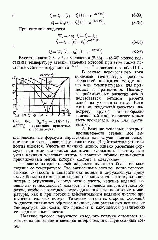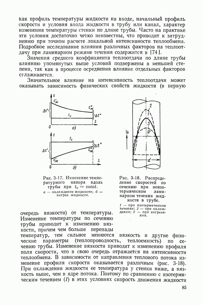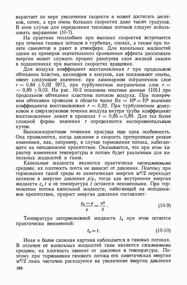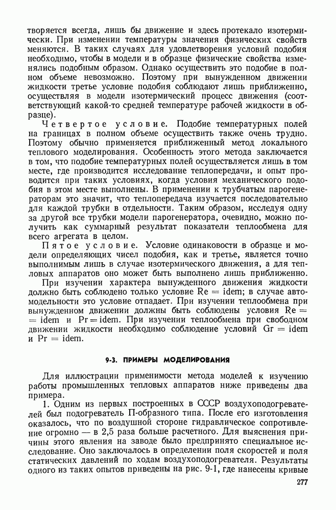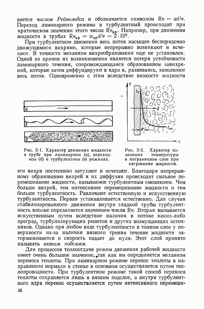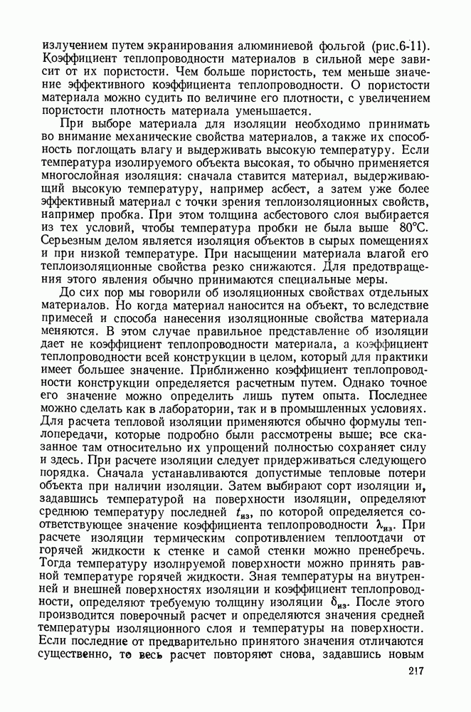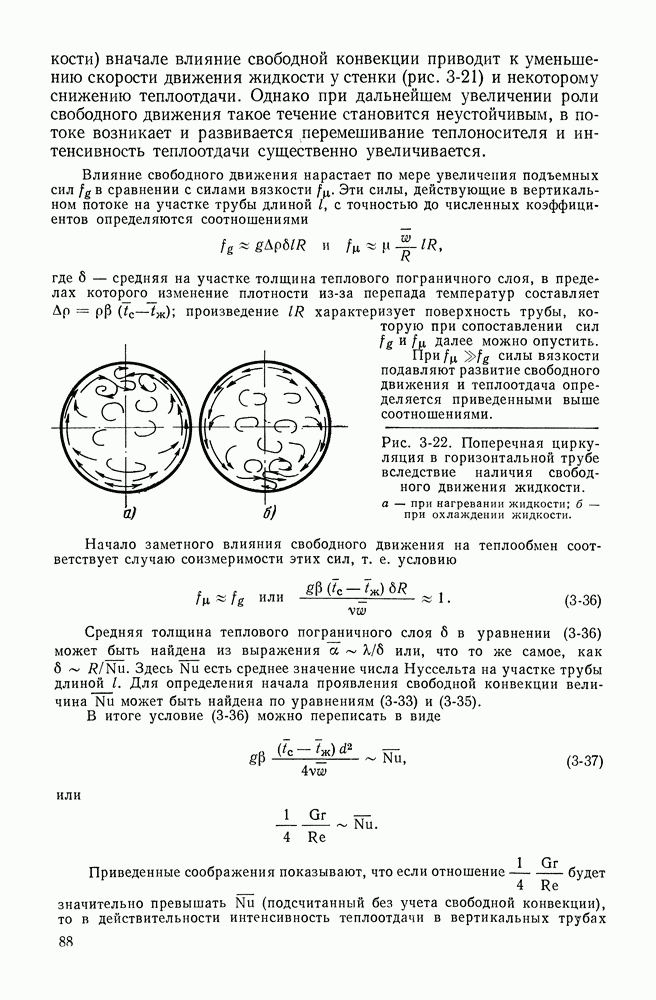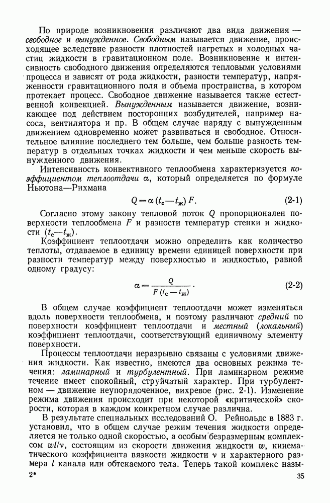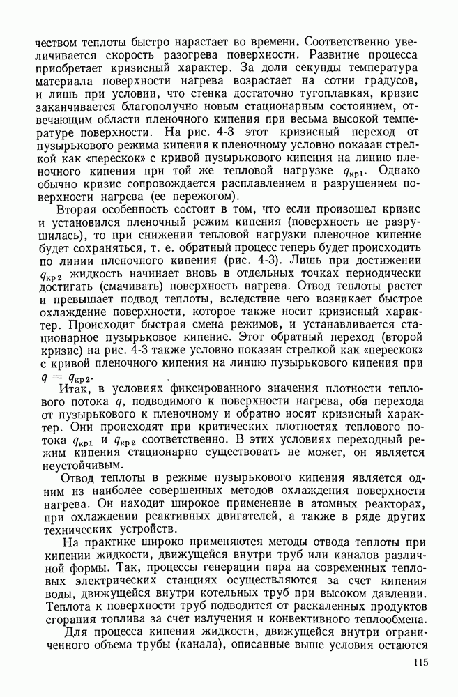 (кликните для просмотра скана) Все три режима кипения можно наблюдать в обратном порядке, если, например, раскаленное массивное металлическое изделие опустить в воду для закалки. Вода закипает, вначале охлаждение тела идет относительно медленно (пленочное кипение), затем скорость охлаждения быстро нарастает (переходный режим), вода начинает периодически смачивать поверхность, и наибольшая скорость снижения температуры поверхности достигается в конечной стадии охлаждения (пузырьковое кипение). В этом примере кипение протекает в нестационарных условиях во времени. Стационарное кипение в переходном режиме на практике может наблюдаться в том случае, когда температура поверхности нагрева поддерживается неизменной за счет контакта этой поверхности с внешней стороны с другим теплоносителем, имеющим более высокую температуру и значительную интенсивность теплоотдачи. Такие условия подвода теплоты можно кратко характеризовать как условия обогрева при Соответственно увеличивается скорость разогрева поверхности. Развитие процесса приобретает кризисный характер. За доли секунды температура материала поверхности нагрева возрастает на сотни градусов, и лишь при условии, что стенка достаточно тугоплавкая, кризис заканчивается благополучно новым стационарным состоянием, отвечающим области пленочного кипения при весьма высокой температуре поверхности. На рис. 4-3 этот кризисный переход от пузырькового режима кипения к пленочному условно показан стрелкой как «перескок» с кривой пузырькового кипения на линию пленочного кипения при той же тепловой нагрузке Вторая особенность состоит в том, что если произошел кризис и установился пленочный режим кипения (поверхность не разрушилась), то при снижении тепловой нагрузки пленочное кипение будет сохраняться, т. е. обратный процесс теперь будет происходить по линии пленочного кипения (рис. 4-3). Лишь при достижении Итак, в условиях фиксированного значения плотности теплового потока q, подводимого к поверхности нагрева, оба перехода от пузырькового к пленочному и обратно носят кризисный характер. Они происходят при критических плотностях теплового потока Отвод теплоты в режиме пузырькового кипения является одним из наиболее совершенных методов охлаждения поверхности нагрева. Он находит широкое применение в атомных реакторах, при охлаждении реактивных двигателей, а также в ряде других технических устройств. На практике широко применяются методы отвода теплоты при кипении жидкости, движущейся внутри труб или каналов различной формы. Так, процессы генерации пара на современных тепловых электрических станциях осуществляются за счет кипения воды, движущейся внутри котельных труб при высоком давлении. Теплота к поверхности труб подводится от раскаленных продуктов сгорания топлива за счет излучения и конвективного теплообмена. Для процесса кипения жидкости, движущейся внутри ограниченного объема трубы (канала), описанные выше условия остаются в силе, но вместе с этим появляется ряд новых особенностей. На развитие процесса может влиять скорость вынужденного движения жидкости или пароводяной смеси. Кроме того, сама структура двухфазного потока (характер распределения паровой и жидкой фаз внутри канала) также имеет важное значение для развития процесса кипения и возникно