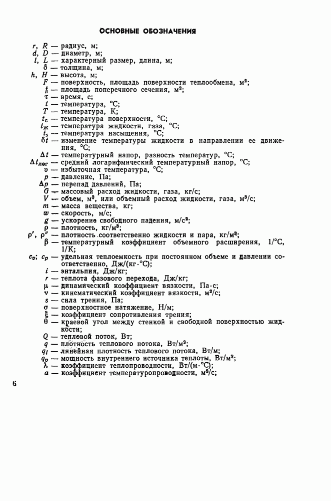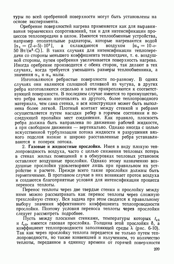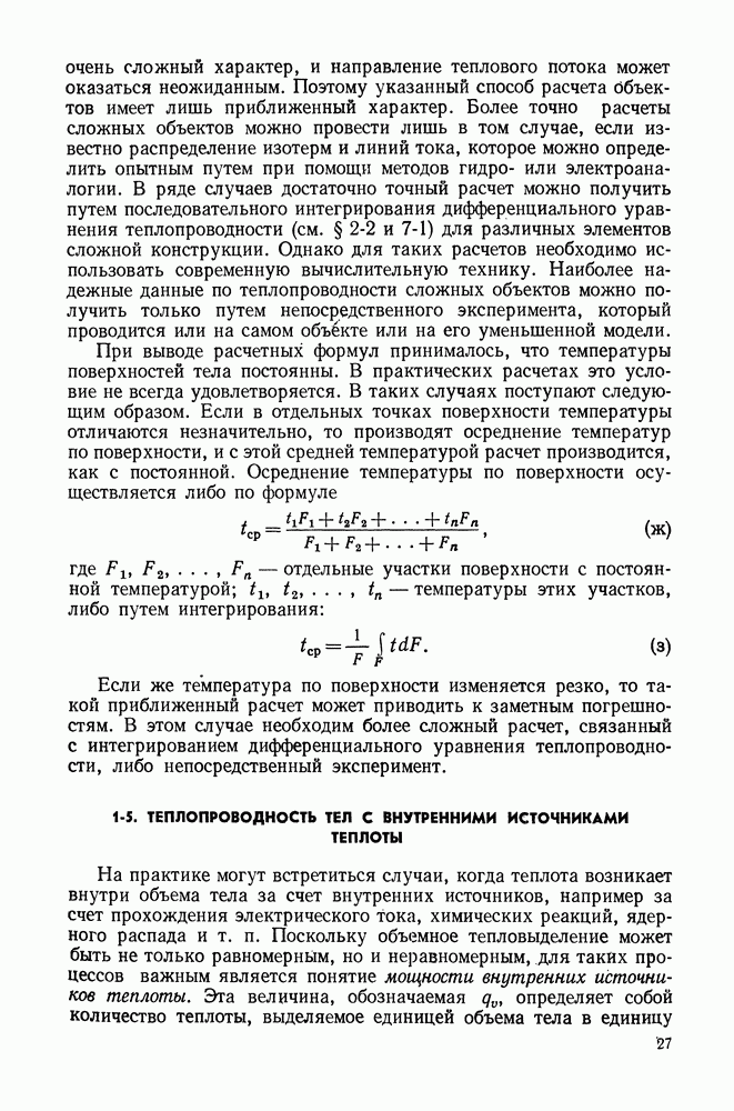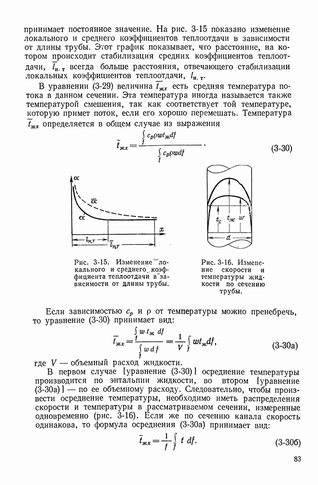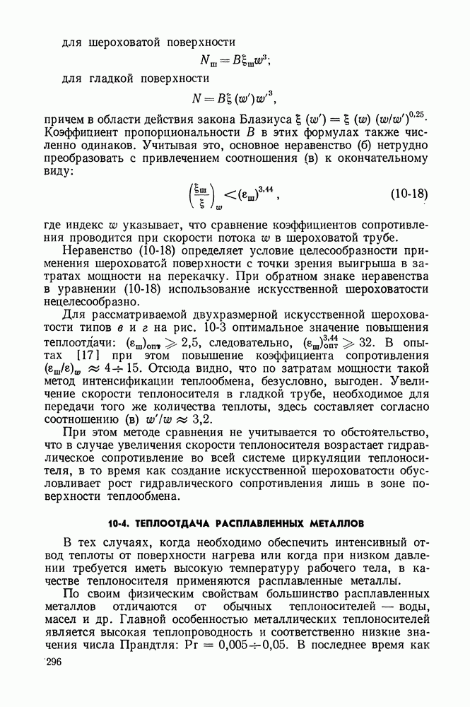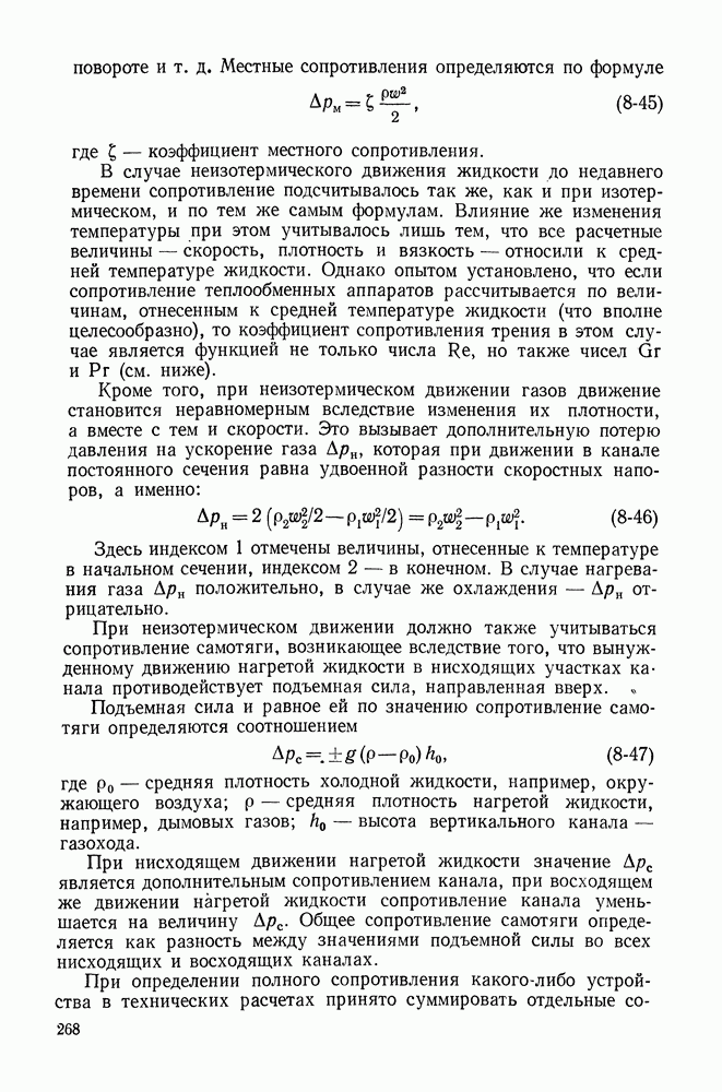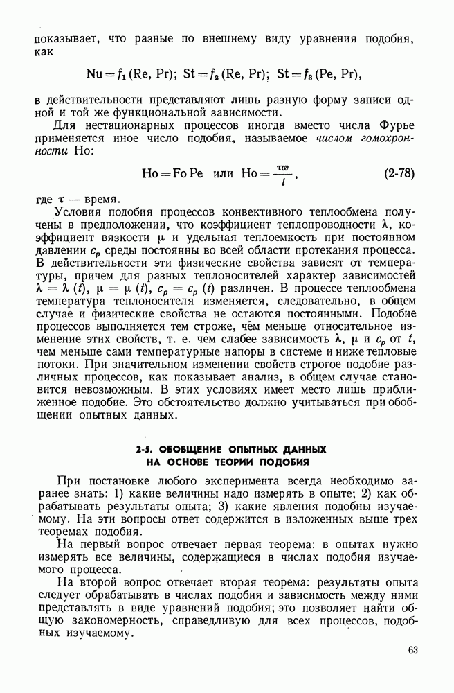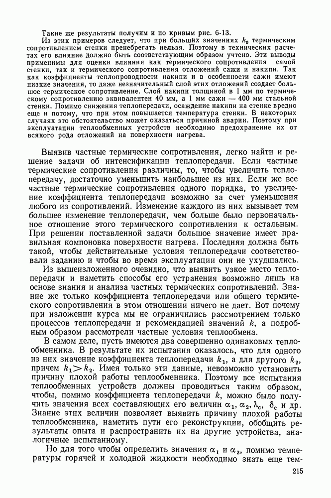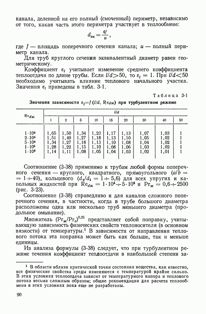 (кликните для просмотра скана) Все три режима кипения можно наблюдать в обратном порядке, если, например, раскаленное массивное металлическое изделие опустить в воду для закалки. Вода закипает, вначале охлаждение тела идет относительно медленно (пленочное кипение), затем скорость охлаждения быстро нарастает (переходный режим), вода начинает периодически смачивать поверхность, и наибольшая скорость снижения температуры поверхности достигается в конечной стадии охлаждения (пузырьковое кипение). В этом примере кипение протекает в нестационарных условиях во времени. Стационарное кипение в переходном режиме на практике может наблюдаться в том случае, когда температура поверхности нагрева поддерживается неизменной за счет контакта этой поверхности с внешней стороны с другим теплоносителем, имеющим более высокую температуру и значительную интенсивность теплоотдачи. Такие условия подвода теплоты можно кратко характеризовать как условия обогрева при Соответственно увеличивается скорость разогрева поверхности. Развитие процесса приобретает кризисный характер. За доли секунды температура материала поверхности нагрева возрастает на сотни градусов, и лишь при условии, что стенка достаточно тугоплавкая, кризис заканчивается благополучно новым стационарным состоянием, отвечающим области пленочного кипения при весьма высокой температуре поверхности. На рис. 4-3 этот кризисный переход от пузырькового режима кипения к пленочному условно показан стрелкой как «перескок» с кривой пузырькового кипения на линию пленочного кипения при той же тепловой нагрузке Вторая особенность состоит в том, что если произошел кризис и установился пленочный режим кипения (поверхность не разрушилась), то при снижении тепловой нагрузки пленочное кипение будет сохраняться, т. е. обратный процесс теперь будет происходить по линии пленочного кипения (рис. 4-3). Лишь при достижении Итак, в условиях фиксированного значения плотности теплового потока q, подводимого к поверхности нагрева, оба перехода от пузырькового к пленочному и обратно носят кризисный характер. Они происходят при критических плотностях теплового потока Отвод теплоты в режиме пузырькового кипения является одним из наиболее совершенных методов охлаждения поверхности нагрева. Он находит широкое применение в атомных реакторах, при охлаждении реактивных двигателей, а также в ряде других технических устройств. На практике широко применяются методы отвода теплоты при кипении жидкости, движущейся внутри труб или каналов различной формы. Так, процессы генерации пара на современных тепловых электрических станциях осуществляются за счет кипения воды, движущейся внутри котельных труб при высоком давлении. Теплота к поверхности труб подводится от раскаленных продуктов сгорания топлива за счет излучения и конвективного теплообмена. Для процесса кипения жидкости, движущейся внутри ограниченного объема трубы (канала), описанные выше условия остаются в силе, но вместе с этим появляется ряд новых особенностей. На развитие процесса может влиять скорость вынужденного движения жидкости или пароводяной смеси. Кроме того, сама структура двухфазного потока (характер распределения паровой и жидкой фаз внутри канала) также имеет важное значение для развития процесса кипения и возникно