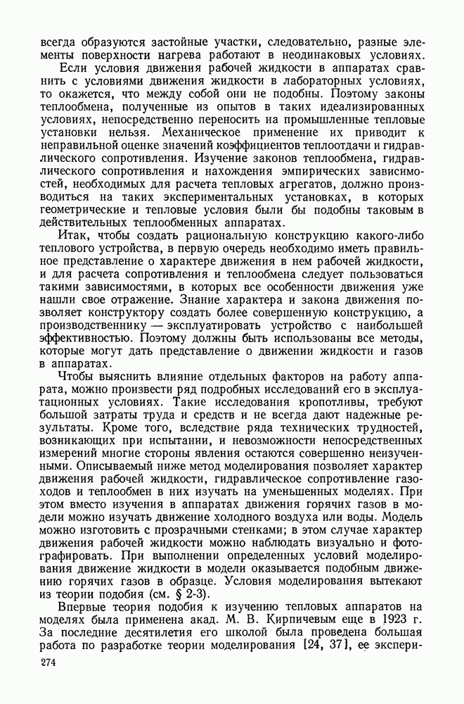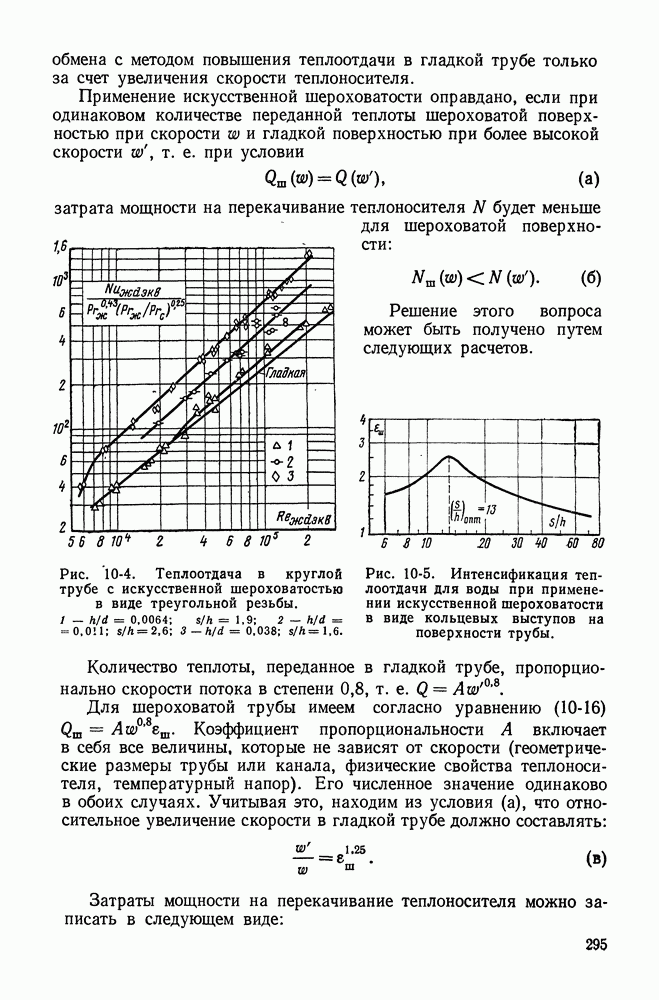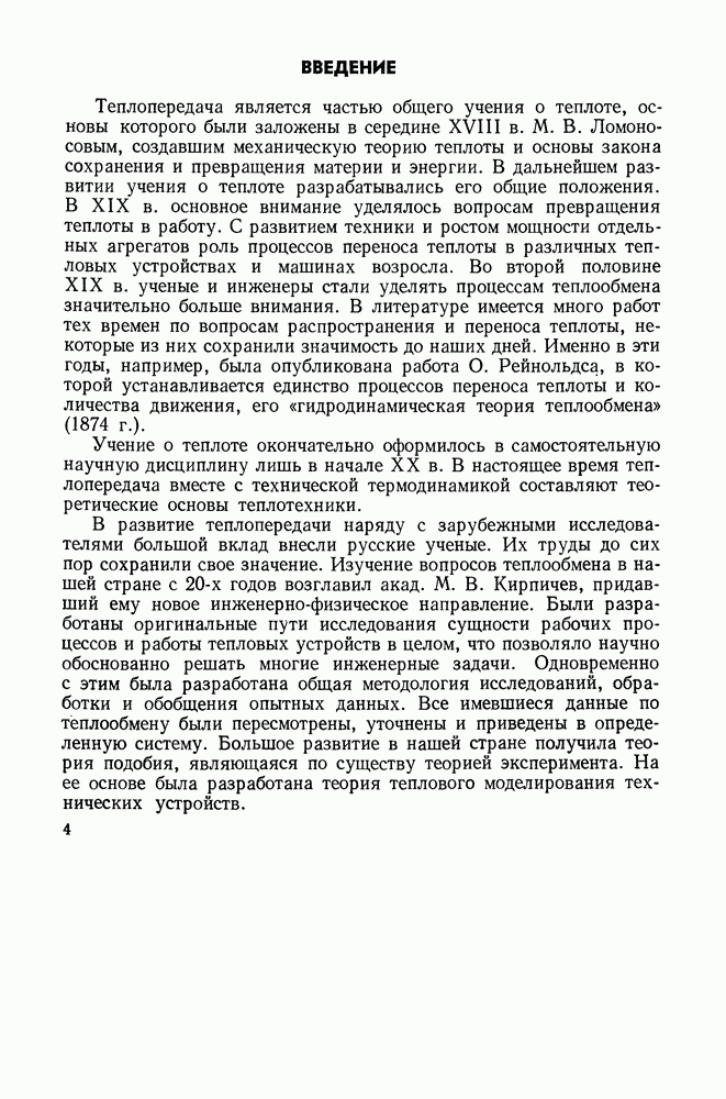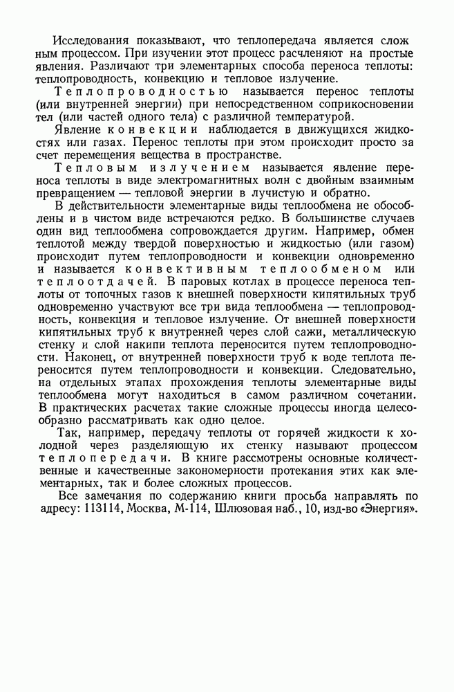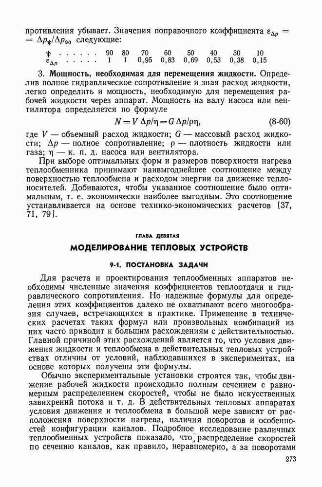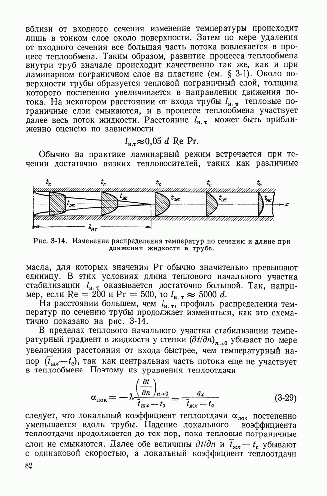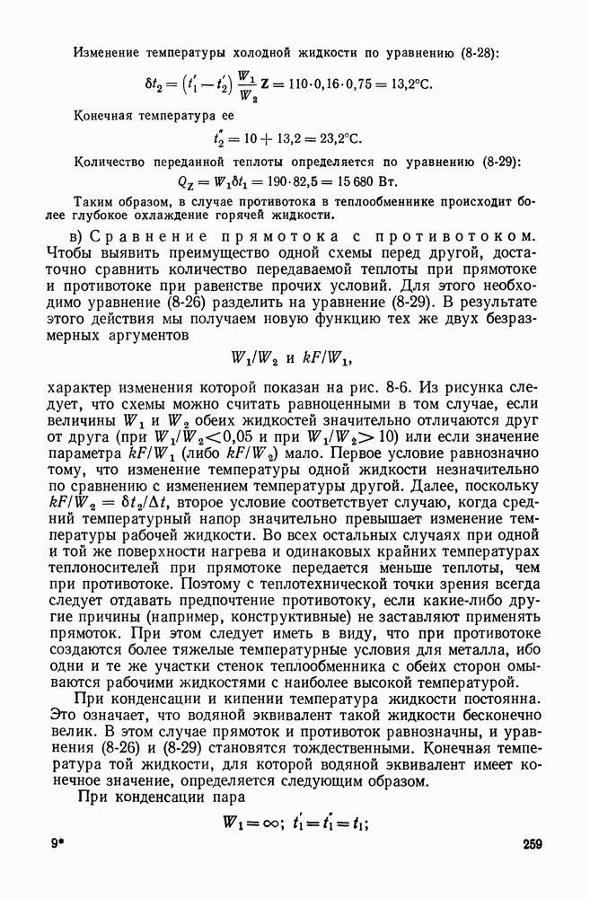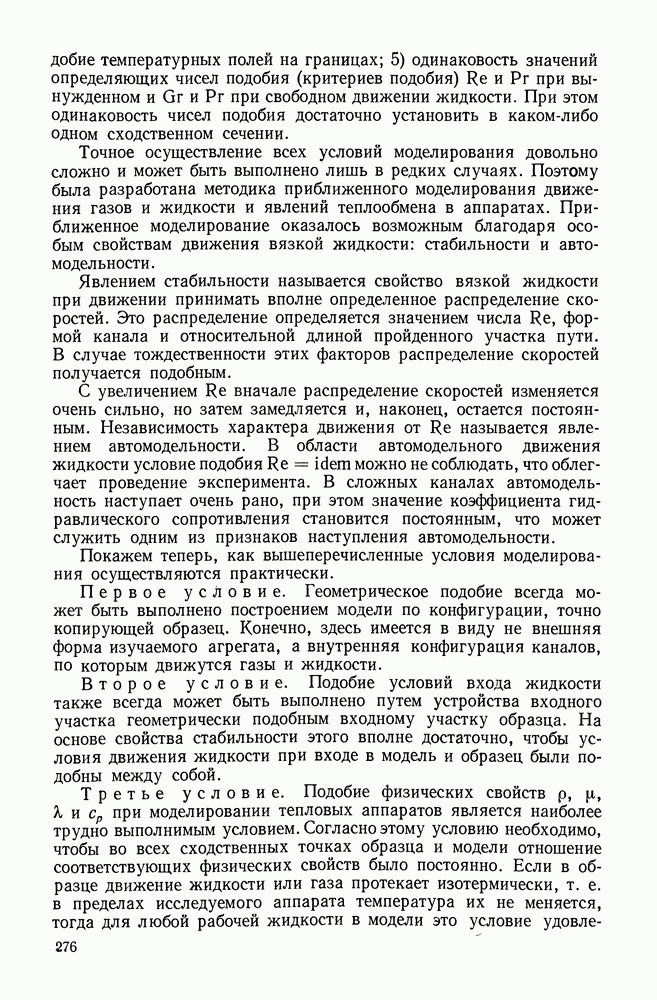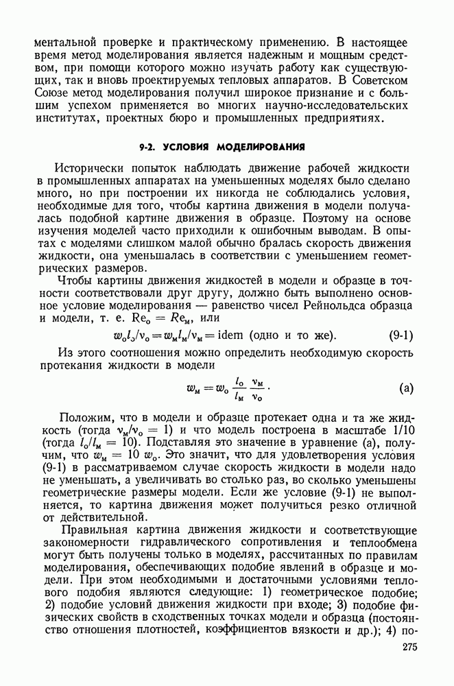 (кликните для просмотра скана) Все три режима кипения можно наблюдать в обратном порядке, если, например, раскаленное массивное металлическое изделие опустить в воду для закалки. Вода закипает, вначале охлаждение тела идет относительно медленно (пленочное кипение), затем скорость охлаждения быстро нарастает (переходный режим), вода начинает периодически смачивать поверхность, и наибольшая скорость снижения температуры поверхности достигается в конечной стадии охлаждения (пузырьковое кипение). В этом примере кипение протекает в нестационарных условиях во времени. Стационарное кипение в переходном режиме на практике может наблюдаться в том случае, когда температура поверхности нагрева поддерживается неизменной за счет контакта этой поверхности с внешней стороны с другим теплоносителем, имеющим более высокую температуру и значительную интенсивность теплоотдачи. Такие условия подвода теплоты можно кратко характеризовать как условия обогрева при Соответственно увеличивается скорость разогрева поверхности. Развитие процесса приобретает кризисный характер. За доли секунды температура материала поверхности нагрева возрастает на сотни градусов, и лишь при условии, что стенка достаточно тугоплавкая, кризис заканчивается благополучно новым стационарным состоянием, отвечающим области пленочного кипения при весьма высокой температуре поверхности. На рис. 4-3 этот кризисный переход от пузырькового режима кипения к пленочному условно показан стрелкой как «перескок» с кривой пузырькового кипения на линию пленочного кипения при той же тепловой нагрузке Вторая особенность состоит в том, что если произошел кризис и установился пленочный режим кипения (поверхность не разрушилась), то при снижении тепловой нагрузки пленочное кипение будет сохраняться, т. е. обратный процесс теперь будет происходить по линии пленочного кипения (рис. 4-3). Лишь при достижении Итак, в условиях фиксированного значения плотности теплового потока q, подводимого к поверхности нагрева, оба перехода от пузырькового к пленочному и обратно носят кризисный характер. Они происходят при критических плотностях теплового потока Отвод теплоты в режиме пузырькового кипения является одним из наиболее совершенных методов охлаждения поверхности нагрева. Он находит широкое применение в атомных реакторах, при охлаждении реактивных двигателей, а также в ряде других технических устройств. На практике широко применяются методы отвода теплоты при кипении жидкости, движущейся внутри труб или каналов различной формы. Так, процессы генерации пара на современных тепловых электрических станциях осуществляются за счет кипения воды, движущейся внутри котельных труб при высоком давлении. Теплота к поверхности труб подводится от раскаленных продуктов сгорания топлива за счет излучения и конвективного теплообмена. Для процесса кипения жидкости, движущейся внутри ограниченного объема трубы (канала), описанные выше условия остаются в силе, но вместе с этим появляется ряд новых особенностей. На развитие процесса может влиять скорость вынужденного движения жидкости или пароводяной смеси. Кроме того, сама структура двухфазного потока (характер распределения паровой и жидкой фаз внутри канала) также имеет важное значение для развития процесса кипения и возникно