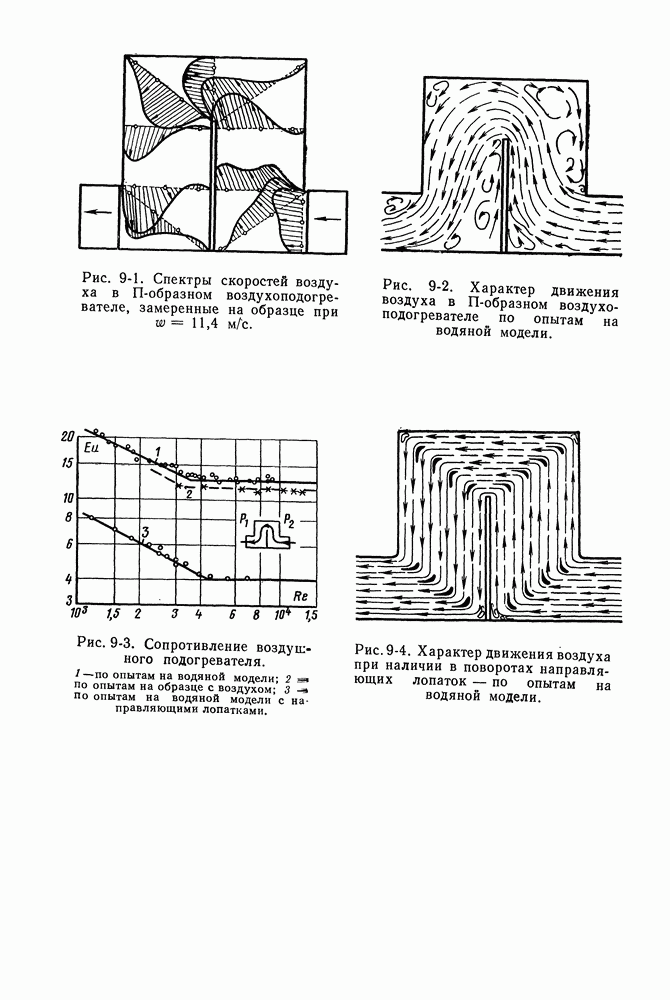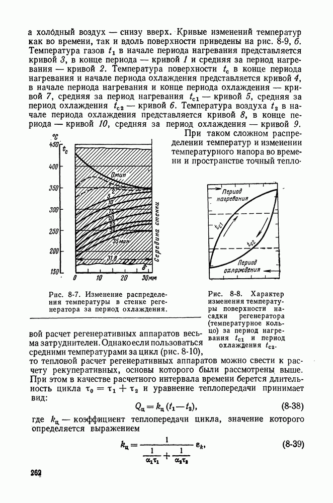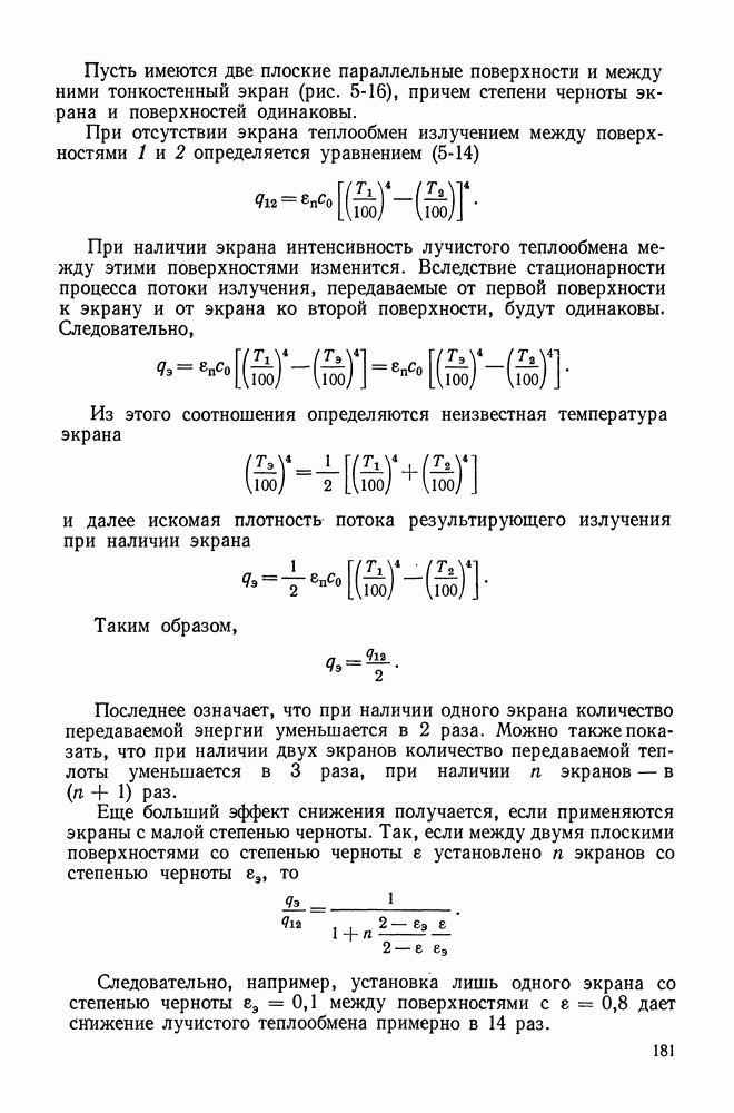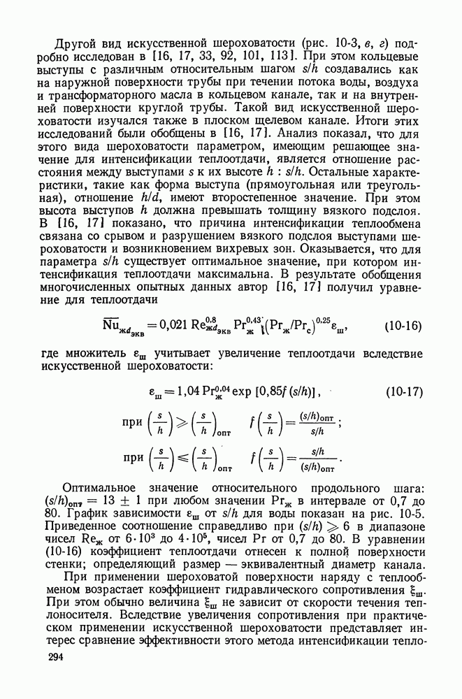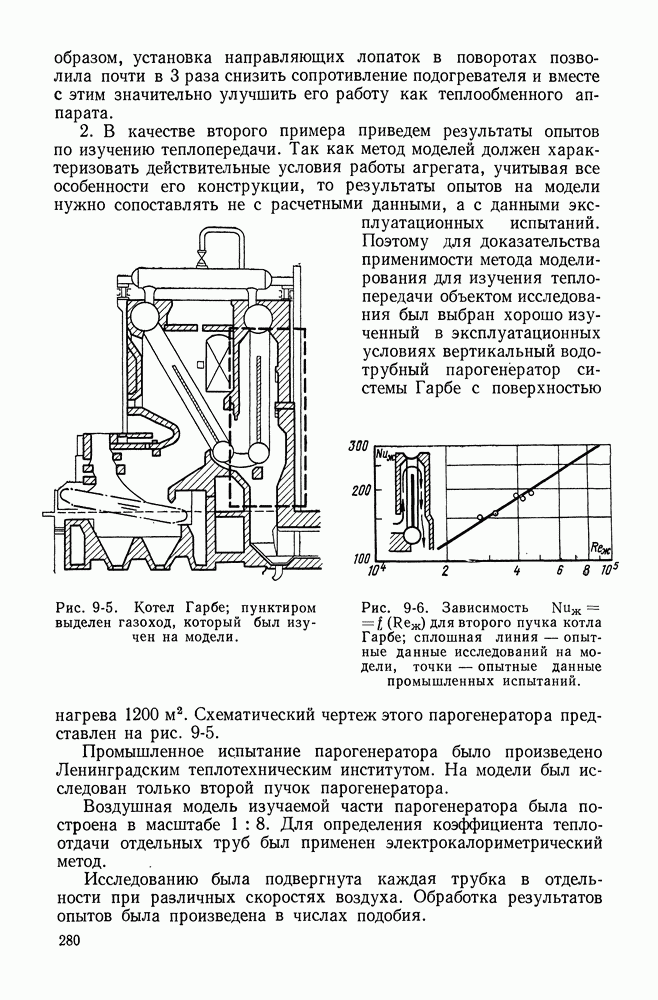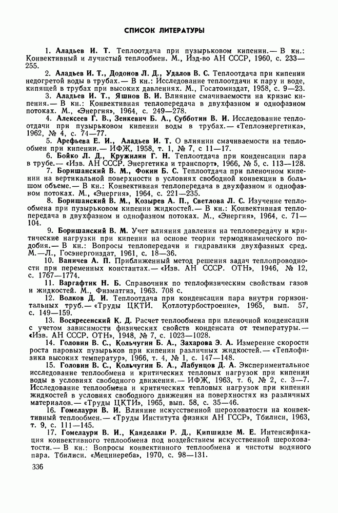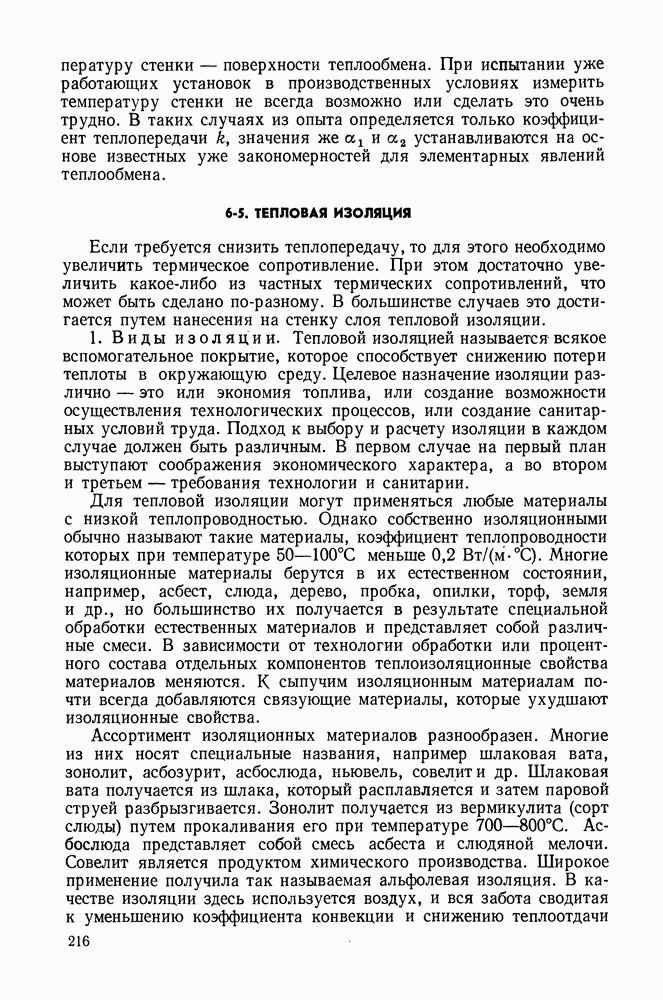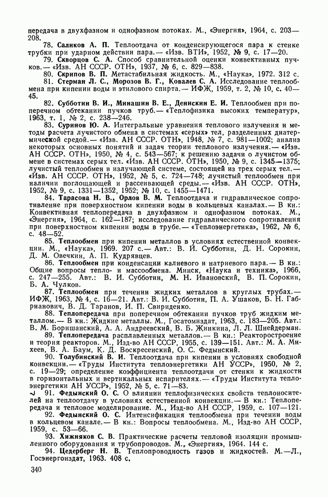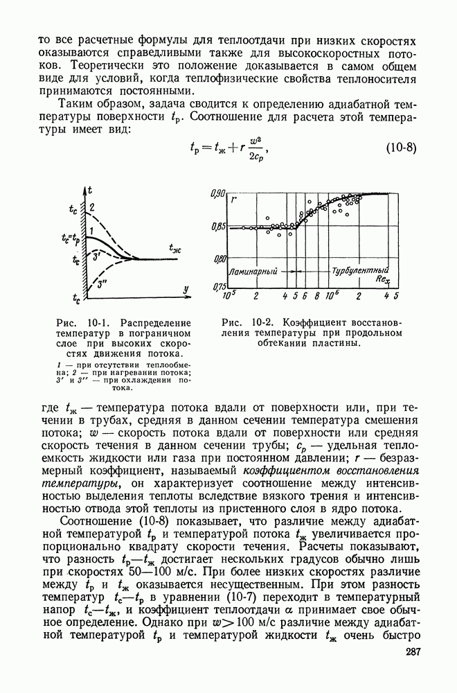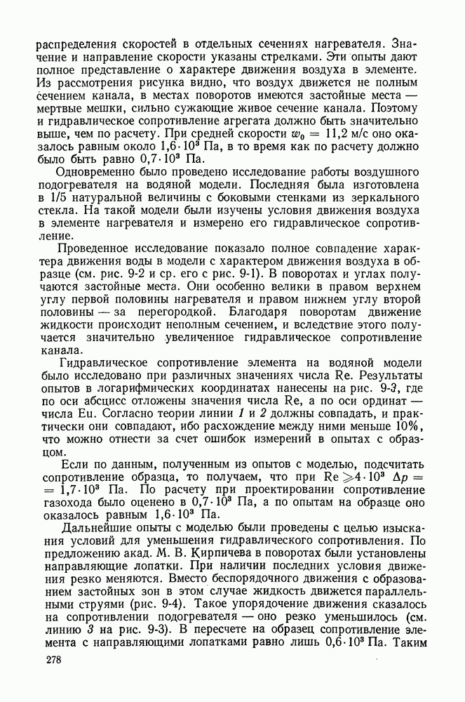 (кликните для просмотра скана) Все три режима кипения можно наблюдать в обратном порядке, если, например, раскаленное массивное металлическое изделие опустить в воду для закалки. Вода закипает, вначале охлаждение тела идет относительно медленно (пленочное кипение), затем скорость охлаждения быстро нарастает (переходный режим), вода начинает периодически смачивать поверхность, и наибольшая скорость снижения температуры поверхности достигается в конечной стадии охлаждения (пузырьковое кипение). В этом примере кипение протекает в нестационарных условиях во времени. Стационарное кипение в переходном режиме на практике может наблюдаться в том случае, когда температура поверхности нагрева поддерживается неизменной за счет контакта этой поверхности с внешней стороны с другим теплоносителем, имеющим более высокую температуру и значительную интенсивность теплоотдачи. Такие условия подвода теплоты можно кратко характеризовать как условия обогрева при Соответственно увеличивается скорость разогрева поверхности. Развитие процесса приобретает кризисный характер. За доли секунды температура материала поверхности нагрева возрастает на сотни градусов, и лишь при условии, что стенка достаточно тугоплавкая, кризис заканчивается благополучно новым стационарным состоянием, отвечающим области пленочного кипения при весьма высокой температуре поверхности. На рис. 4-3 этот кризисный переход от пузырькового режима кипения к пленочному условно показан стрелкой как «перескок» с кривой пузырькового кипения на линию пленочного кипения при той же тепловой нагрузке Вторая особенность состоит в том, что если произошел кризис и установился пленочный режим кипения (поверхность не разрушилась), то при снижении тепловой нагрузки пленочное кипение будет сохраняться, т. е. обратный процесс теперь будет происходить по линии пленочного кипения (рис. 4-3). Лишь при достижении Итак, в условиях фиксированного значения плотности теплового потока q, подводимого к поверхности нагрева, оба перехода от пузырькового к пленочному и обратно носят кризисный характер. Они происходят при критических плотностях теплового потока Отвод теплоты в режиме пузырькового кипения является одним из наиболее совершенных методов охлаждения поверхности нагрева. Он находит широкое применение в атомных реакторах, при охлаждении реактивных двигателей, а также в ряде других технических устройств. На практике широко применяются методы отвода теплоты при кипении жидкости, движущейся внутри труб или каналов различной формы. Так, процессы генерации пара на современных тепловых электрических станциях осуществляются за счет кипения воды, движущейся внутри котельных труб при высоком давлении. Теплота к поверхности труб подводится от раскаленных продуктов сгорания топлива за счет излучения и конвективного теплообмена. Для процесса кипения жидкости, движущейся внутри ограниченного объема трубы (канала), описанные выше условия остаются в силе, но вместе с этим появляется ряд новых особенностей. На развитие процесса может влиять скорость вынужденного движения жидкости или пароводяной смеси. Кроме того, сама структура двухфазного потока (характер распределения паровой и жидкой фаз внутри канала) также имеет важное значение для развития процесса кипения и возникно