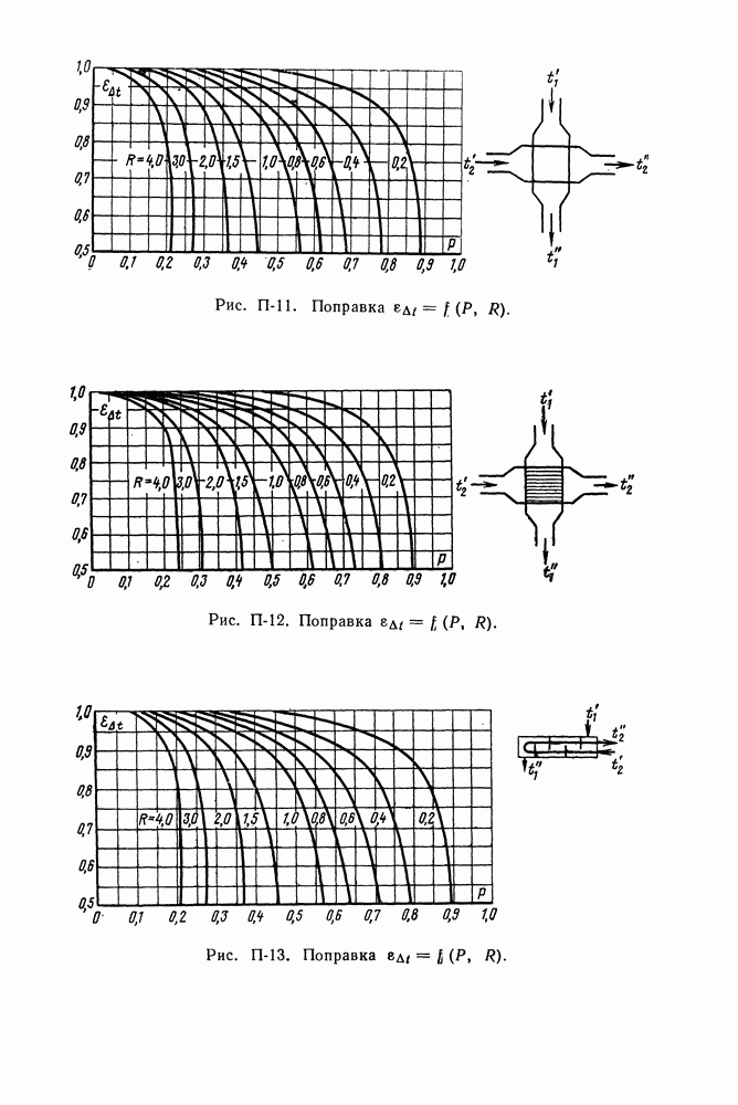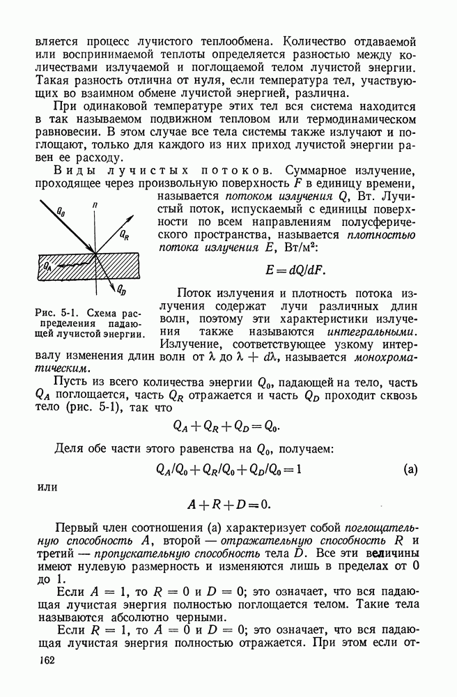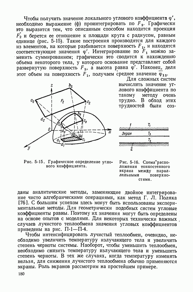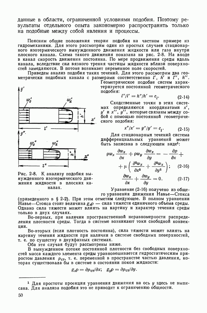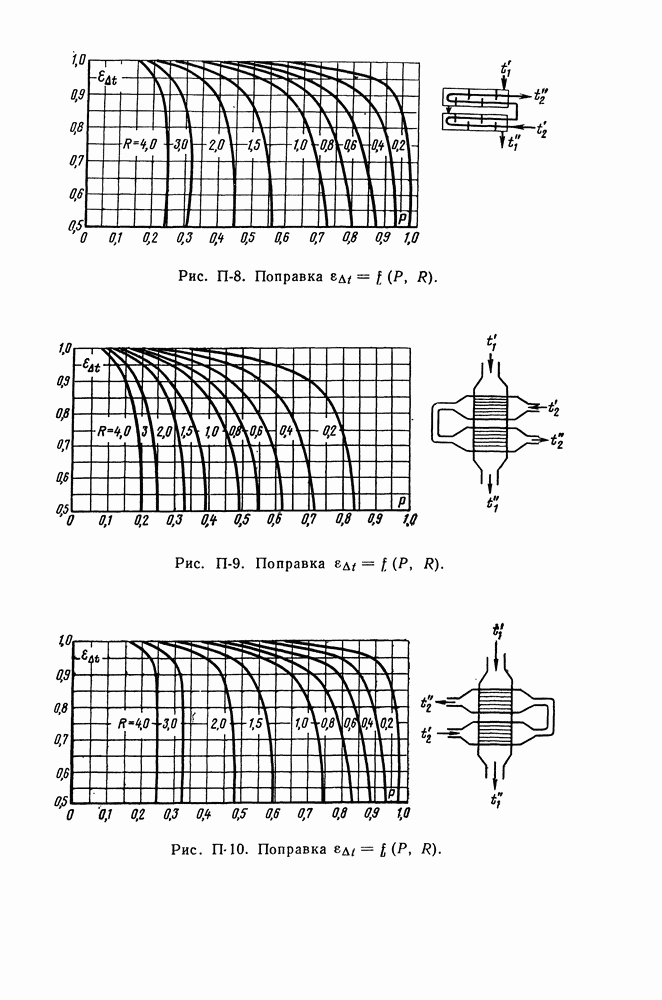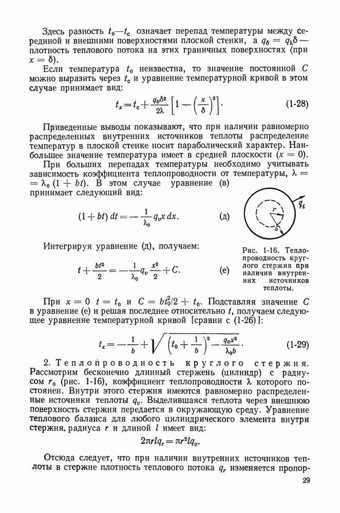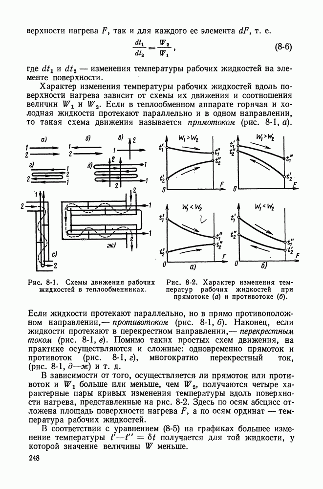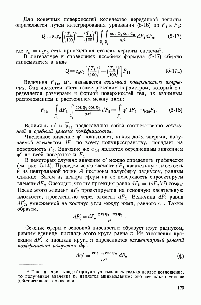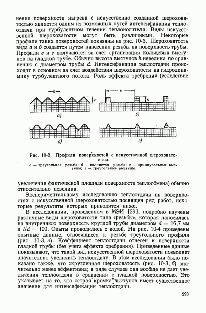 (кликните для просмотра скана) Все три режима кипения можно наблюдать в обратном порядке, если, например, раскаленное массивное металлическое изделие опустить в воду для закалки. Вода закипает, вначале охлаждение тела идет относительно медленно (пленочное кипение), затем скорость охлаждения быстро нарастает (переходный режим), вода начинает периодически смачивать поверхность, и наибольшая скорость снижения температуры поверхности достигается в конечной стадии охлаждения (пузырьковое кипение). В этом примере кипение протекает в нестационарных условиях во времени. Стационарное кипение в переходном режиме на практике может наблюдаться в том случае, когда температура поверхности нагрева поддерживается неизменной за счет контакта этой поверхности с внешней стороны с другим теплоносителем, имеющим более высокую температуру и значительную интенсивность теплоотдачи. Такие условия подвода теплоты можно кратко характеризовать как условия обогрева при Соответственно увеличивается скорость разогрева поверхности. Развитие процесса приобретает кризисный характер. За доли секунды температура материала поверхности нагрева возрастает на сотни градусов, и лишь при условии, что стенка достаточно тугоплавкая, кризис заканчивается благополучно новым стационарным состоянием, отвечающим области пленочного кипения при весьма высокой температуре поверхности. На рис. 4-3 этот кризисный переход от пузырькового режима кипения к пленочному условно показан стрелкой как «перескок» с кривой пузырькового кипения на линию пленочного кипения при той же тепловой нагрузке Вторая особенность состоит в том, что если произошел кризис и установился пленочный режим кипения (поверхность не разрушилась), то при снижении тепловой нагрузки пленочное кипение будет сохраняться, т. е. обратный процесс теперь будет происходить по линии пленочного кипения (рис. 4-3). Лишь при достижении Итак, в условиях фиксированного значения плотности теплового потока q, подводимого к поверхности нагрева, оба перехода от пузырькового к пленочному и обратно носят кризисный характер. Они происходят при критических плотностях теплового потока Отвод теплоты в режиме пузырькового кипения является одним из наиболее совершенных методов охлаждения поверхности нагрева. Он находит широкое применение в атомных реакторах, при охлаждении реактивных двигателей, а также в ряде других технических устройств. На практике широко применяются методы отвода теплоты при кипении жидкости, движущейся внутри труб или каналов различной формы. Так, процессы генерации пара на современных тепловых электрических станциях осуществляются за счет кипения воды, движущейся внутри котельных труб при высоком давлении. Теплота к поверхности труб подводится от раскаленных продуктов сгорания топлива за счет излучения и конвективного теплообмена. Для процесса кипения жидкости, движущейся внутри ограниченного объема трубы (канала), описанные выше условия остаются в силе, но вместе с этим появляется ряд новых особенностей. На развитие процесса может влиять скорость вынужденного движения жидкости или пароводяной смеси. Кроме того, сама структура двухфазного потока (характер распределения паровой и жидкой фаз внутри канала) также имеет важное значение для развития процесса кипения и возникно