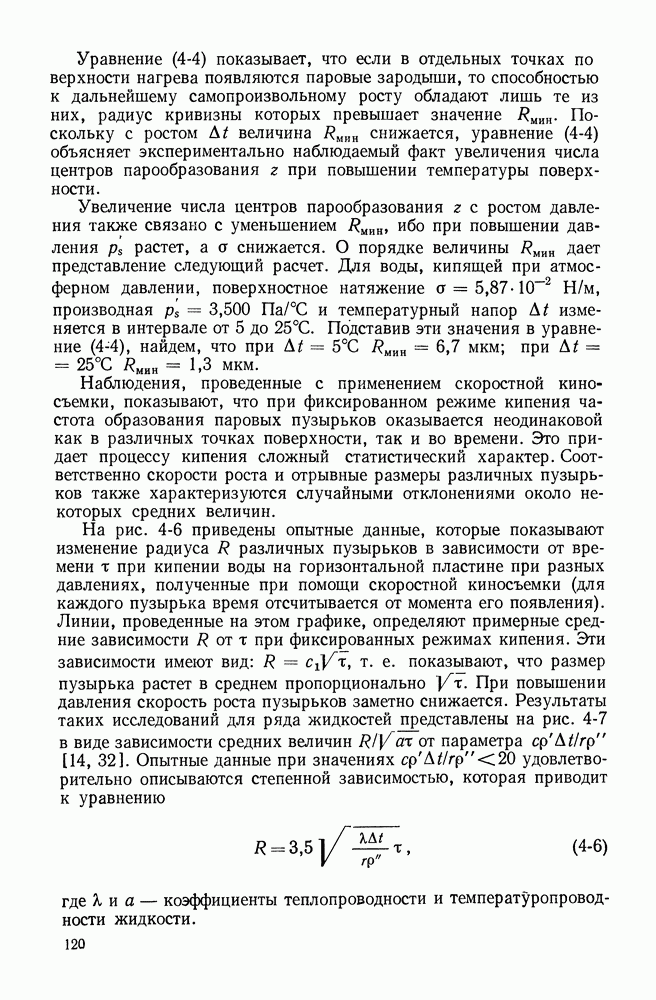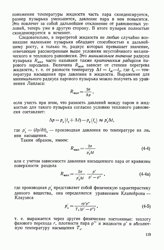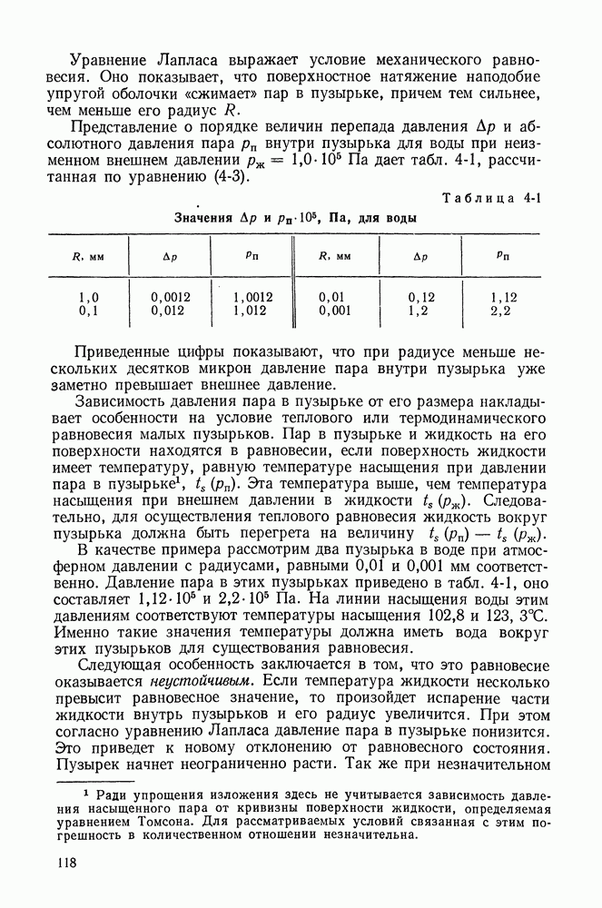 Приведенные цифры показывают, что при радиусе меньше нескольких десятков микрон давление пара внутри пузырька уже заметно превышает внешнее давление. Зависимость давления пара в пузырьке от его размера накладывает особенности на условие теплового или термодинамического равновесия малых пузырьков. Пар в пузырьке и жидкость на его поверхности находятся в равновесии, если поверхность жидкости имеет температуру, равную температуре насыщения при давлении пара в пузырьке В качестве примера рассмотрим два пузырька в воде при атмосферном давлении с радиусами, равными 0,01 и 0,001 мм соответственно. Давление пара в этих пузырьках приведено в табл. 4-1, оно составляет Следующая особенность заключается в том, что это равновесие оказывается неустойчивым. Если температура жидкости несколько превысит равновесное значение, то произойдет испарение части жидкости внутрь пузырьков и его радиус увеличится. При этом согласно уравнению Лапласа давление пара в пузырьке понизится. Это приведет к новому отклонению от равновесного состояния. Пузырек начнет неограниченно расти. Так же при незначительном понижении температуры жидкости часть пара сконденсируется, размер пузырька уменьшится, давление пара в нем повысится. Это повлечет за собой дальнейшее отклонение от равновесных условий, теперь уже в другую сторону. В итоге пузырек полностью сконденсируется и исчезнет. Следовательно, в перегретой жидкости не любые случайно возникшие маленькие пузырьки обладают способностью к дальнейшему росту, а только те, радиус которых превышает значение, отвечающее рассмотренным выше условиям неустойчивого механического и теплового равновесия. Это минимальное значение радиуса пузырька