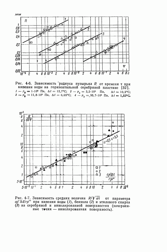 т. е. выражается через другие физические постоянные: теплоту фазового перехода Уравнение (4-4) показывает, что если в отдельных точках по верхности нагрева появляются паровые зародыши, то способностью к дальнейшему самопроизвольному росту обладают лишь те из них, радиус кривизны которых превышает значение Увеличение числа центров парообразования Наблюдения, проведенные с применением скоростной киносъемки, показывают, что при фиксированном режиме кипения частота образования паровых пузырьков оказывается неодинаковой как в различных точках поверхности, так и во времени. Это придает процессу кипения сложный статистический характер. Соответственно скорости роста и отрывные размеры различных пузырьков также характеризуются случайными отклонениями около некоторых средних величин. На рис. 4-6 приведены опытные данные, которые показывают изменение радиуса R различных пузырьков в зависимости от времени