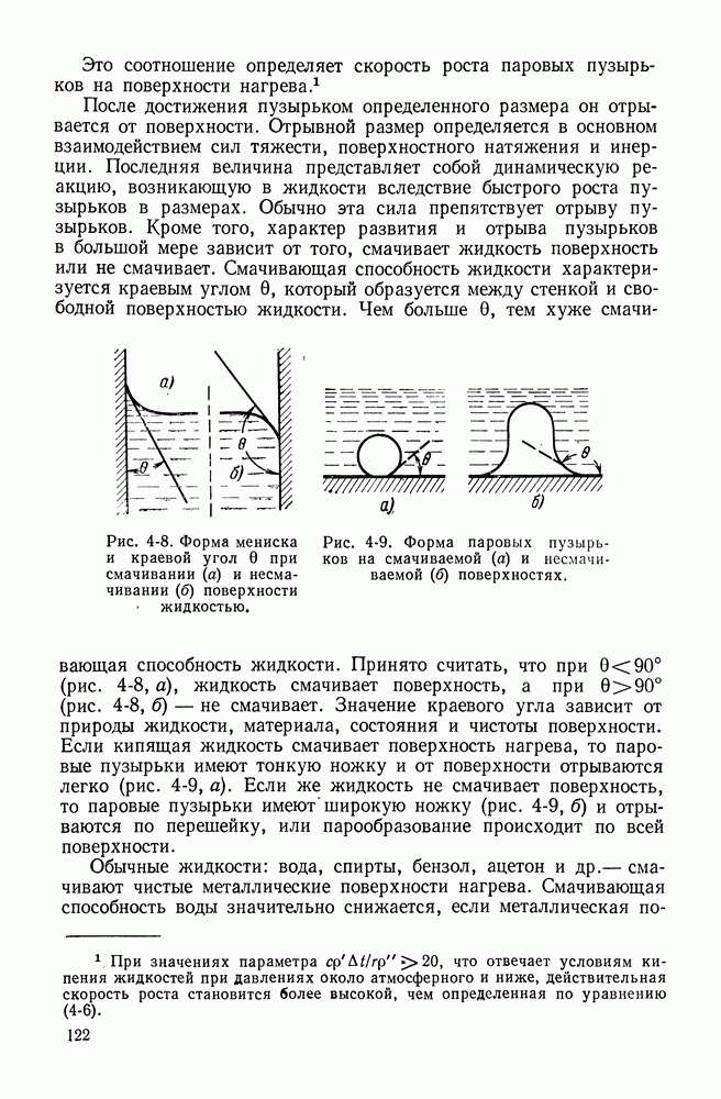 (кликните для просмотра скана) Это соотношение определяет скорость роста паровых пузырьков на поверхности нагрева. После достижения пузырьком определенного размера он отрывается от поверхности. Отрывной размер определяется в основном взаимодействием сил тяжести, поверхностного натяжения и инерции. Последняя величина представляет собой динамическую реакцию, возникающую в жидкости вследствие быстрого роста пузырьков в размерах. Обычно эта сила препятствует отрыву пузырьков. Кроме того, характер развития и отрыва пузырьков в большой мере зависит от того, смачивает жидкость поверхность или не смачивает. Смачивающая способность жидкости характеризуется краевым углом