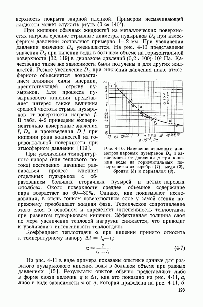 Рис. 4-10. Изменение отрывных диаметров паровых пузырьков При увеличении температурного напора (или теплового потока) постепенно начинает развиваться процесс слияния отдельных пузырьков с образованием больших вторичных пузырей и целых паровых «столбов». Около поверхности среднее объемное содержание пара возрастает до 60—80%. Однако, как показывают исследования, в очень тонком поверхностном слое у самой стенки по-прежнему преобладает жидкая фаза. Термическое сопротивление этого слоя в основном и определяет интенсивность теплоотдачи при развитом пузырьковом кипении. Эффективная толщина слоя по мере увеличения тепловой нагрузки снижается, что приводит к увеличению интенсивности теплоотдачи. Коэффициент теплоотдачи а при кипении принято относить к температурному напору