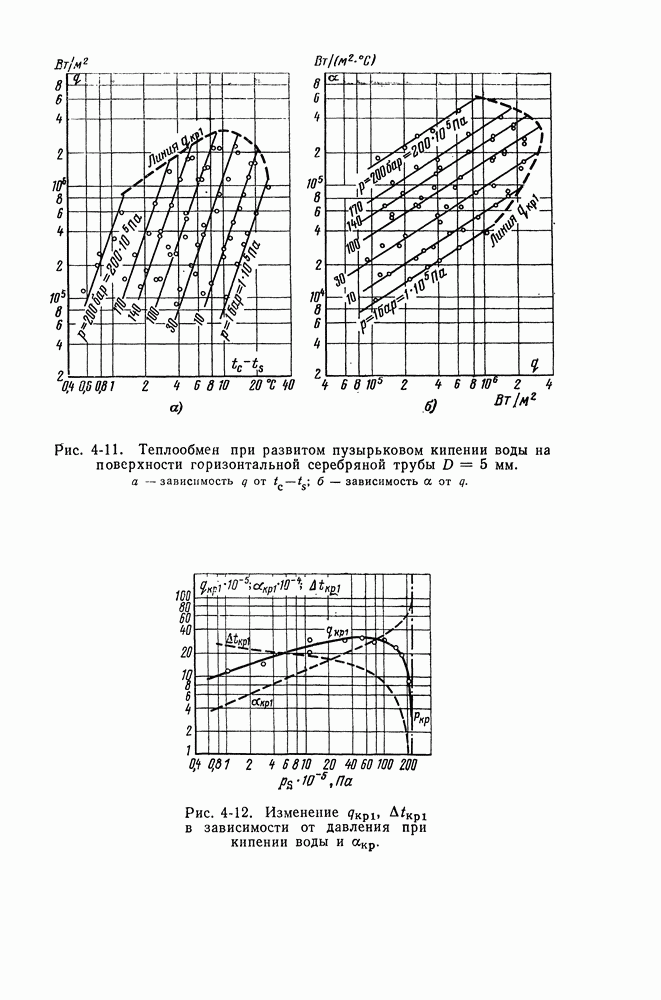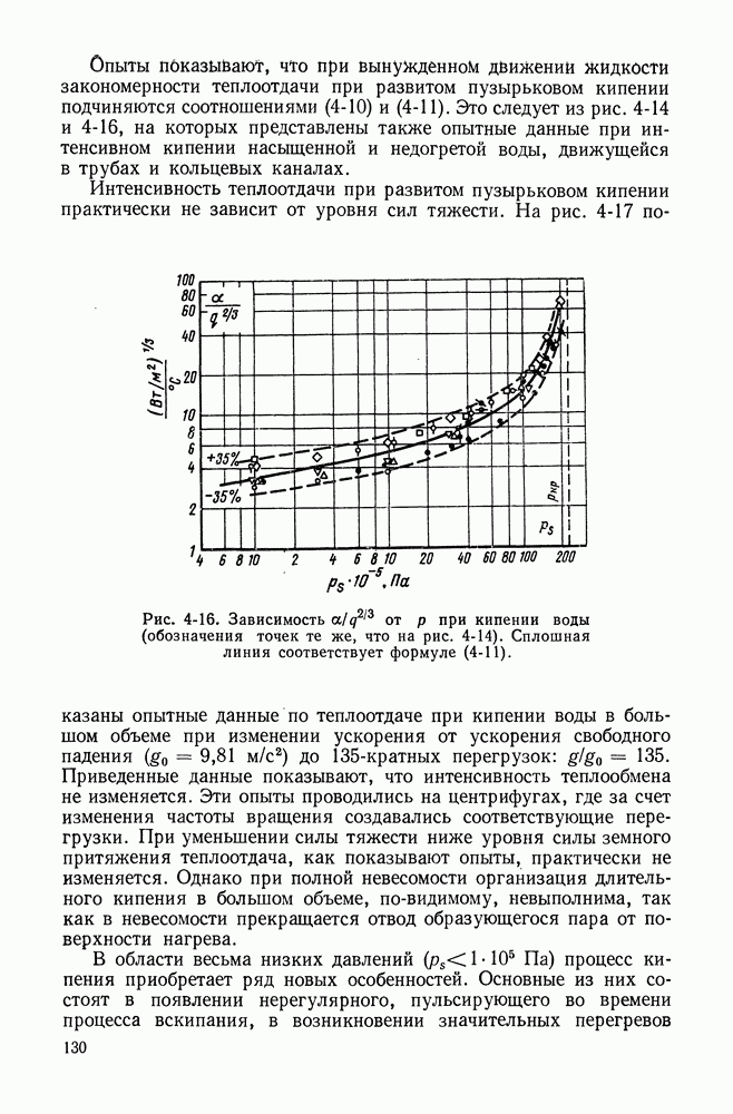 На рис. 4-11 в виде примера показаны опытные данные для развитого пузырькового кипения воды в большом объеме при разных давлениях [15]. Результаты опытов обычно представляют либо в форме связи величин q и Таблица 4-2. Значения