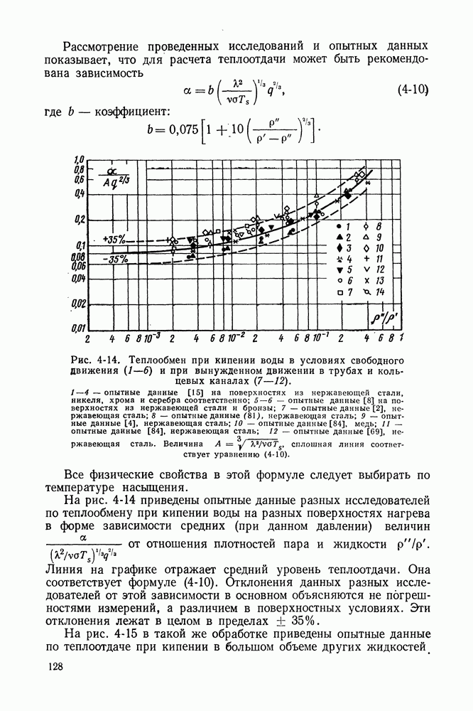 Рис. 4-15. Теплообмен при кипении различных жидкостей в условиях свободного движения. Бензол: 1—3 — данные [15], нержавеющая сталь, никель, серебро соответственно 4 — данные [104], хромированная поверхность; 5 — данные [107], нержавеющая сталь; гептан: 6 — данные [104]; этиловый спирт: 7 — данные [104]; 8 — 10 — данные [8]; фреон-12: 11 — данные [77], нержавеющая сталь; фреон-22: 12 — данные [77], нержавеющая сталь; аммиак: 13 — данные [23]. нержавеющая сталь; дифенил: 14 — данные [107], нержавеющая сталь. Величина Опыты показывают, что при вынужденном движении жидкости закономерности теплоотдачи при развитом пузырьковом кипении подчиняются соотношениями (4-10) и (4-11). Это следует из рис. 4-14 и 4-16, на которых представлены также опытные данные при интенсивном кипении насыщенной и недогретой воды, движущейся в трубах и кольцевых каналах.