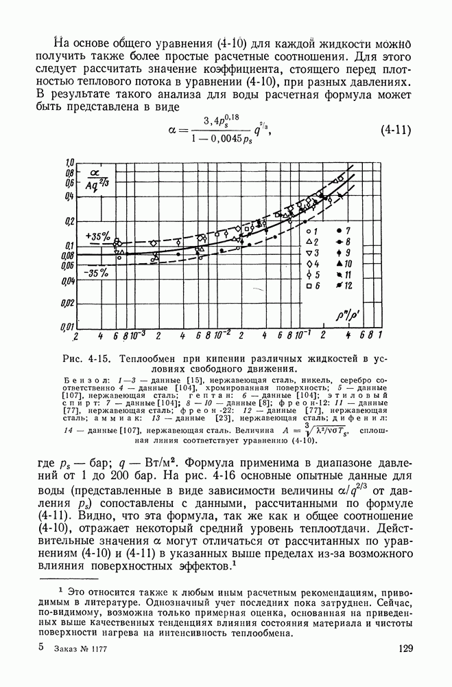 Рис. 4-14. Теплообмен при кипении воды в условиях свободного движения (1—6) и при вынужденном движении в трубах и кольцевых каналах (7—12). 1—4 — опытные данные [15] на поверхностях из нержавеющей стали, никеля, хрома и серебра соответственно; 5—6 — опытные данные [8] на поверхностях из нержавеющей стали и бронзы; 7 — опытные данные [2], нержавеющая сталь; 5 — опытные данные (81), нержавеющая сталь; 9 — опытные данные [4], нержавеющая сталь; 10 — опытные данные [84], медь; 11 — опытные данные [84], нержавеющая сталь; 12 — опытные данные [69], нержавеющая сталь. Величина Все физические свойства в этой формуле следует выбирать по температуре насыщения. На рис. 4-14 приведены опытные данные разных исследователей по теплообмену при кипении воды на разных поверхностях нагрева в форме зависимости средних (при данном давлении) величин На рис. 4-15 в такой же обработке приведены опытные данные по теплоотдаче при кипении в большом объеме других жидкостей. На основе общего уравнения (4-10) для каждой жидкости можно получить также более простые расчетные соотношения. Для этого следует рассчитать значение коэффициента, стоящего перед плотностью теплового потока в уравнении (4-10), при разных давлениях. В результате такого анализа для воды расчетная формула может быть представлена в виде