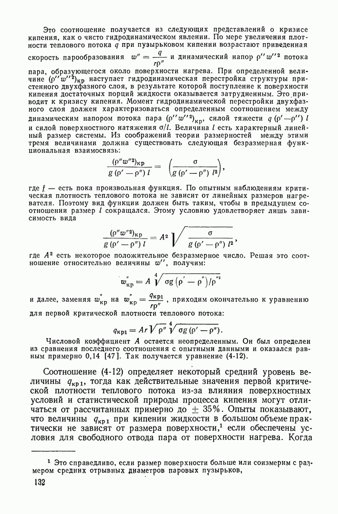 Это соотношение получается из следующих представлений о кризисе кипения, как о чисто гидродинамическом явлении. По мере увеличения плотности теплового потока q при пузырьковом кипении возрастают приведенная скорость парообразования