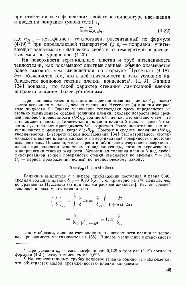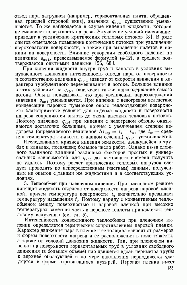 Числовой коэффициент А остается неопределенным. Он был определен из сравнения последнего соотношения с опытными данными и оказался равным примерно 0,14 [47]. Так получается уравнение (4-12). Соотношение (4-12) определяет некоторый средний уровень величины Когда отвод пара затруднен (например, горизонтальная плита, обращенная греющей стороной вниз), значения При кипении жидкости внутри труб и каналов в условиях вынужденного движения интенсивность отвода пара от поверхности и соответственно величина Исследованиям кризиса кипения жидкости, движущейся в трубах и каналах, посвящено большое число работ. Однако из-за сложного взаимного влияния различных факторов простых и универсальных зависимостей для 3. Теплообмен при пленочном кипении. При пленочном режиме кипящая жидкость отделена от поверхности нагрева паровой пленкой, причем температура поверхности Интенсивность конвективного теплообмена при пленочном кипении определяется термическим сопротивлением паровой пленки. Характер движения пара в пленке и ее толщина зависят от размеров и формы поверхности нагрева и ее расположения в поле тяжести, а также от условий движения жидкости. Так, при пленочном кипении на поверхности горизонтальных труб в условиях свободного движения (в большом объеме) пар движется вдоль периметра трубы к верхней образующей и по мере накопления периодически удаляется в форме отрывающихся пузырей. Паровая пленка имеет толщину, измеряемую долями миллиметра, а движение пара в ней носит ламинарный характер. Средние коэффициенты теплоотдачи составляют примерно 100—300 Вт/(м2•°С). Расчет теплоотдачи при пленочном кипении на горизонтальных трубах в большом объеме следует проводить по формуле