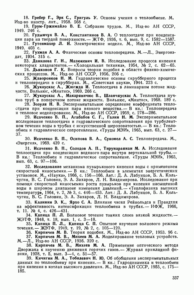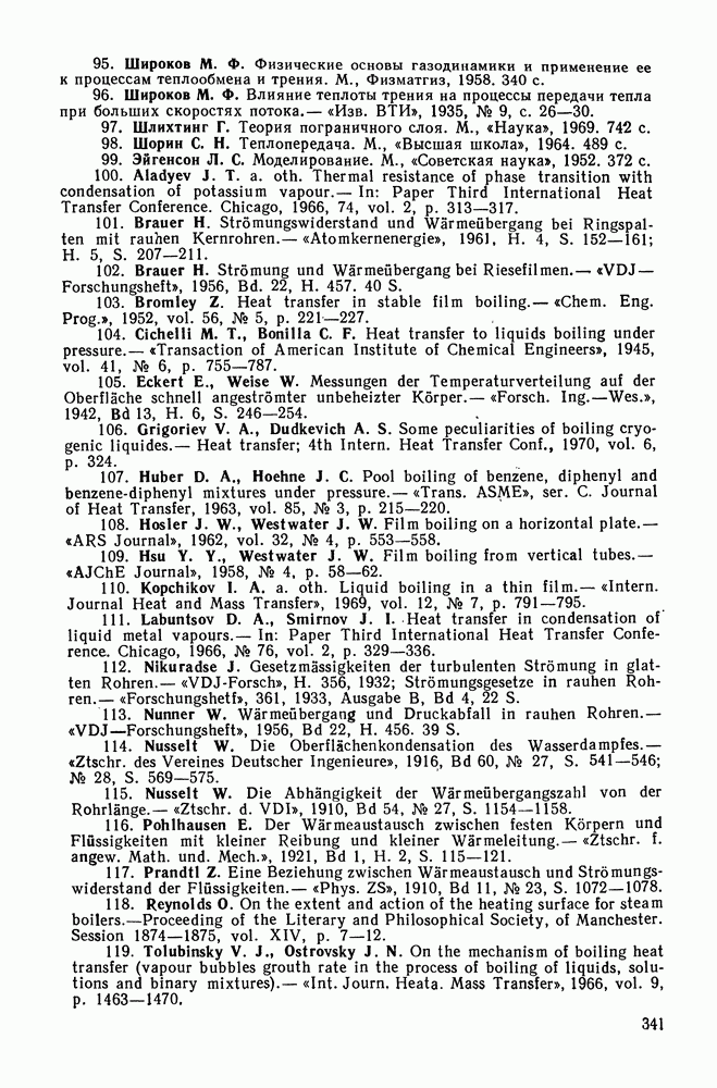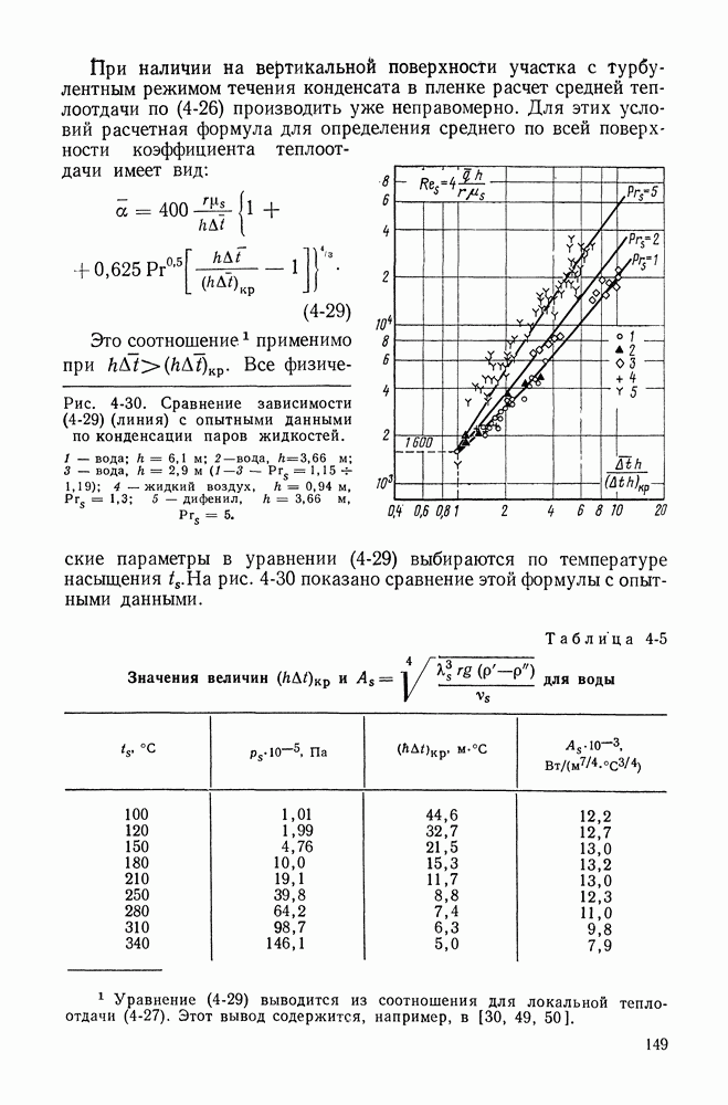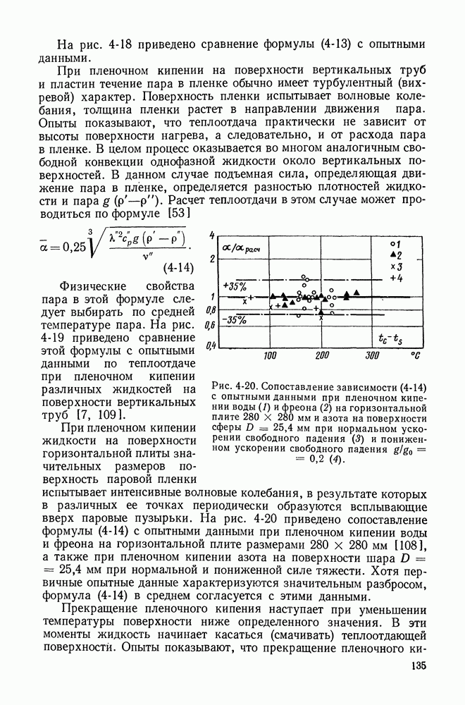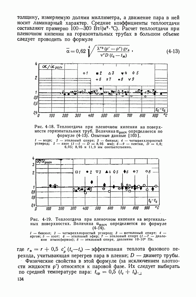 Физические свойства пара в этой формуле следует выбирать по средней температуре пара. На рис. 4-19 приведено сравнение этой формулы с опытными данными по теплоотдаче при пленочном кипении различных жидкостей на поверхности вертикальных труб [7, 109].