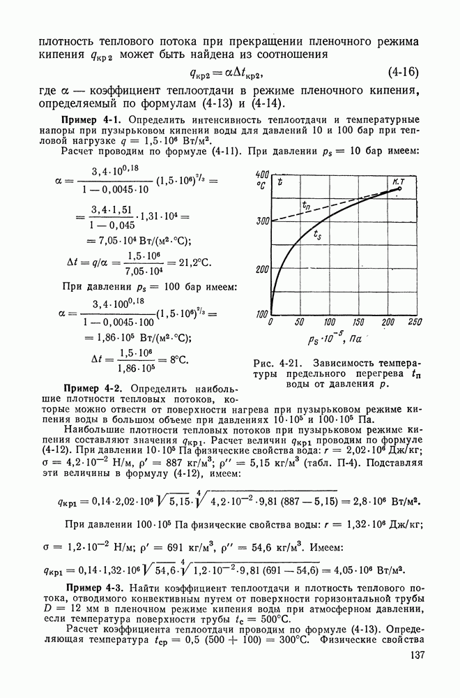 Рис. 4-21. Зависимость температуры предельного перегрева Наибольшие плотности тепловых потоков при пузырьковом режиме кипения составляют значения