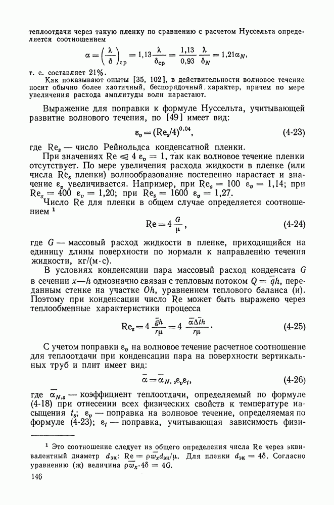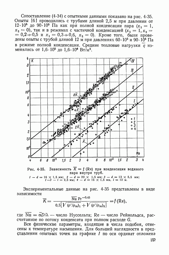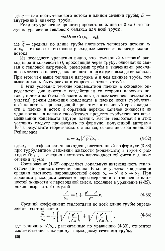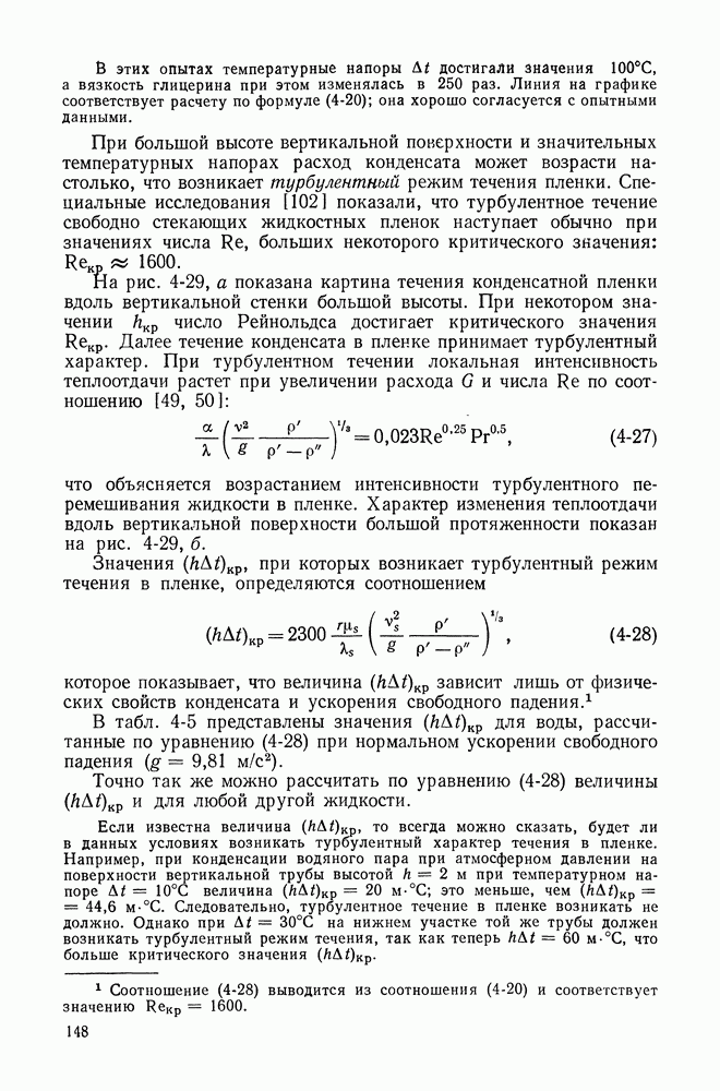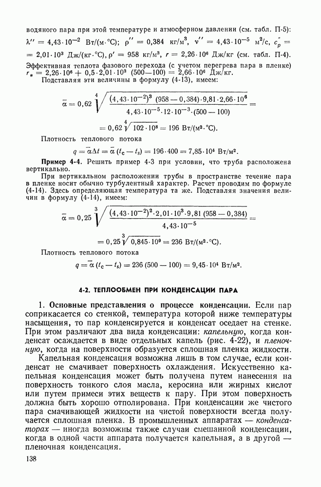Пример 4-4. Решить пример 4-3 при условии, что труба расположена вертикально. При вертикальном расположении трубы в пространстве течение пара в пленке носит обычно турбулентный характер. Расчет проводим по формуле (4-14). Здесь определяющая температура та же. Подставляя значения величин в формулу (4-14), имеем: