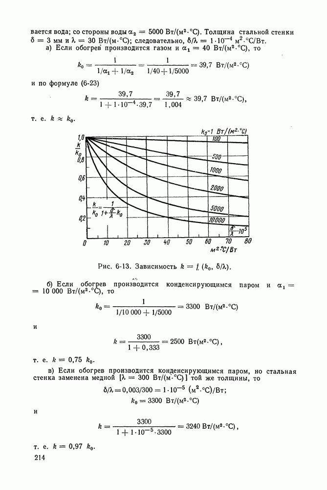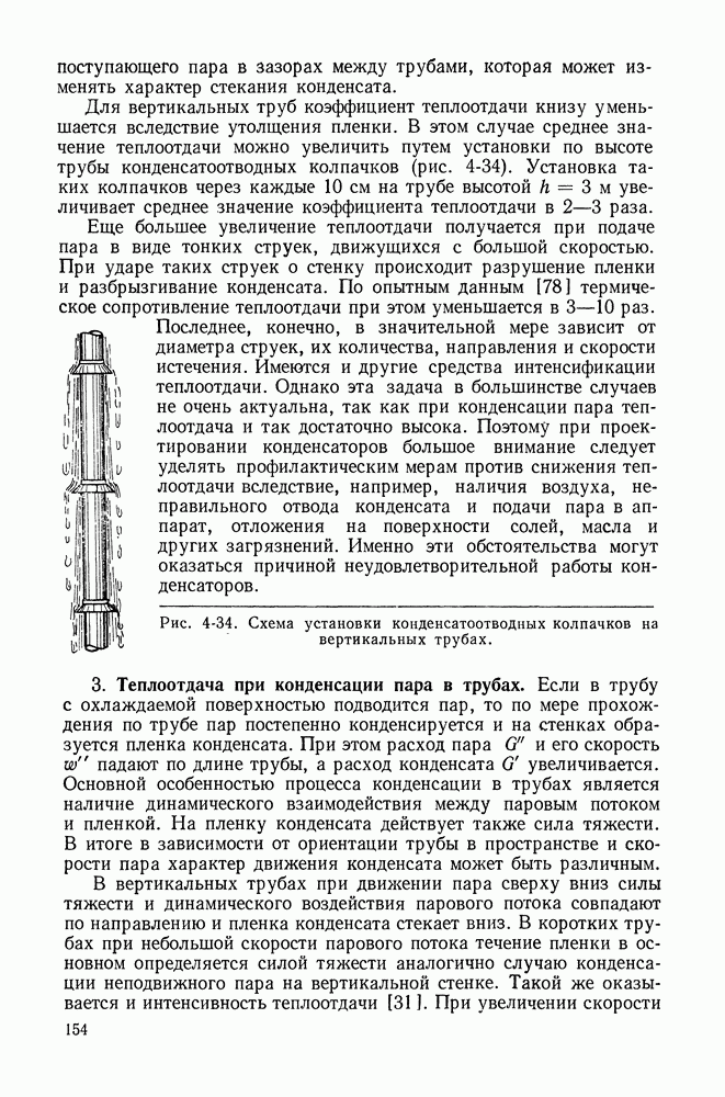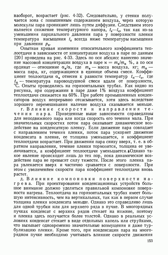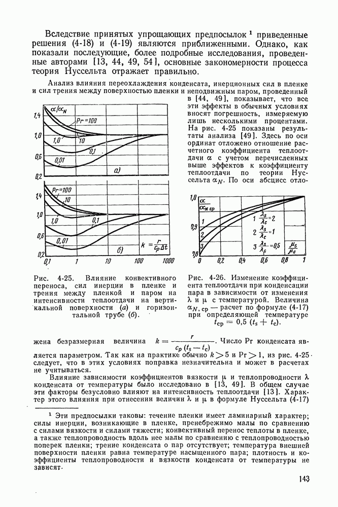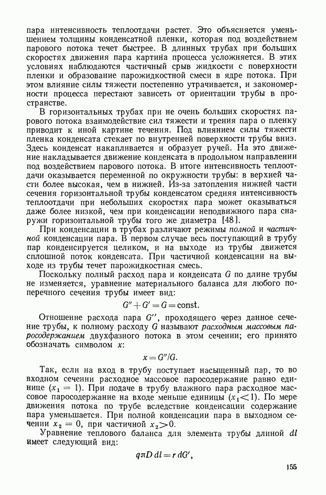 Пример 4-4. Решить пример 4-3 при условии, что труба расположена вертикально. При вертикальном расположении трубы в пространстве течение пара в пленке носит обычно турбулентный характер. Расчет проводим по формуле (4-14). Здесь определяющая температура та же. Подставляя значения величин в формулу (4-14), имеем: