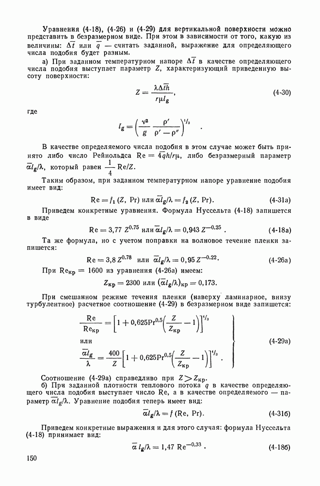 Рис. 4-19. Теплоотдача при пленочном кипении на вертикальных поверхностях. Величина На рис. 4-18 приведено сравнение формулы (4-13) с опытными данными. При пленочном кипении на поверхности вертикальных труб и пластин течение пара в пленке обычно имеет турбулентный (вихревой) характер. Поверхность пленки испытывает волновые колебания, толщина пленки растет в направлении движения пара. Опыты показывают, что теплоотдача практически не зависит от высоты поверхности нагрева, а следовательно, и от расхода пара в пленке. В целом процесс оказывается во многом аналогичным свободной конвекции однофазной жидкости около вертикальных поверхностей. В данном случае подъемная сила, определяющая движение пара в плёнке, определяется разностью плотностей жидкости и пара