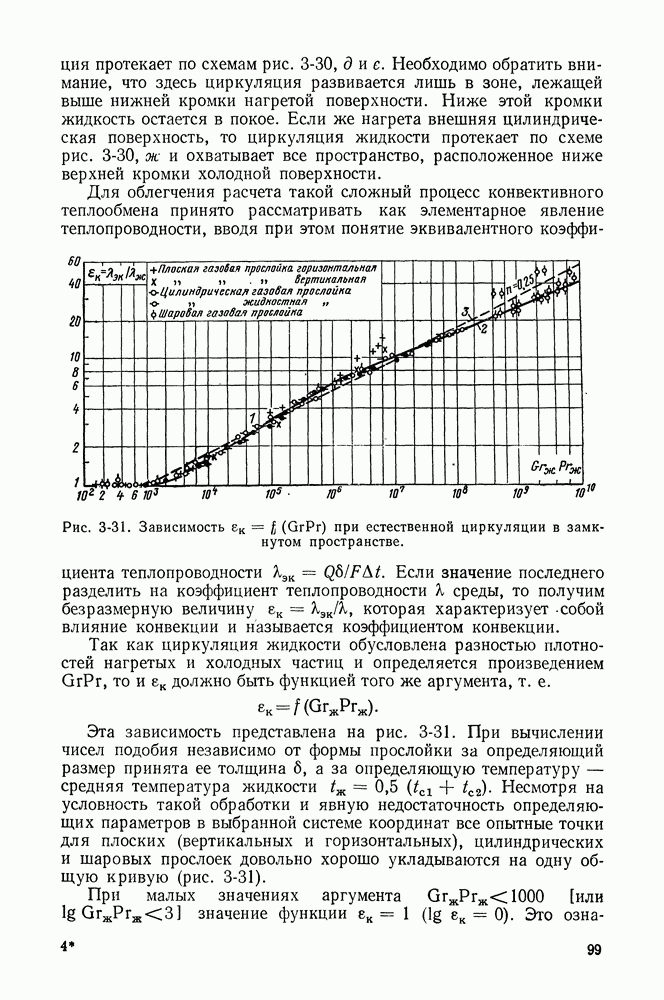Рис. 4-20. Сопоставление зависимости (4-14) с опытными данными при пленочном кипении воды (1) и фреона (2) на горизонтальной плите 280 X 280 мм и азота на поверхности сферы D = 25,4 мм при нормальном ускорении свободного падения (5) и пониженном ускорении свободного падения При пленочном кипении жидкости на поверхности горизонтальной плиты значительных размеров поверхность паровой пленки испытывает интенсивные волновые колебания, в результате которых в различных ее точках периодически образуются всплывающие вверх паровые пузырьки. На рис. 4-20 приведено сопоставление формулы (4-14) с опытными данными при пленочном кипении воды и фреона на горизонтальной плите размерами 280 х 280 мм [108], а также при пленочном кипении азота на поверхности шара D = 25,4 мм при нормальной и пониженной силе тяжести. Хотя первичные опытные данные характеризуются значительным разбросом, формула (4-14) в среднем согласуется с этими данными. Прекращение пленочного кипения наступает при уменьшении температуры поверхности ниже определенного значения. В эти моменты жидкость начинает касаться (смачивать) теплоотдающей поверхности. Таблица 4-3. Значения предельных температур