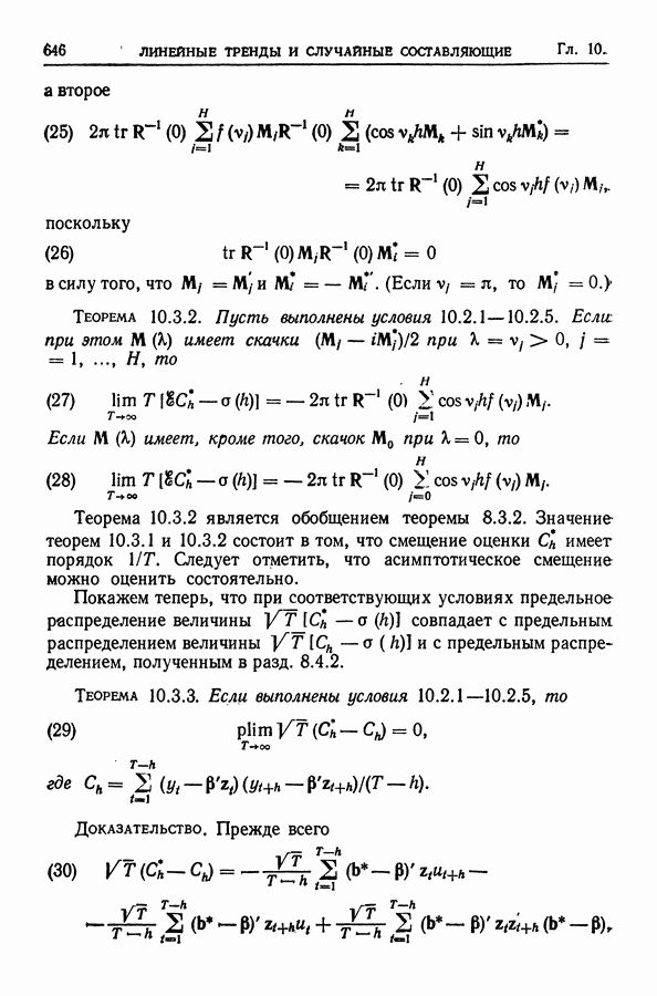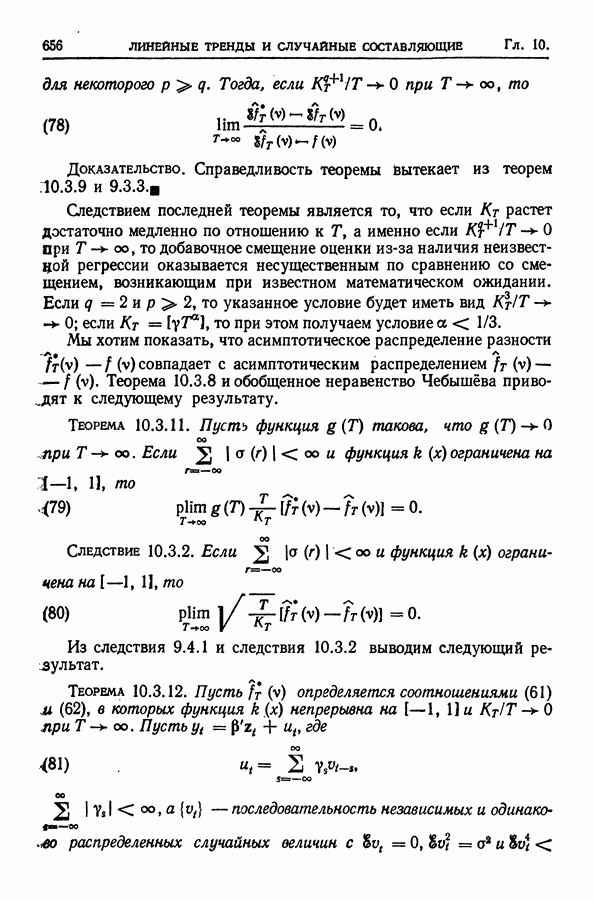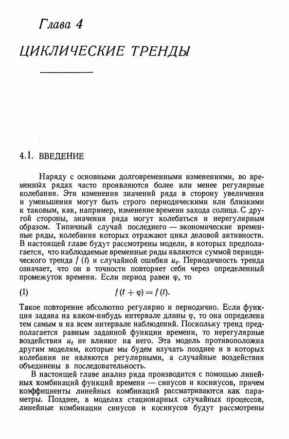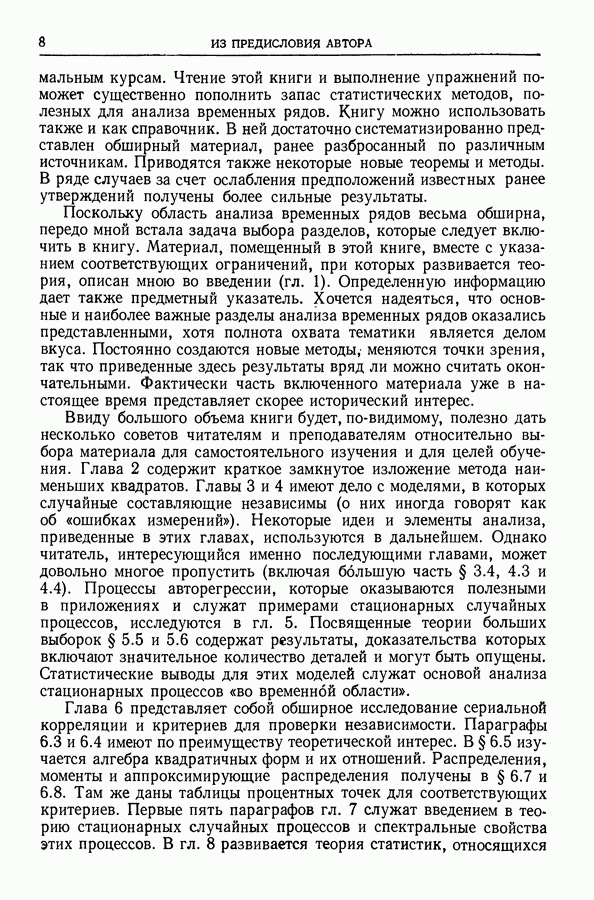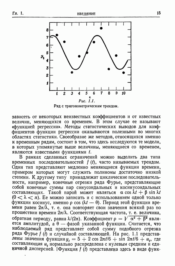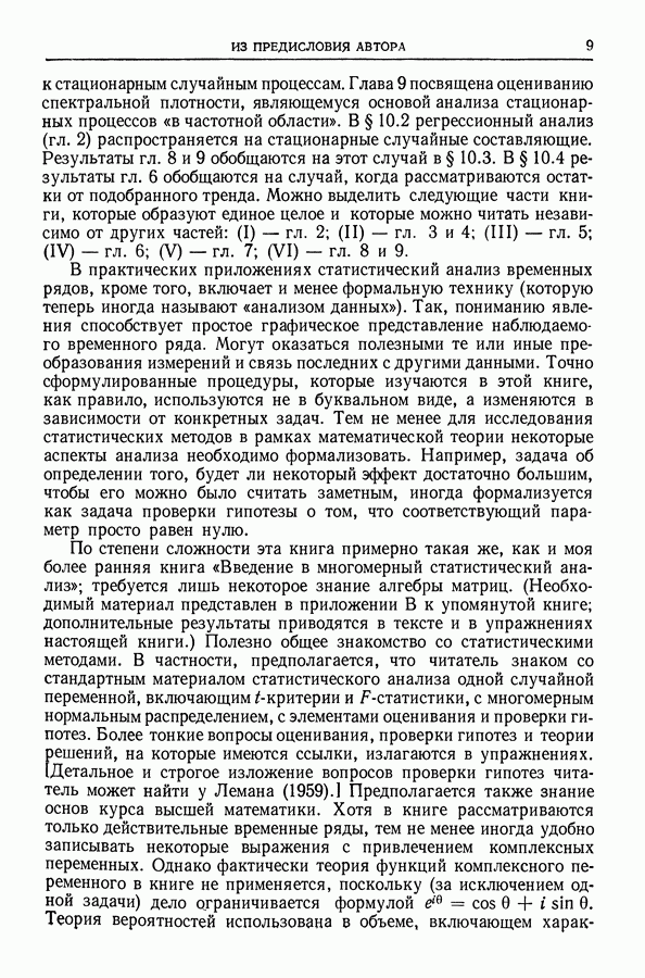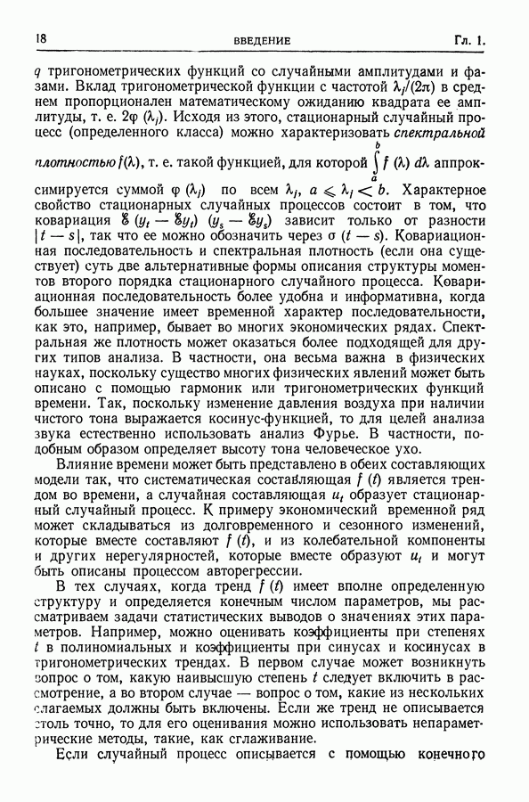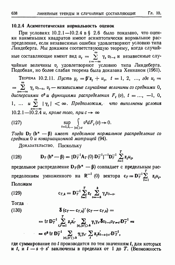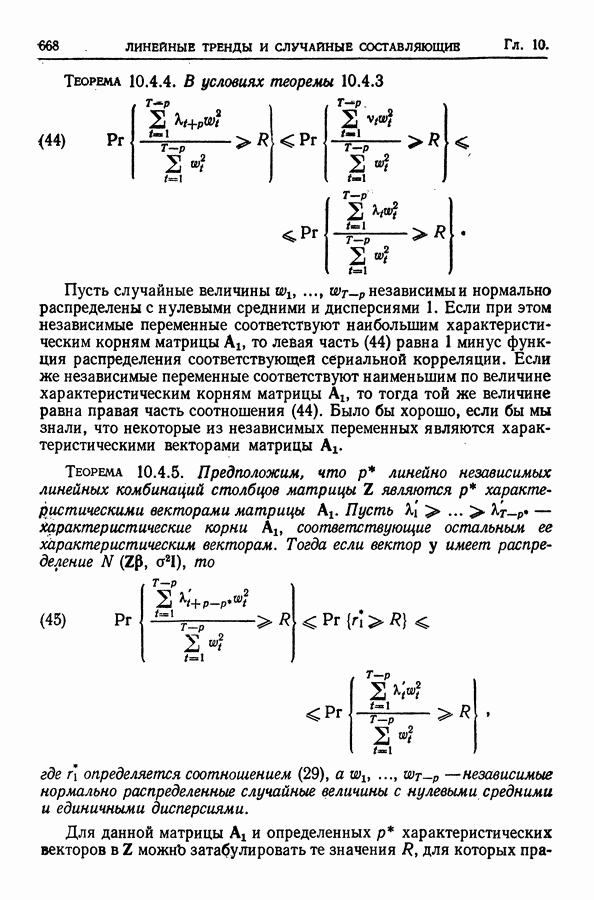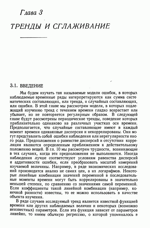 В гл. 10 изучаются статистические процедуры, используемые при анализе тренда в предположении, что случайные составляющие образуют стационарный случайный процесс. При изложении регрессионного анализа определенное место уделяется асимптотической теории, которую можно использовать и при нарушении предположения о нормальном распределении случайных составляющих (§ 2.6).