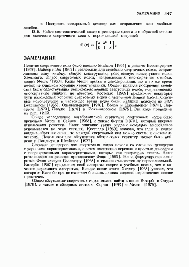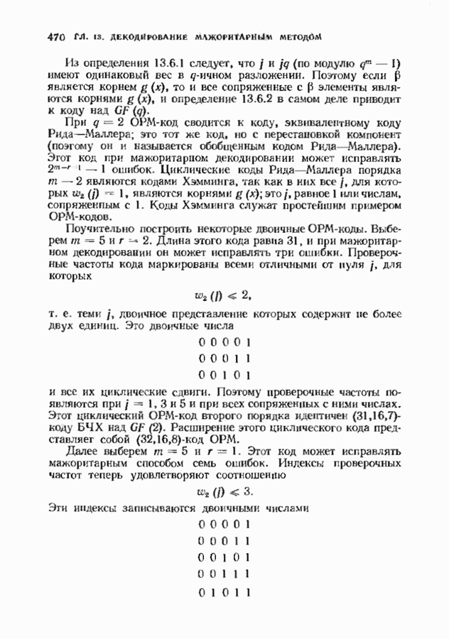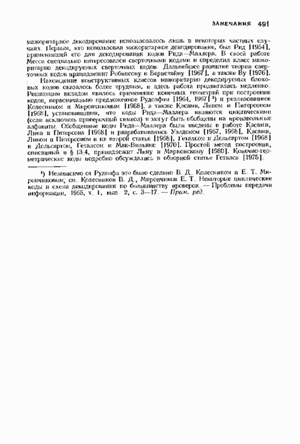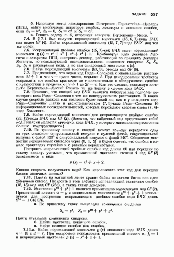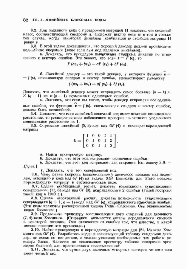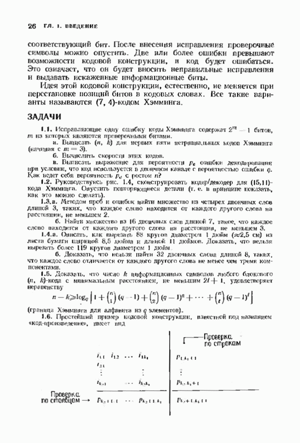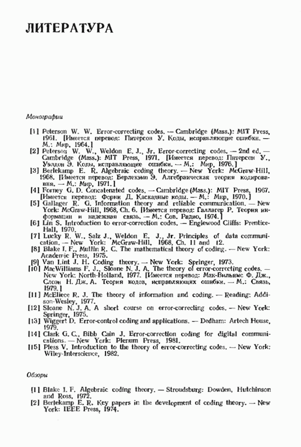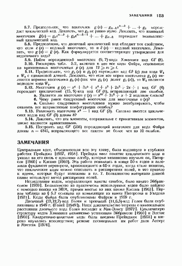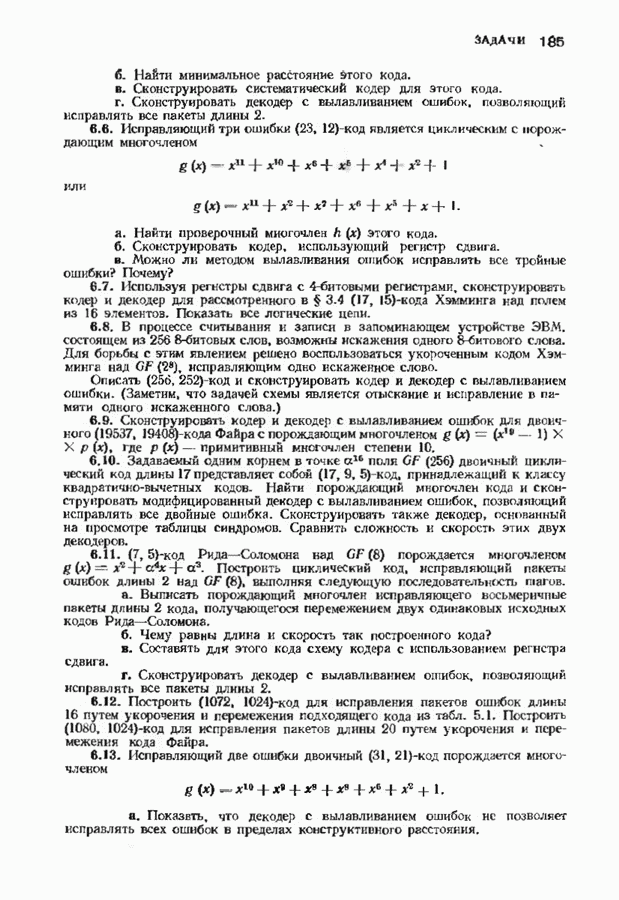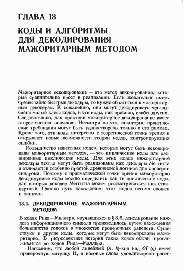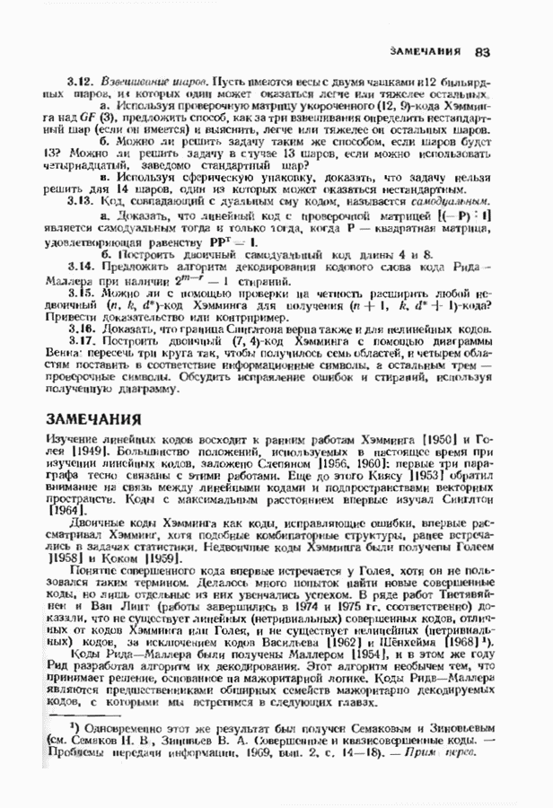 Если произошла только одна ошибка, то одна из оценок, даваемых проверочными суммами, будет неверна; мажоритарное решение дает значение Аналогично может быть продекодирован любой информационный символ, который умножается на одну из строк матрицы После того как эти информационные символы найдены, их вклад в кодовое слово вычитается из принятого слова. Это эквивалентно тому, что мы получаем слово кода Рида — Маллера Этот процесс повторяется до тех пор, пока не будут найдены все информационные биты. ЗАДАЧИ(см. скан) (см. скан) (см. скан) ЗАМЕЧАНИЯИзучение линейных кодов восходит к ранним работам Хэмминга [1950] и Голея 119491. Большинство положений, используемых в настоящее время при изучении линейных колов, заложено Слепяном [1956, 1960]: первые три параграфа тесно связаны с этими работами. Еще до этого Киксу 119537 обратил внимание на связь между линейными кодами и подпространствами векторных пространств. Коды с максимальным расстоянием впервые изучал Синглтон Двоичные коды Хэмминга как коды, исправляющие ошибки, впервые рассматривал Хэмминг, хотя подобные комбнпаторные структуры, рацее встречались в задачах статистики. Недвоичные коды Хэмминга были получены Голсем [1958] и Коком [1959]. Понятие совершенного кода впервые истречается у Голея, хотя он не пользовался таким термином. Делалось много попыток найти новые совершенные коды, но лишь отдельные из них увенчались успехом. В ряде работ Тиотявяйнен и Ван Лиит (работы завершились в 1974 и 1975 гг. соответственно) доказали, что не существует линейных (нетривиальных) совершенных кодов, отличных от кодов Хэмминга или Голея, и не существует нелинейных (нетривиальных) кодов, за исключением кодоп Васильева [1962] и Шёнхейма [1968]. Коды Рида-Маллера были получены Маллером [1954], и в этом же году Рид разработал алгоритм их декодирования. Этот алгоритм необычем тем, что принимает решение, основанное «а мажоритарной логике. Коды Рида-Маллера являются предшественниками обширных семейств мажоритарно декодируемых кодов, с которыми мы встретимся в следующих главах.