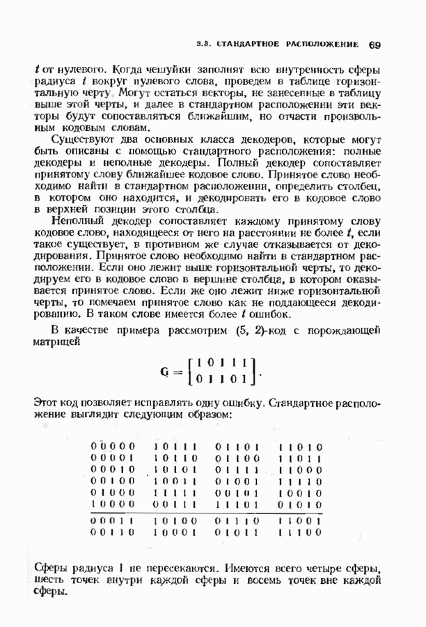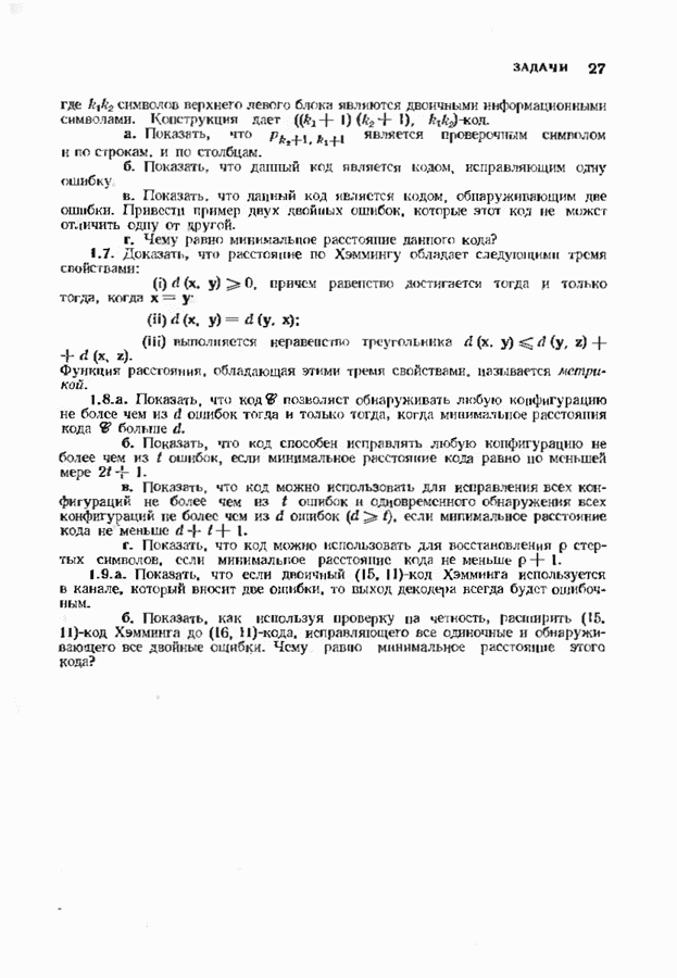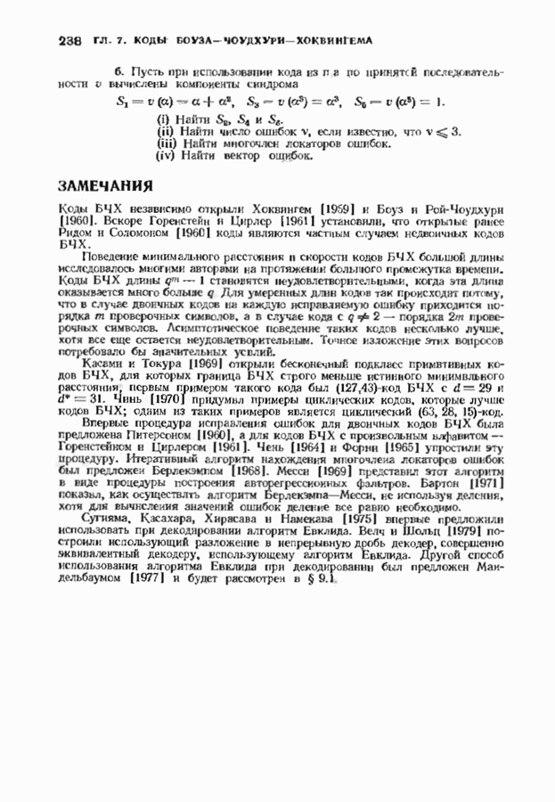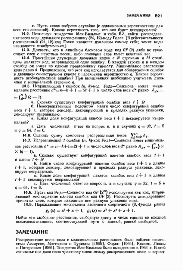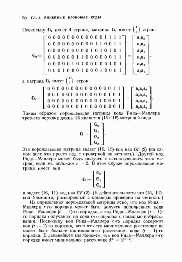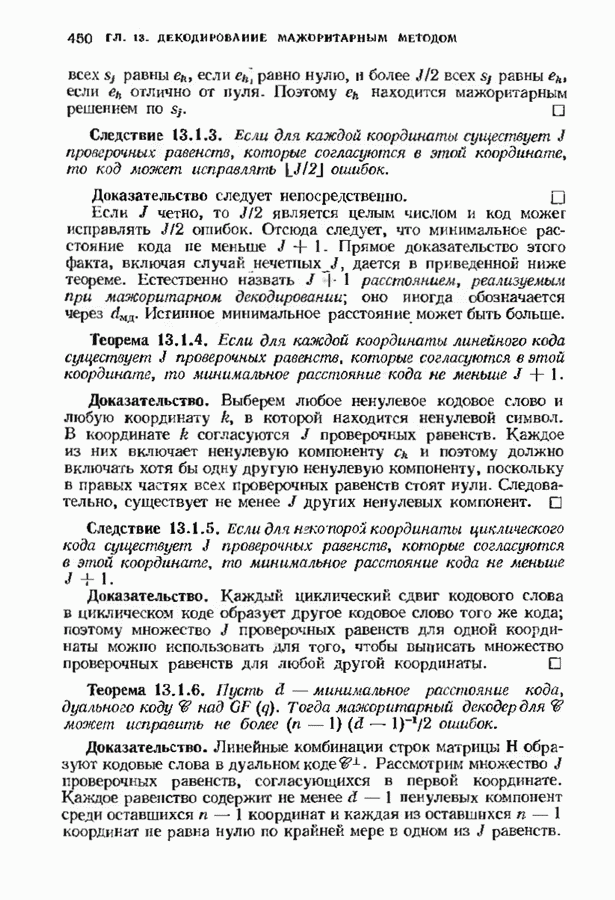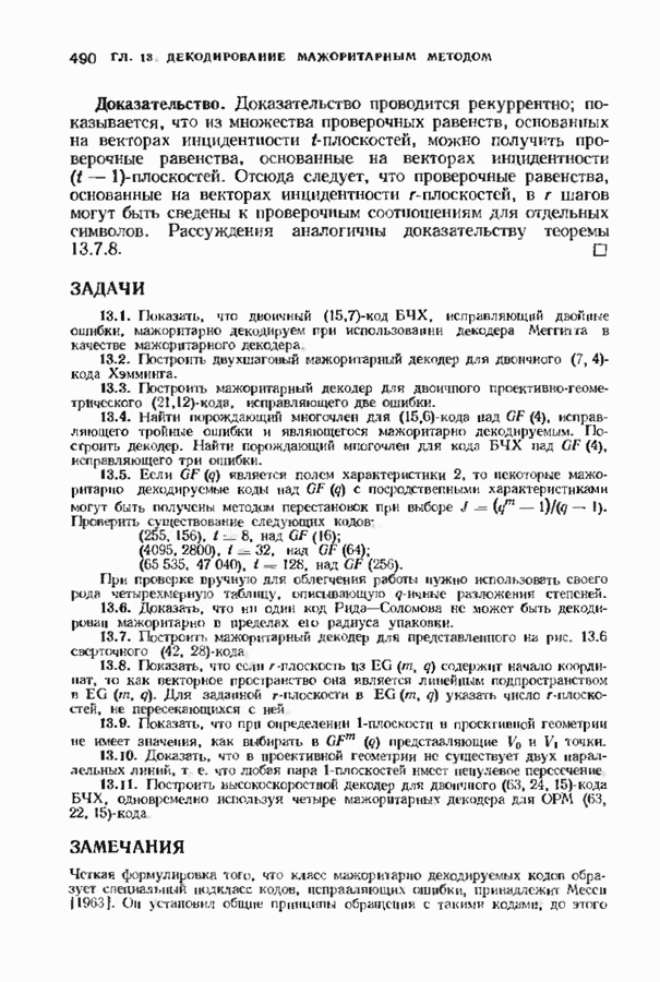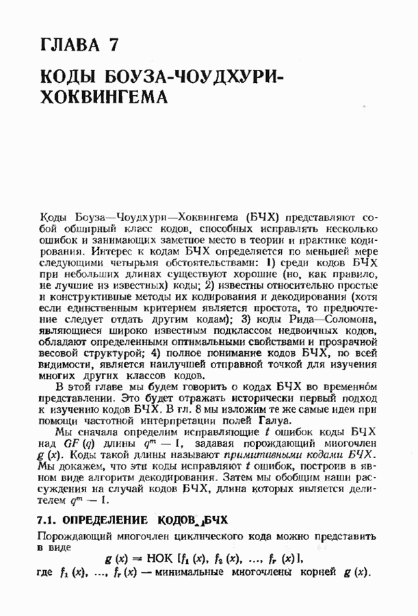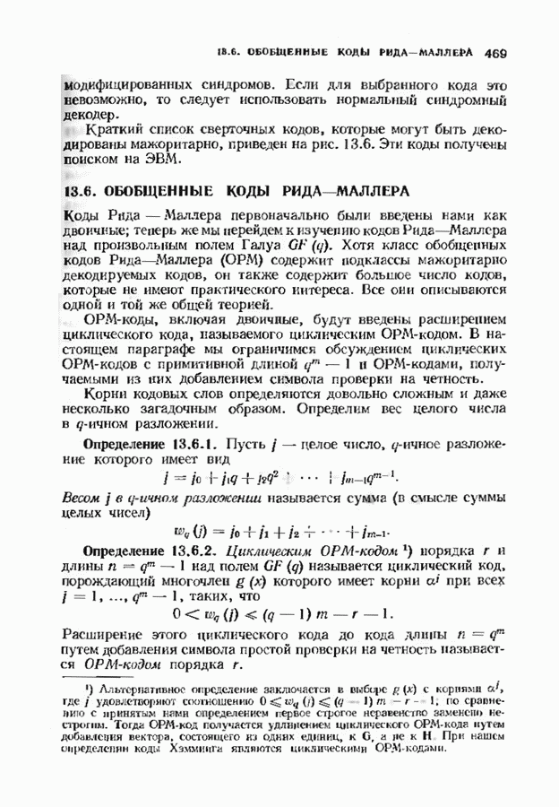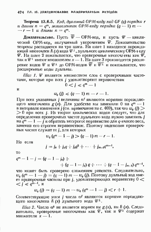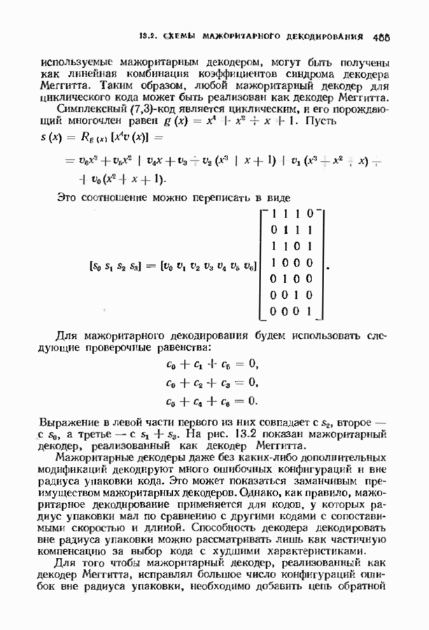 Если произошла только одна ошибка, то одна из оценок, даваемых проверочными суммами, будет неверна; мажоритарное решение дает значение Аналогично может быть продекодирован любой информационный символ, который умножается на одну из строк матрицы После того как эти информационные символы найдены, их вклад в кодовое слово вычитается из принятого слова. Это эквивалентно тому, что мы получаем слово кода Рида — Маллера Этот процесс повторяется до тех пор, пока не будут найдены все информационные биты. ЗАДАЧИ(см. скан) (см. скан) (см. скан) ЗАМЕЧАНИЯИзучение линейных кодов восходит к ранним работам Хэмминга [1950] и Голея 119491. Большинство положений, используемых в настоящее время при изучении линейных колов, заложено Слепяном [1956, 1960]: первые три параграфа тесно связаны с этими работами. Еще до этого Киксу 119537 обратил внимание на связь между линейными кодами и подпространствами векторных пространств. Коды с максимальным расстоянием впервые изучал Синглтон Двоичные коды Хэмминга как коды, исправляющие ошибки, впервые рассматривал Хэмминг, хотя подобные комбнпаторные структуры, рацее встречались в задачах статистики. Недвоичные коды Хэмминга были получены Голсем [1958] и Коком [1959]. Понятие совершенного кода впервые истречается у Голея, хотя он не пользовался таким термином. Делалось много попыток найти новые совершенные коды, но лишь отдельные из них увенчались успехом. В ряде работ Тиотявяйнен и Ван Лиит (работы завершились в 1974 и 1975 гг. соответственно) доказали, что не существует линейных (нетривиальных) совершенных кодов, отличных от кодов Хэмминга или Голея, и не существует нелинейных (нетривиальных) кодов, за исключением кодоп Васильева [1962] и Шёнхейма [1968]. Коды Рида-Маллера были получены Маллером [1954], и в этом же году Рид разработал алгоритм их декодирования. Этот алгоритм необычем тем, что принимает решение, основанное «а мажоритарной логике. Коды Рида-Маллера являются предшественниками обширных семейств мажоритарно декодируемых кодов, с которыми мы встретимся в следующих главах.