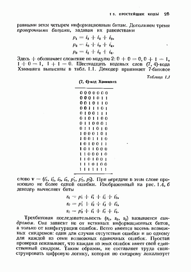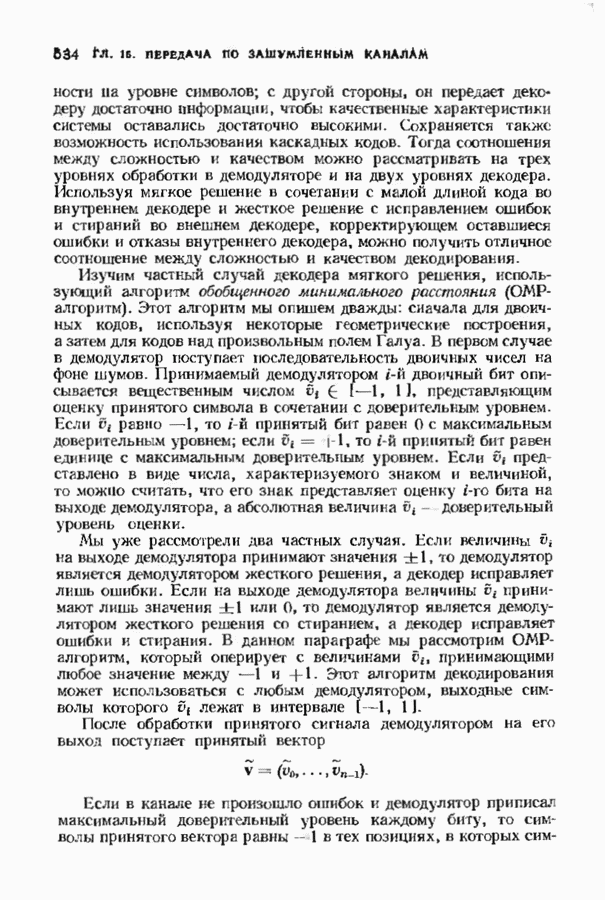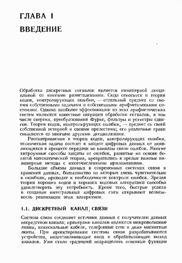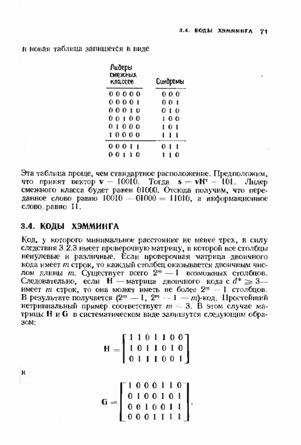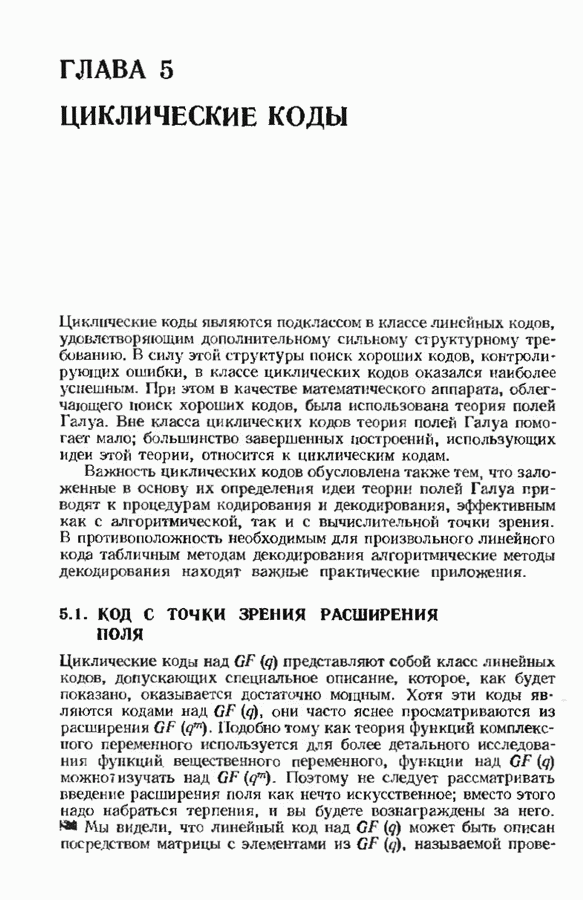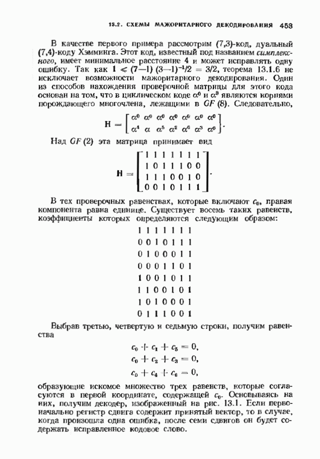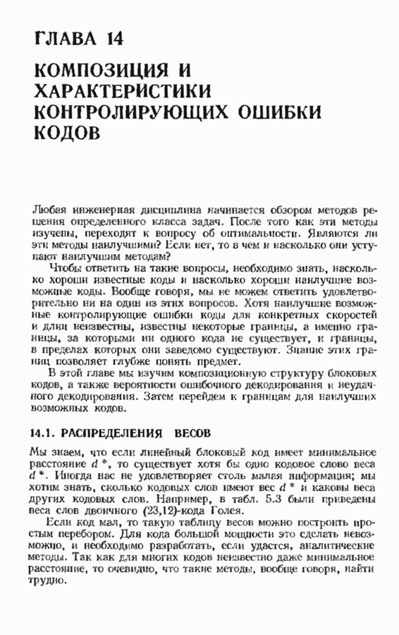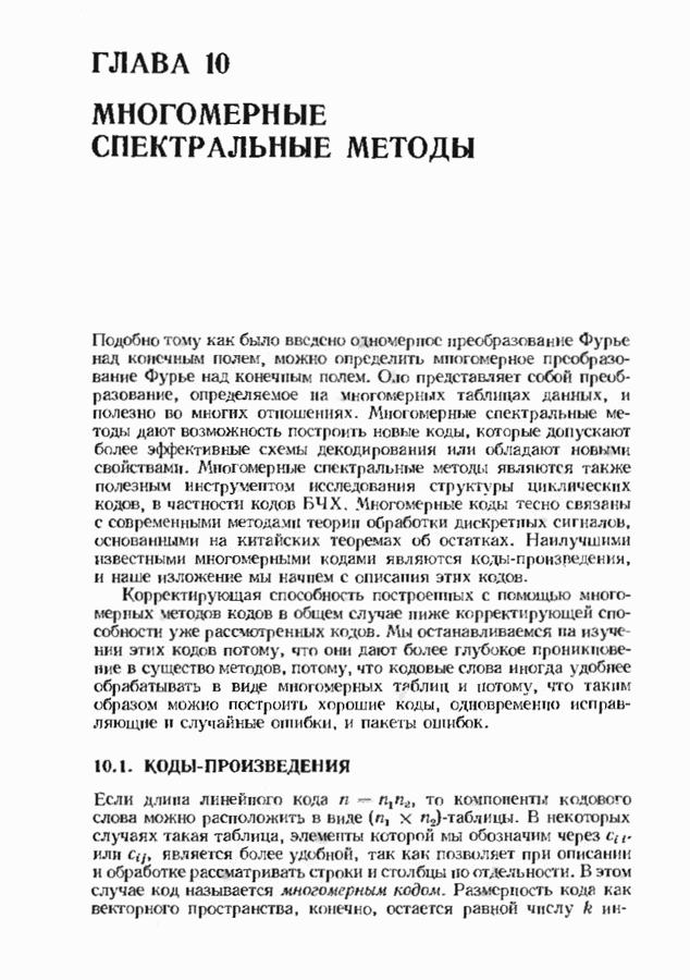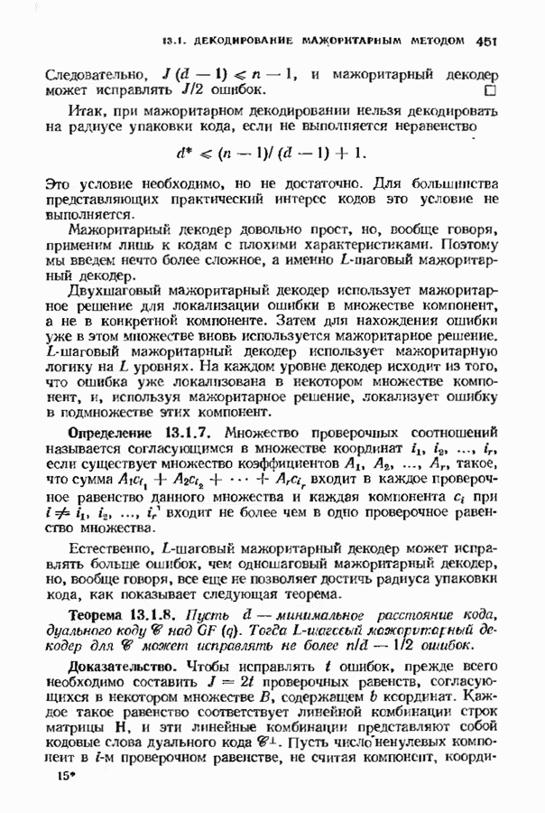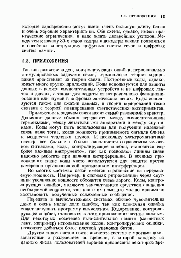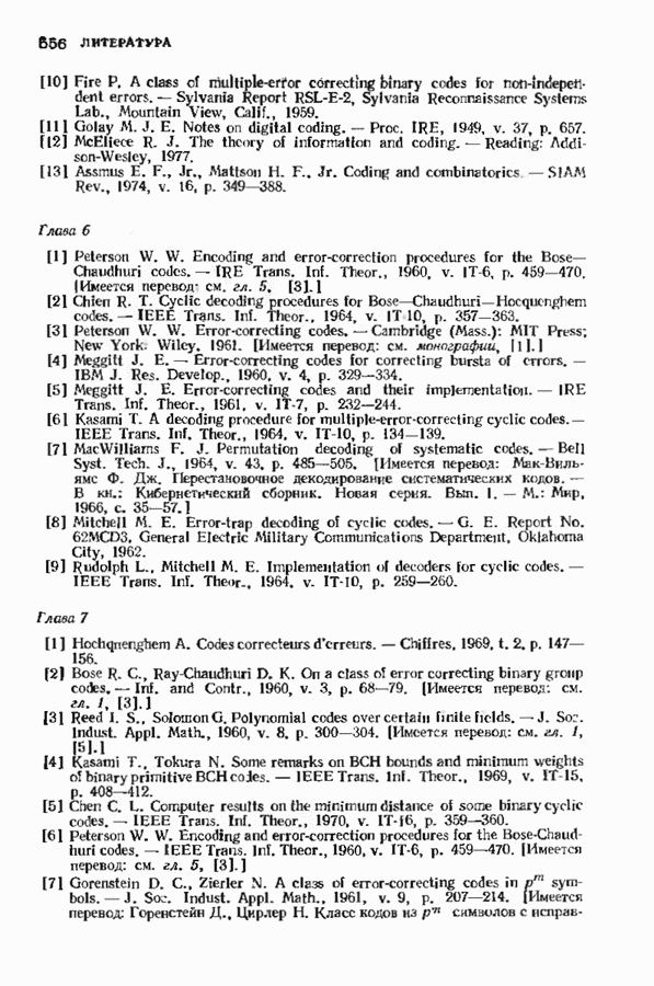 Если произошла только одна ошибка, то одна из оценок, даваемых проверочными суммами, будет неверна; мажоритарное решение дает значение Аналогично может быть продекодирован любой информационный символ, который умножается на одну из строк матрицы После того как эти информационные символы найдены, их вклад в кодовое слово вычитается из принятого слова. Это эквивалентно тому, что мы получаем слово кода Рида — Маллера Этот процесс повторяется до тех пор, пока не будут найдены все информационные биты. ЗАДАЧИ(см. скан) (см. скан) (см. скан) ЗАМЕЧАНИЯИзучение линейных кодов восходит к ранним работам Хэмминга [1950] и Голея 119491. Большинство положений, используемых в настоящее время при изучении линейных колов, заложено Слепяном [1956, 1960]: первые три параграфа тесно связаны с этими работами. Еще до этого Киксу 119537 обратил внимание на связь между линейными кодами и подпространствами векторных пространств. Коды с максимальным расстоянием впервые изучал Синглтон Двоичные коды Хэмминга как коды, исправляющие ошибки, впервые рассматривал Хэмминг, хотя подобные комбнпаторные структуры, рацее встречались в задачах статистики. Недвоичные коды Хэмминга были получены Голсем [1958] и Коком [1959]. Понятие совершенного кода впервые истречается у Голея, хотя он не пользовался таким термином. Делалось много попыток найти новые совершенные коды, но лишь отдельные из них увенчались успехом. В ряде работ Тиотявяйнен и Ван Лиит (работы завершились в 1974 и 1975 гг. соответственно) доказали, что не существует линейных (нетривиальных) совершенных кодов, отличных от кодов Хэмминга или Голея, и не существует нелинейных (нетривиальных) кодов, за исключением кодоп Васильева [1962] и Шёнхейма [1968]. Коды Рида-Маллера были получены Маллером [1954], и в этом же году Рид разработал алгоритм их декодирования. Этот алгоритм необычем тем, что принимает решение, основанное «а мажоритарной логике. Коды Рида-Маллера являются предшественниками обширных семейств мажоритарно декодируемых кодов, с которыми мы встретимся в следующих главах.