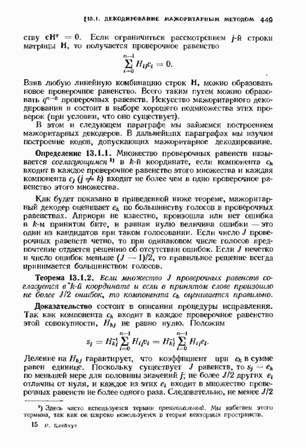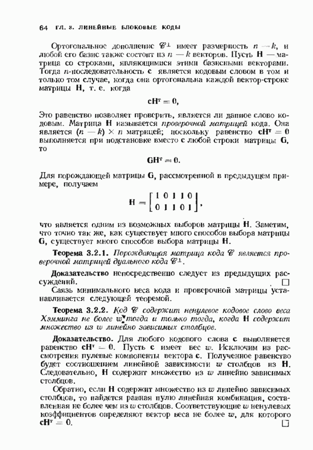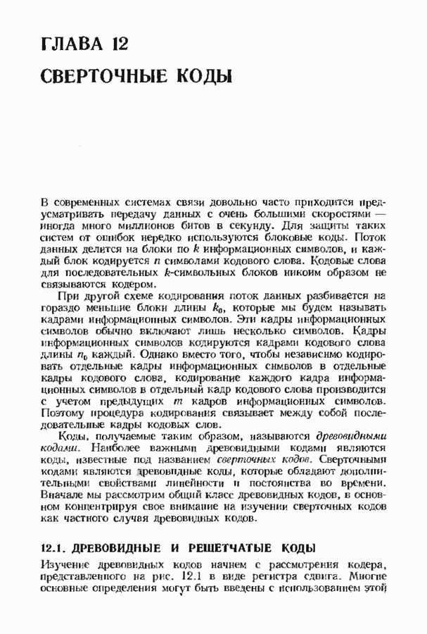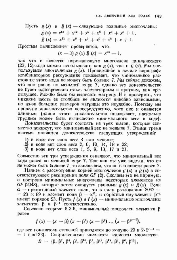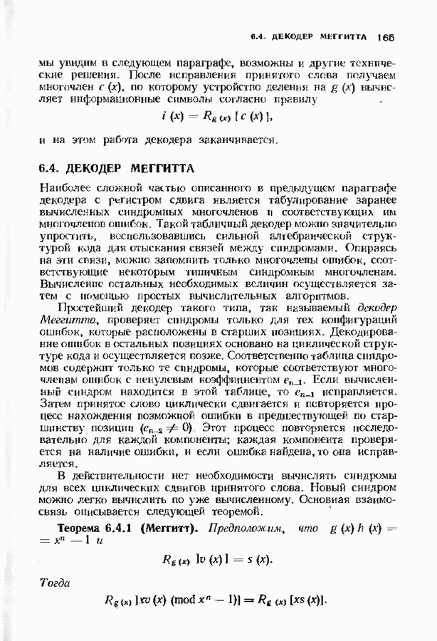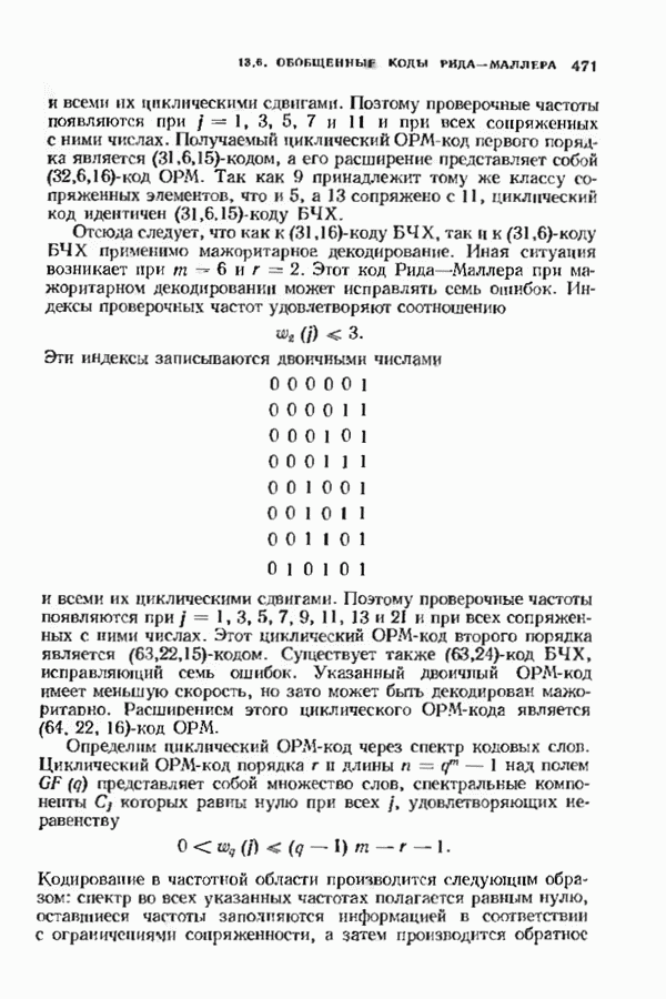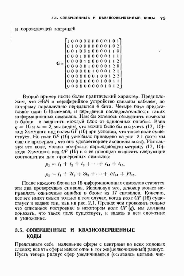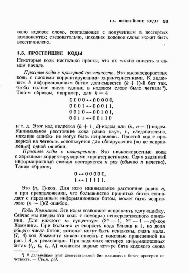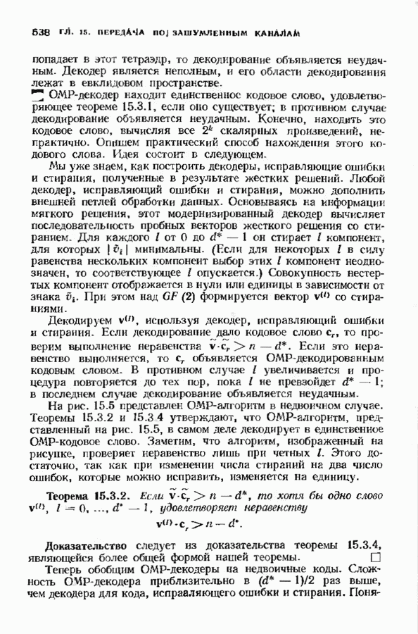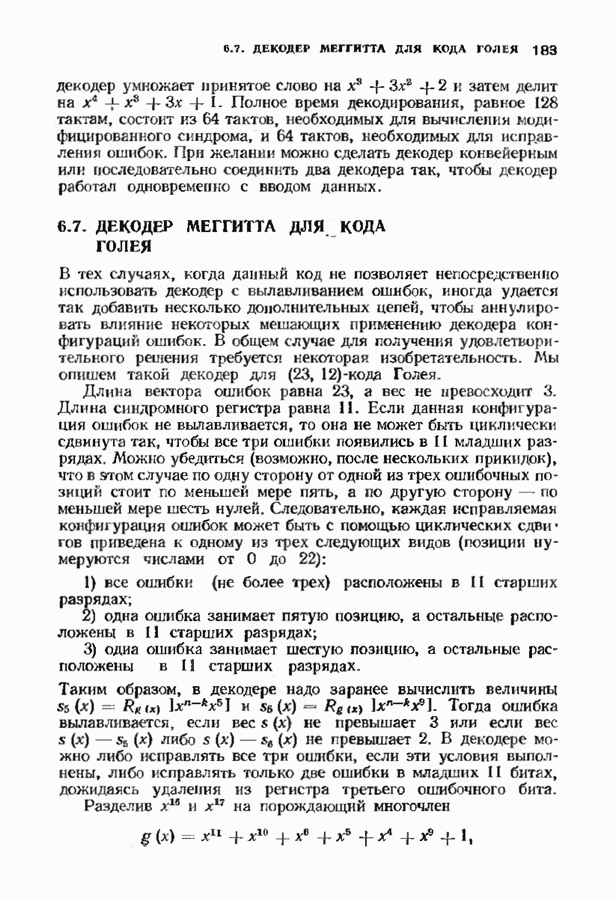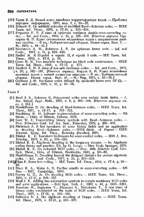 Если произошла только одна ошибка, то одна из оценок, даваемых проверочными суммами, будет неверна; мажоритарное решение дает значение Аналогично может быть продекодирован любой информационный символ, который умножается на одну из строк матрицы После того как эти информационные символы найдены, их вклад в кодовое слово вычитается из принятого слова. Это эквивалентно тому, что мы получаем слово кода Рида — Маллера Этот процесс повторяется до тех пор, пока не будут найдены все информационные биты. ЗАДАЧИ(см. скан) (см. скан) (см. скан) ЗАМЕЧАНИЯИзучение линейных кодов восходит к ранним работам Хэмминга [1950] и Голея 119491. Большинство положений, используемых в настоящее время при изучении линейных колов, заложено Слепяном [1956, 1960]: первые три параграфа тесно связаны с этими работами. Еще до этого Киксу 119537 обратил внимание на связь между линейными кодами и подпространствами векторных пространств. Коды с максимальным расстоянием впервые изучал Синглтон Двоичные коды Хэмминга как коды, исправляющие ошибки, впервые рассматривал Хэмминг, хотя подобные комбнпаторные структуры, рацее встречались в задачах статистики. Недвоичные коды Хэмминга были получены Голсем [1958] и Коком [1959]. Понятие совершенного кода впервые истречается у Голея, хотя он не пользовался таким термином. Делалось много попыток найти новые совершенные коды, но лишь отдельные из них увенчались успехом. В ряде работ Тиотявяйнен и Ван Лиит (работы завершились в 1974 и 1975 гг. соответственно) доказали, что не существует линейных (нетривиальных) совершенных кодов, отличных от кодов Хэмминга или Голея, и не существует нелинейных (нетривиальных) кодов, за исключением кодоп Васильева [1962] и Шёнхейма [1968]. Коды Рида-Маллера были получены Маллером [1954], и в этом же году Рид разработал алгоритм их декодирования. Этот алгоритм необычем тем, что принимает решение, основанное «а мажоритарной логике. Коды Рида-Маллера являются предшественниками обширных семейств мажоритарно декодируемых кодов, с которыми мы встретимся в следующих главах.