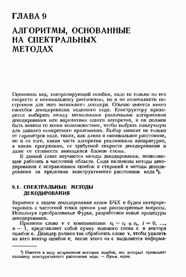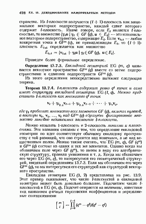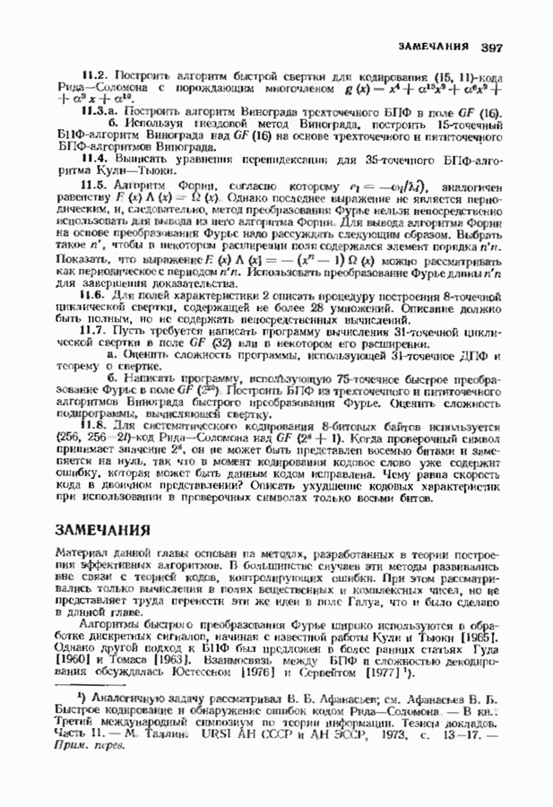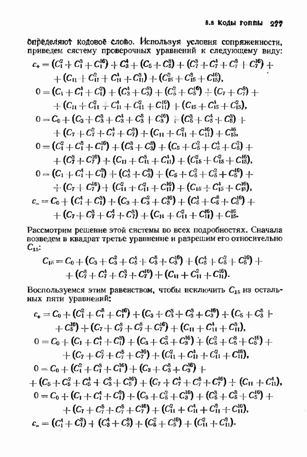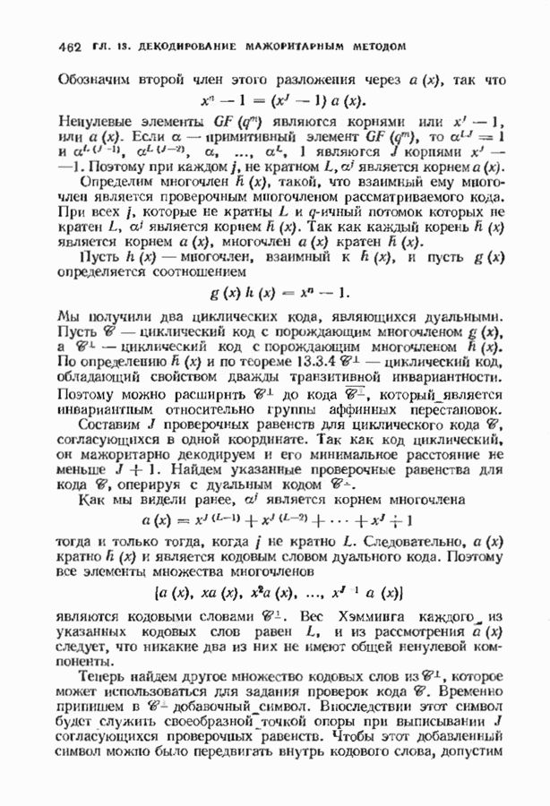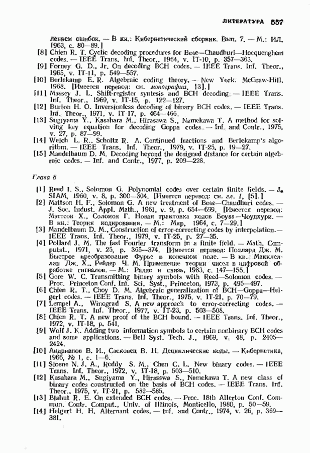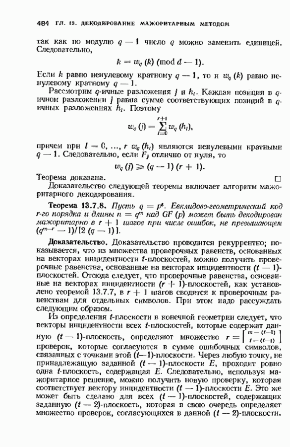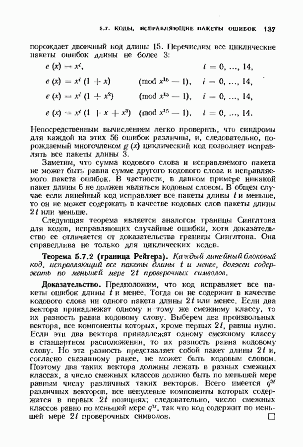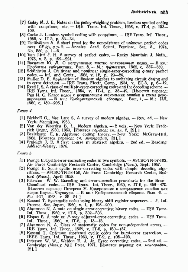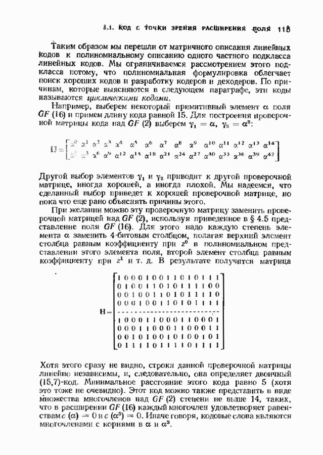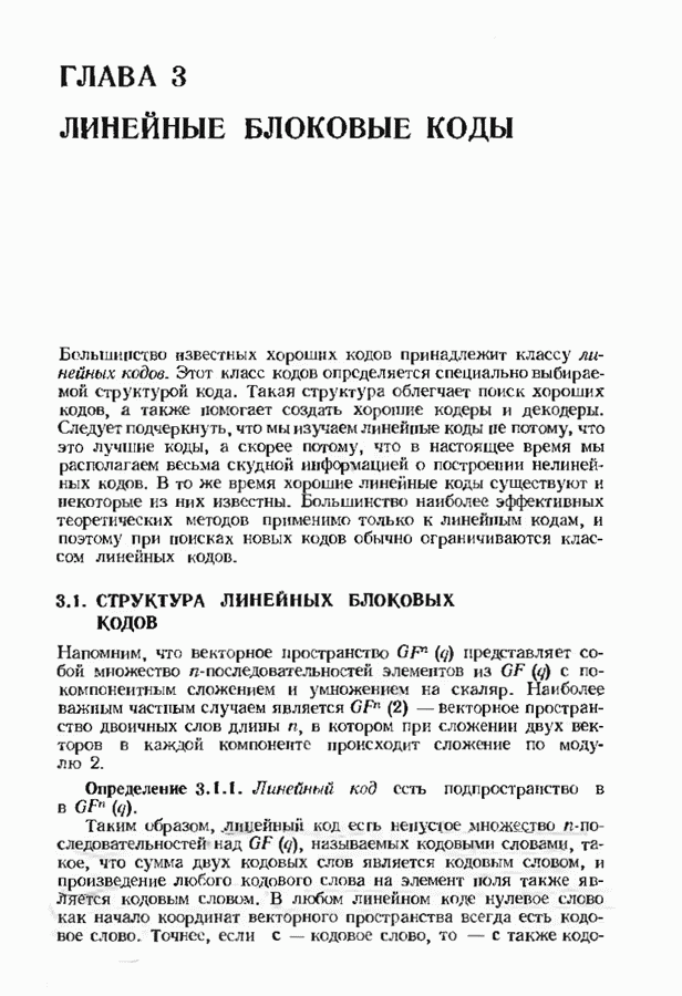 Если произошла только одна ошибка, то одна из оценок, даваемых проверочными суммами, будет неверна; мажоритарное решение дает значение Аналогично может быть продекодирован любой информационный символ, который умножается на одну из строк матрицы После того как эти информационные символы найдены, их вклад в кодовое слово вычитается из принятого слова. Это эквивалентно тому, что мы получаем слово кода Рида — Маллера Этот процесс повторяется до тех пор, пока не будут найдены все информационные биты. ЗАДАЧИ(см. скан) (см. скан) (см. скан) ЗАМЕЧАНИЯИзучение линейных кодов восходит к ранним работам Хэмминга [1950] и Голея 119491. Большинство положений, используемых в настоящее время при изучении линейных колов, заложено Слепяном [1956, 1960]: первые три параграфа тесно связаны с этими работами. Еще до этого Киксу 119537 обратил внимание на связь между линейными кодами и подпространствами векторных пространств. Коды с максимальным расстоянием впервые изучал Синглтон Двоичные коды Хэмминга как коды, исправляющие ошибки, впервые рассматривал Хэмминг, хотя подобные комбнпаторные структуры, рацее встречались в задачах статистики. Недвоичные коды Хэмминга были получены Голсем [1958] и Коком [1959]. Понятие совершенного кода впервые истречается у Голея, хотя он не пользовался таким термином. Делалось много попыток найти новые совершенные коды, но лишь отдельные из них увенчались успехом. В ряде работ Тиотявяйнен и Ван Лиит (работы завершились в 1974 и 1975 гг. соответственно) доказали, что не существует линейных (нетривиальных) совершенных кодов, отличных от кодов Хэмминга или Голея, и не существует нелинейных (нетривиальных) кодов, за исключением кодоп Васильева [1962] и Шёнхейма [1968]. Коды Рида-Маллера были получены Маллером [1954], и в этом же году Рид разработал алгоритм их декодирования. Этот алгоритм необычем тем, что принимает решение, основанное «а мажоритарной логике. Коды Рида-Маллера являются предшественниками обширных семейств мажоритарно декодируемых кодов, с которыми мы встретимся в следующих главах.