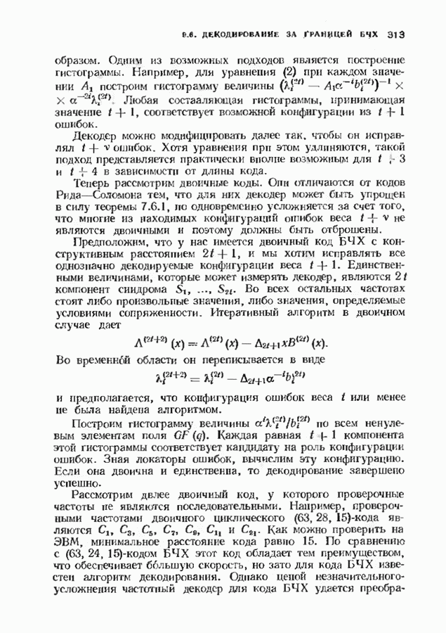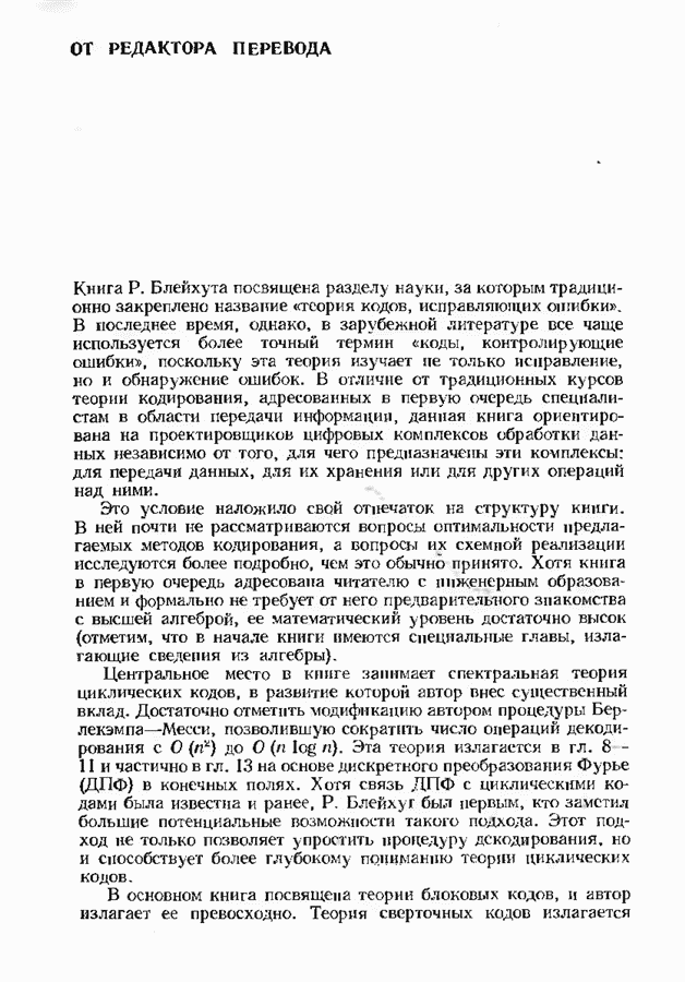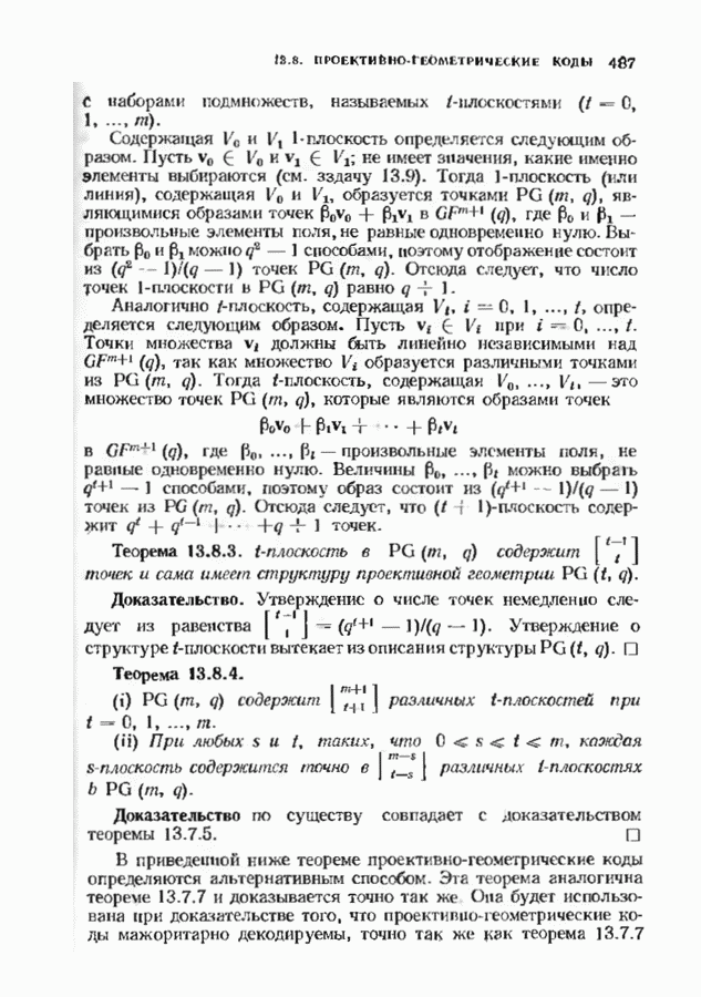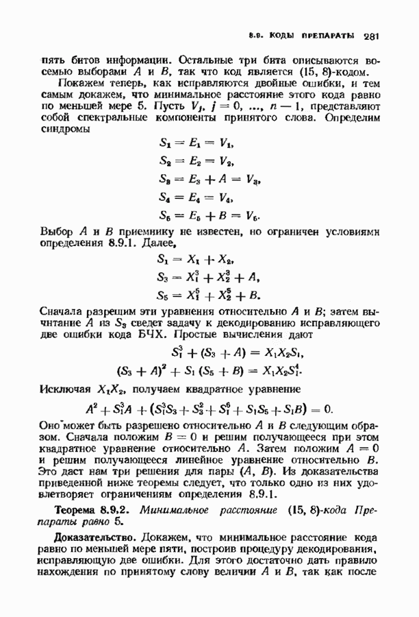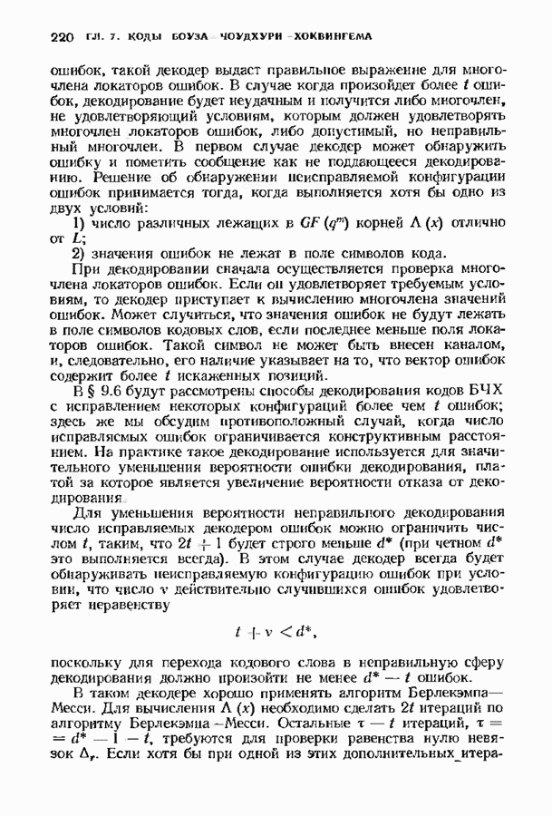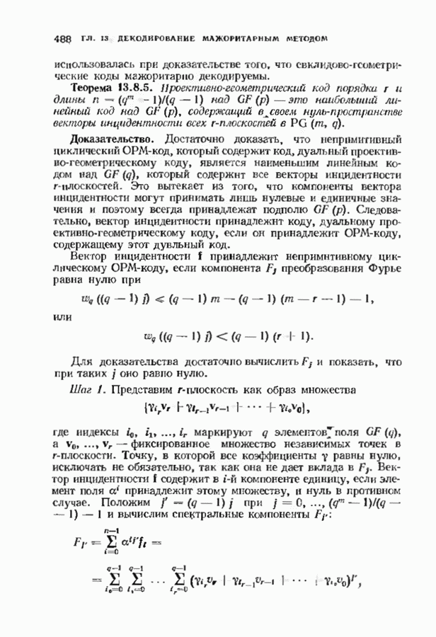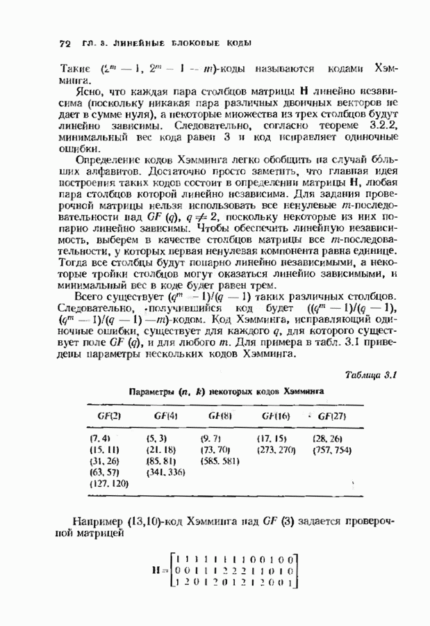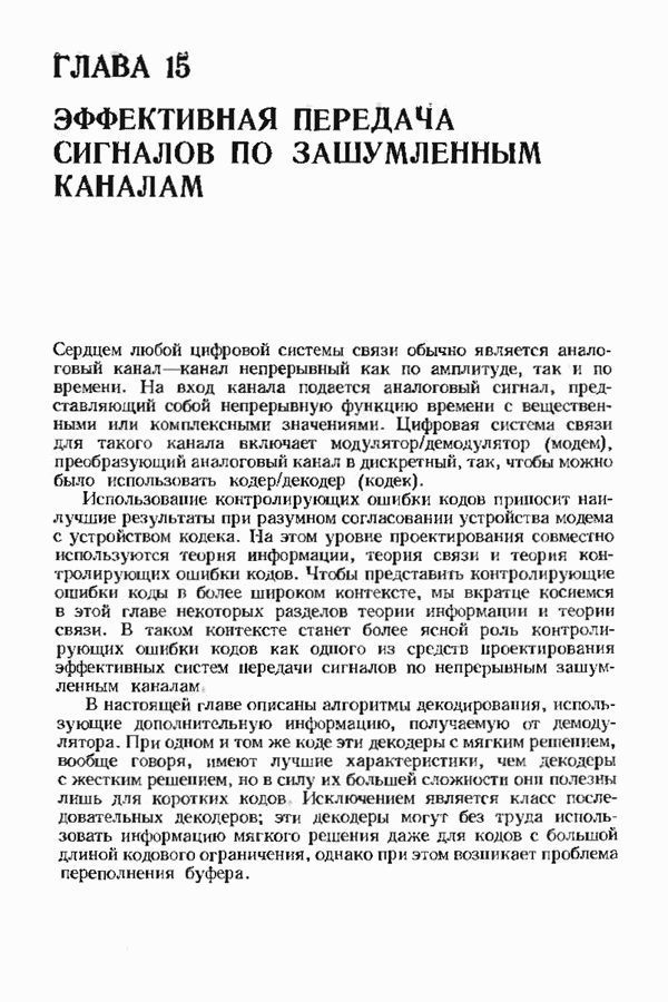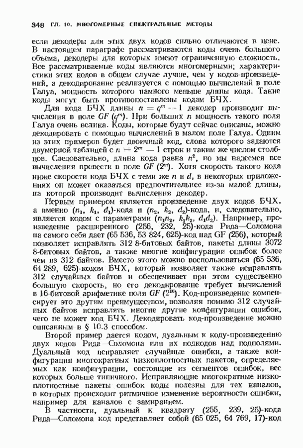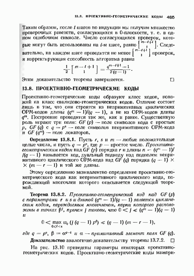 Если произошла только одна ошибка, то одна из оценок, даваемых проверочными суммами, будет неверна; мажоритарное решение дает значение Аналогично может быть продекодирован любой информационный символ, который умножается на одну из строк матрицы После того как эти информационные символы найдены, их вклад в кодовое слово вычитается из принятого слова. Это эквивалентно тому, что мы получаем слово кода Рида — Маллера Этот процесс повторяется до тех пор, пока не будут найдены все информационные биты. ЗАДАЧИ(см. скан) (см. скан) (см. скан) ЗАМЕЧАНИЯИзучение линейных кодов восходит к ранним работам Хэмминга [1950] и Голея 119491. Большинство положений, используемых в настоящее время при изучении линейных колов, заложено Слепяном [1956, 1960]: первые три параграфа тесно связаны с этими работами. Еще до этого Киксу 119537 обратил внимание на связь между линейными кодами и подпространствами векторных пространств. Коды с максимальным расстоянием впервые изучал Синглтон Двоичные коды Хэмминга как коды, исправляющие ошибки, впервые рассматривал Хэмминг, хотя подобные комбнпаторные структуры, рацее встречались в задачах статистики. Недвоичные коды Хэмминга были получены Голсем [1958] и Коком [1959]. Понятие совершенного кода впервые истречается у Голея, хотя он не пользовался таким термином. Делалось много попыток найти новые совершенные коды, но лишь отдельные из них увенчались успехом. В ряде работ Тиотявяйнен и Ван Лиит (работы завершились в 1974 и 1975 гг. соответственно) доказали, что не существует линейных (нетривиальных) совершенных кодов, отличных от кодов Хэмминга или Голея, и не существует нелинейных (нетривиальных) кодов, за исключением кодоп Васильева [1962] и Шёнхейма [1968]. Коды Рида-Маллера были получены Маллером [1954], и в этом же году Рид разработал алгоритм их декодирования. Этот алгоритм необычем тем, что принимает решение, основанное «а мажоритарной логике. Коды Рида-Маллера являются предшественниками обширных семейств мажоритарно декодируемых кодов, с которыми мы встретимся в следующих главах.
