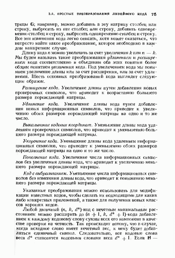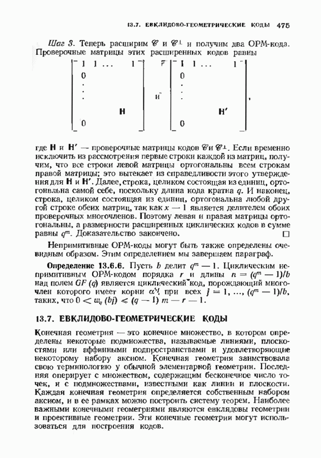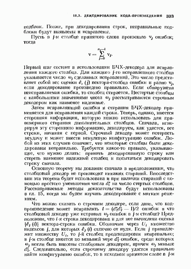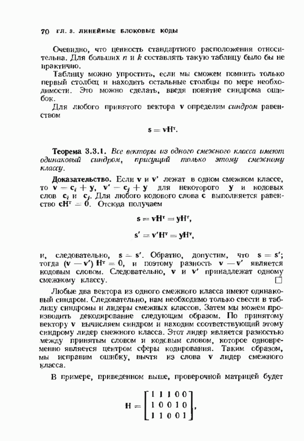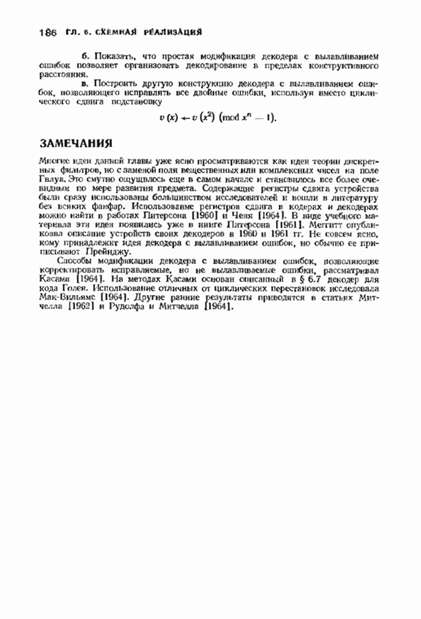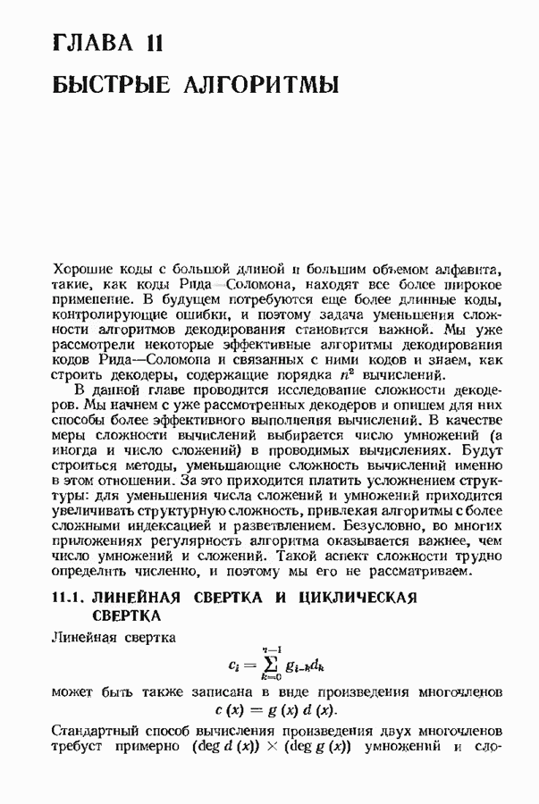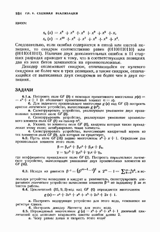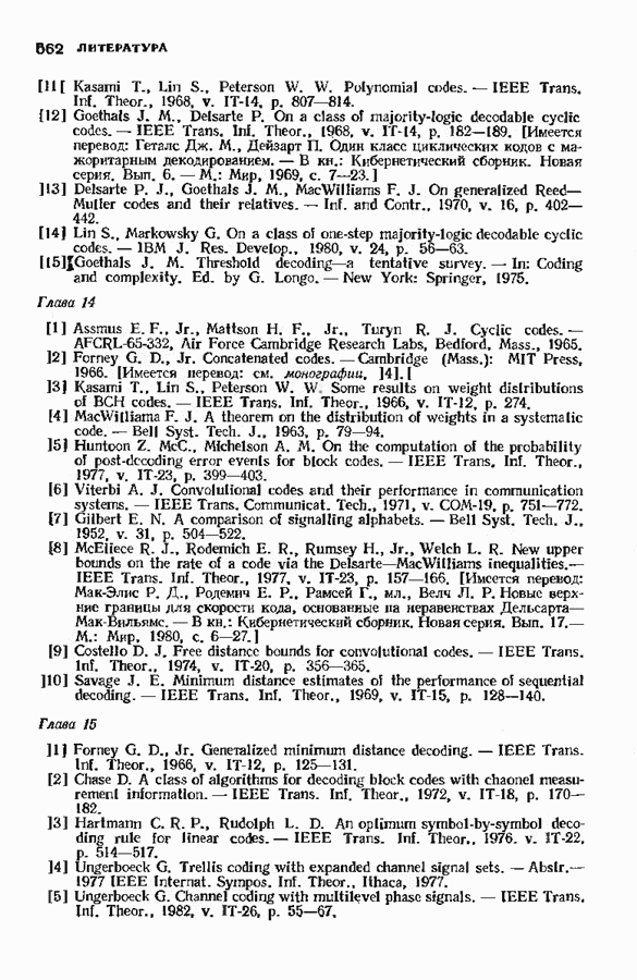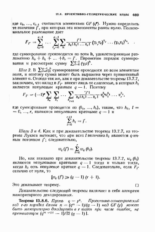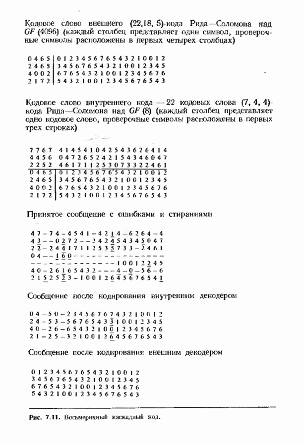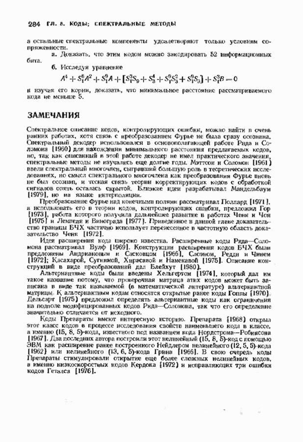 Если произошла только одна ошибка, то одна из оценок, даваемых проверочными суммами, будет неверна; мажоритарное решение дает значение Аналогично может быть продекодирован любой информационный символ, который умножается на одну из строк матрицы После того как эти информационные символы найдены, их вклад в кодовое слово вычитается из принятого слова. Это эквивалентно тому, что мы получаем слово кода Рида — Маллера Этот процесс повторяется до тех пор, пока не будут найдены все информационные биты. ЗАДАЧИ(см. скан) (см. скан) (см. скан) ЗАМЕЧАНИЯИзучение линейных кодов восходит к ранним работам Хэмминга [1950] и Голея 119491. Большинство положений, используемых в настоящее время при изучении линейных колов, заложено Слепяном [1956, 1960]: первые три параграфа тесно связаны с этими работами. Еще до этого Киксу 119537 обратил внимание на связь между линейными кодами и подпространствами векторных пространств. Коды с максимальным расстоянием впервые изучал Синглтон Двоичные коды Хэмминга как коды, исправляющие ошибки, впервые рассматривал Хэмминг, хотя подобные комбнпаторные структуры, рацее встречались в задачах статистики. Недвоичные коды Хэмминга были получены Голсем [1958] и Коком [1959]. Понятие совершенного кода впервые истречается у Голея, хотя он не пользовался таким термином. Делалось много попыток найти новые совершенные коды, но лишь отдельные из них увенчались успехом. В ряде работ Тиотявяйнен и Ван Лиит (работы завершились в 1974 и 1975 гг. соответственно) доказали, что не существует линейных (нетривиальных) совершенных кодов, отличных от кодов Хэмминга или Голея, и не существует нелинейных (нетривиальных) кодов, за исключением кодоп Васильева [1962] и Шёнхейма [1968]. Коды Рида-Маллера были получены Маллером [1954], и в этом же году Рид разработал алгоритм их декодирования. Этот алгоритм необычем тем, что принимает решение, основанное «а мажоритарной логике. Коды Рида-Маллера являются предшественниками обширных семейств мажоритарно декодируемых кодов, с которыми мы встретимся в следующих главах.