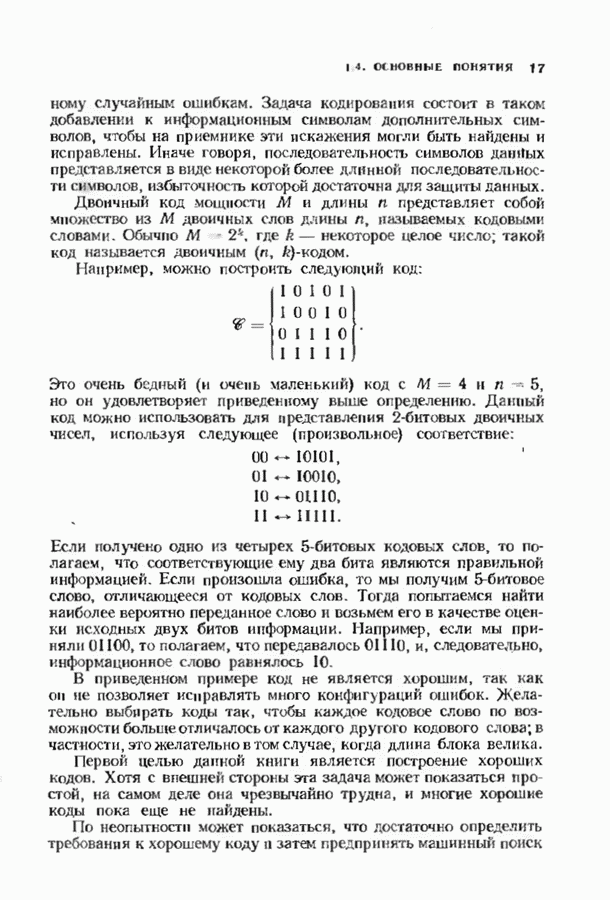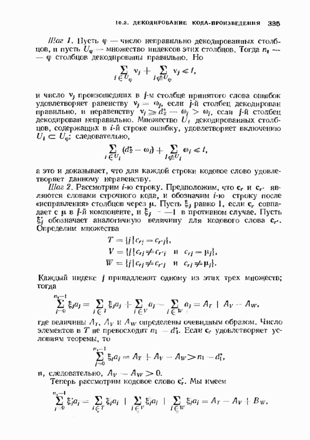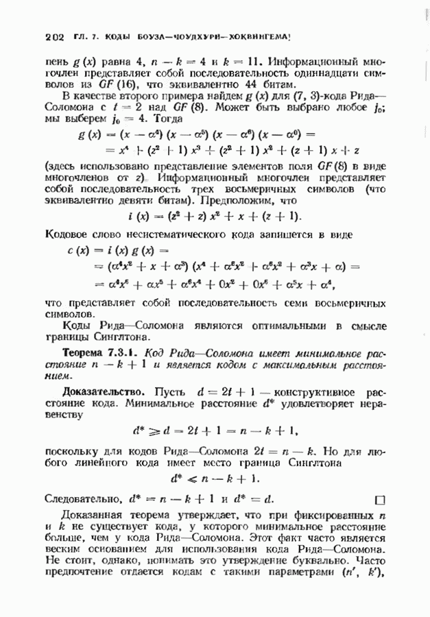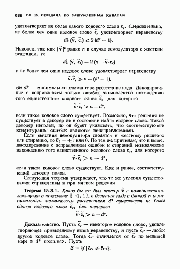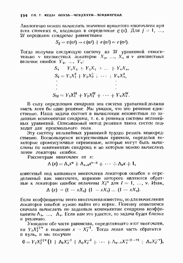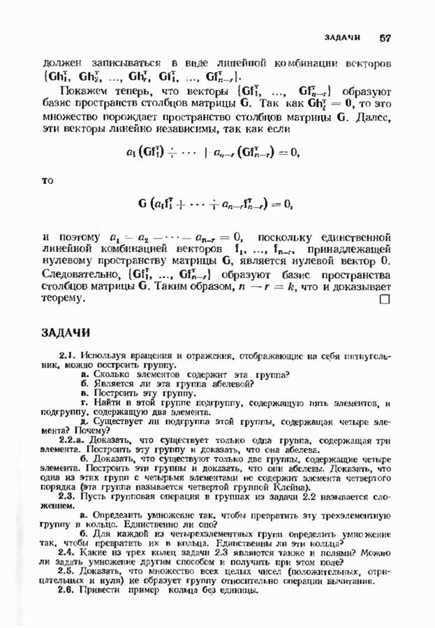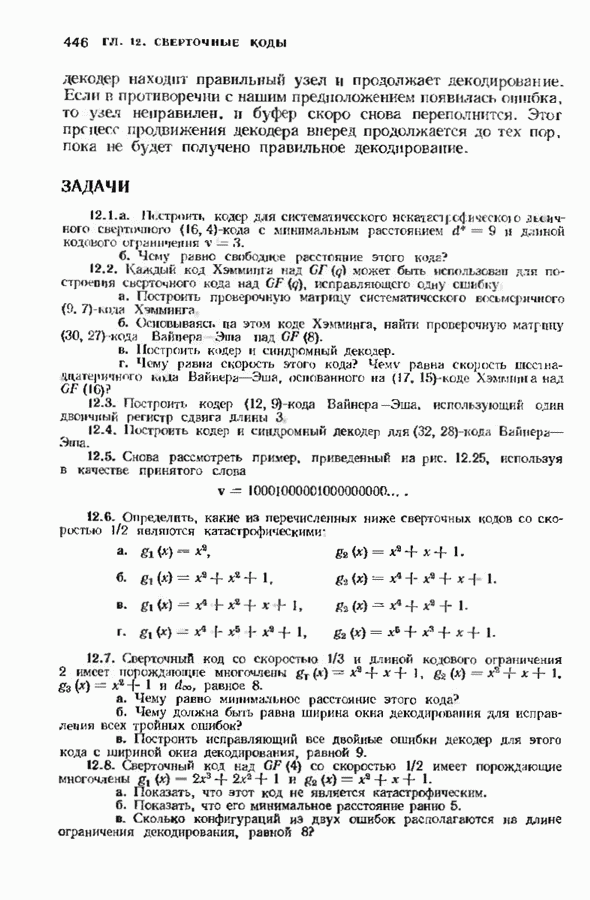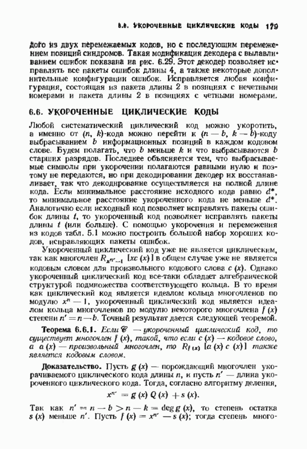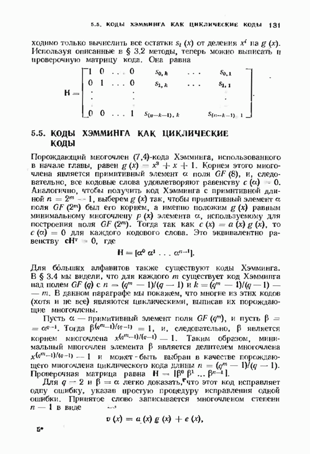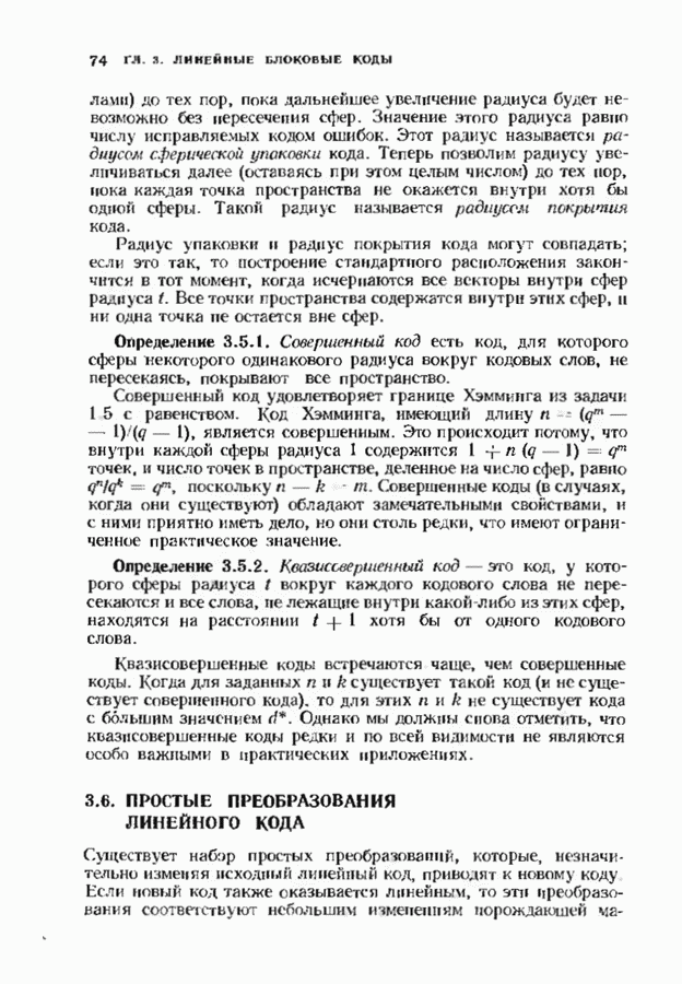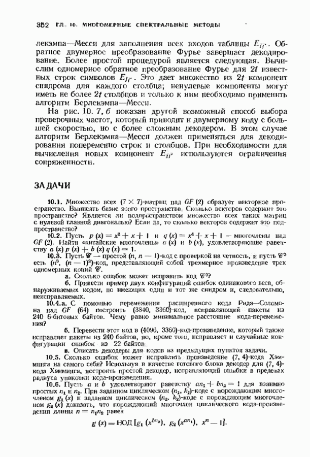 Если произошла только одна ошибка, то одна из оценок, даваемых проверочными суммами, будет неверна; мажоритарное решение дает значение Аналогично может быть продекодирован любой информационный символ, который умножается на одну из строк матрицы После того как эти информационные символы найдены, их вклад в кодовое слово вычитается из принятого слова. Это эквивалентно тому, что мы получаем слово кода Рида — Маллера Этот процесс повторяется до тех пор, пока не будут найдены все информационные биты. ЗАДАЧИ(см. скан) (см. скан) (см. скан) ЗАМЕЧАНИЯИзучение линейных кодов восходит к ранним работам Хэмминга [1950] и Голея 119491. Большинство положений, используемых в настоящее время при изучении линейных колов, заложено Слепяном [1956, 1960]: первые три параграфа тесно связаны с этими работами. Еще до этого Киксу 119537 обратил внимание на связь между линейными кодами и подпространствами векторных пространств. Коды с максимальным расстоянием впервые изучал Синглтон Двоичные коды Хэмминга как коды, исправляющие ошибки, впервые рассматривал Хэмминг, хотя подобные комбнпаторные структуры, рацее встречались в задачах статистики. Недвоичные коды Хэмминга были получены Голсем [1958] и Коком [1959]. Понятие совершенного кода впервые истречается у Голея, хотя он не пользовался таким термином. Делалось много попыток найти новые совершенные коды, но лишь отдельные из них увенчались успехом. В ряде работ Тиотявяйнен и Ван Лиит (работы завершились в 1974 и 1975 гг. соответственно) доказали, что не существует линейных (нетривиальных) совершенных кодов, отличных от кодов Хэмминга или Голея, и не существует нелинейных (нетривиальных) кодов, за исключением кодоп Васильева [1962] и Шёнхейма [1968]. Коды Рида-Маллера были получены Маллером [1954], и в этом же году Рид разработал алгоритм их декодирования. Этот алгоритм необычем тем, что принимает решение, основанное «а мажоритарной логике. Коды Рида-Маллера являются предшественниками обширных семейств мажоритарно декодируемых кодов, с которыми мы встретимся в следующих главах.