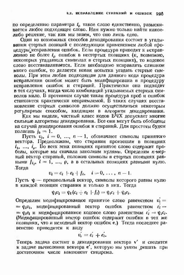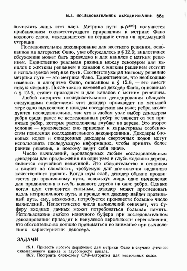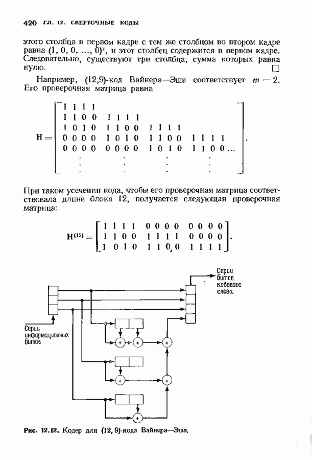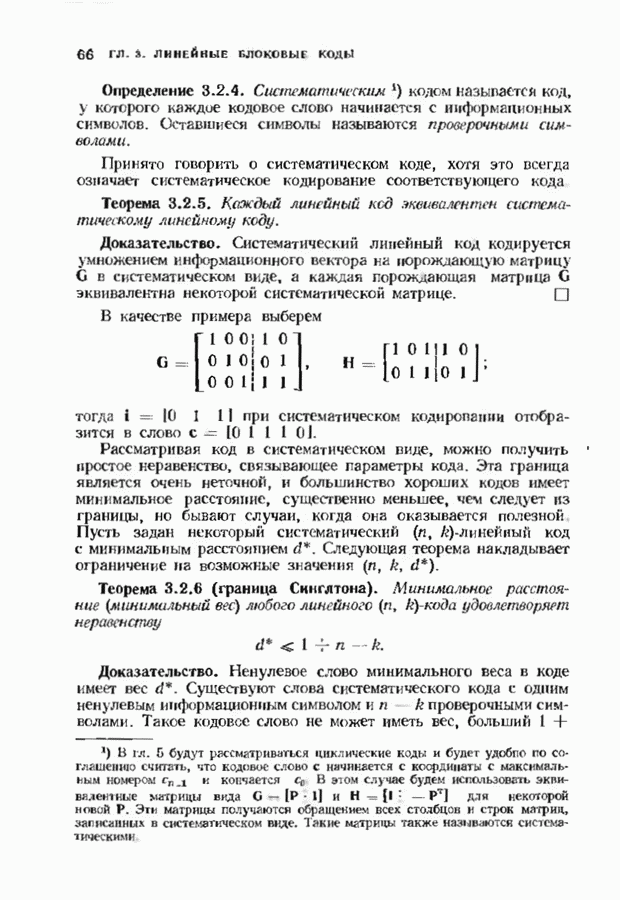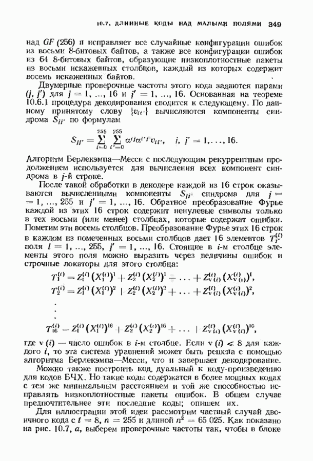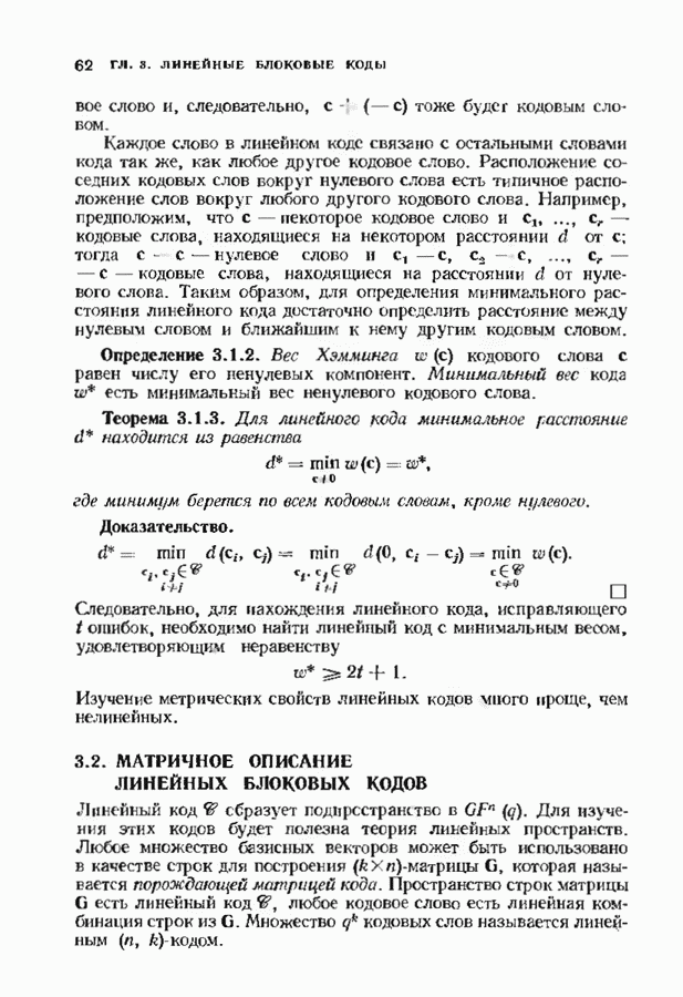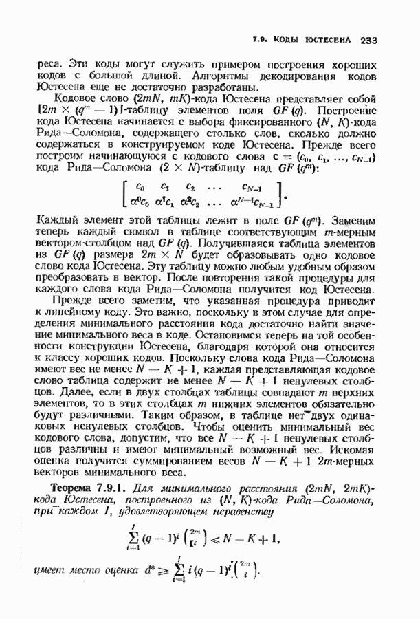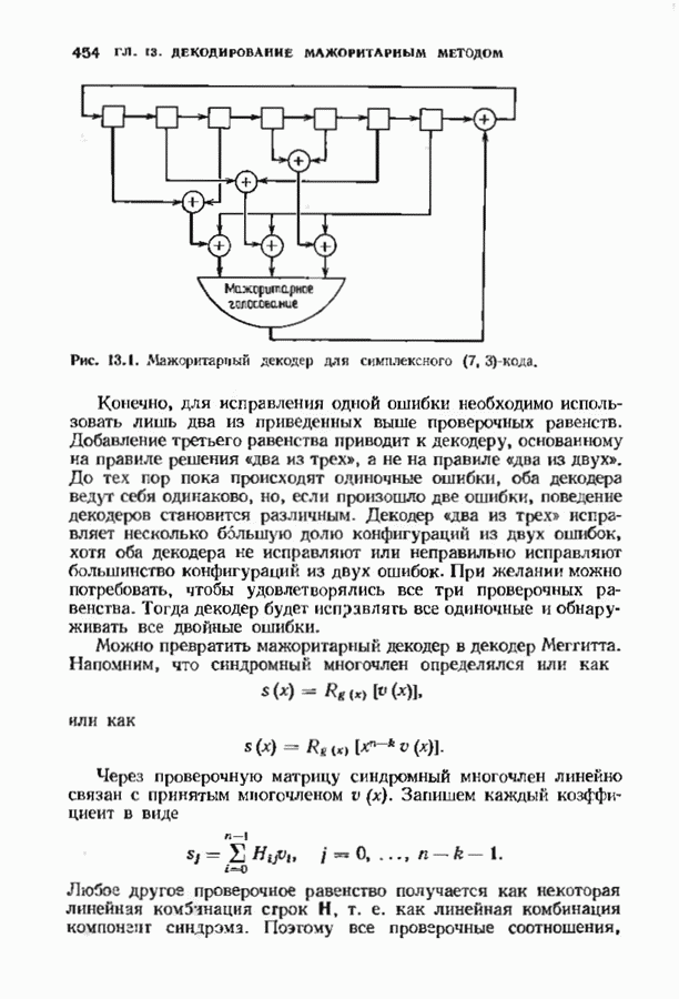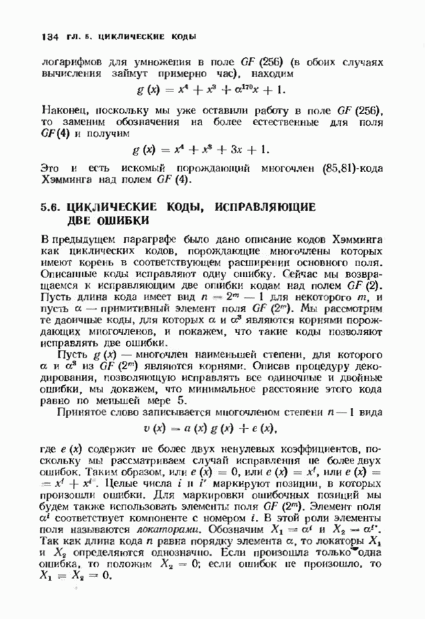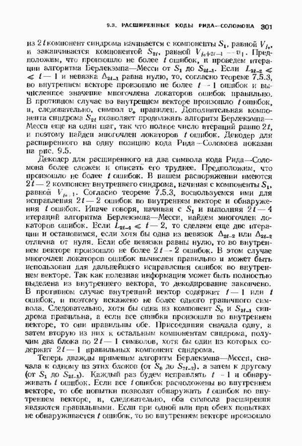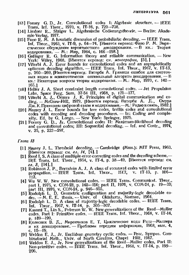 Если произошла только одна ошибка, то одна из оценок, даваемых проверочными суммами, будет неверна; мажоритарное решение дает значение Аналогично может быть продекодирован любой информационный символ, который умножается на одну из строк матрицы После того как эти информационные символы найдены, их вклад в кодовое слово вычитается из принятого слова. Это эквивалентно тому, что мы получаем слово кода Рида — Маллера Этот процесс повторяется до тех пор, пока не будут найдены все информационные биты. ЗАДАЧИ(см. скан) (см. скан) (см. скан) ЗАМЕЧАНИЯИзучение линейных кодов восходит к ранним работам Хэмминга [1950] и Голея 119491. Большинство положений, используемых в настоящее время при изучении линейных колов, заложено Слепяном [1956, 1960]: первые три параграфа тесно связаны с этими работами. Еще до этого Киксу 119537 обратил внимание на связь между линейными кодами и подпространствами векторных пространств. Коды с максимальным расстоянием впервые изучал Синглтон Двоичные коды Хэмминга как коды, исправляющие ошибки, впервые рассматривал Хэмминг, хотя подобные комбнпаторные структуры, рацее встречались в задачах статистики. Недвоичные коды Хэмминга были получены Голсем [1958] и Коком [1959]. Понятие совершенного кода впервые истречается у Голея, хотя он не пользовался таким термином. Делалось много попыток найти новые совершенные коды, но лишь отдельные из них увенчались успехом. В ряде работ Тиотявяйнен и Ван Лиит (работы завершились в 1974 и 1975 гг. соответственно) доказали, что не существует линейных (нетривиальных) совершенных кодов, отличных от кодов Хэмминга или Голея, и не существует нелинейных (нетривиальных) кодов, за исключением кодоп Васильева [1962] и Шёнхейма [1968]. Коды Рида-Маллера были получены Маллером [1954], и в этом же году Рид разработал алгоритм их декодирования. Этот алгоритм необычем тем, что принимает решение, основанное «а мажоритарной логике. Коды Рида-Маллера являются предшественниками обширных семейств мажоритарно декодируемых кодов, с которыми мы встретимся в следующих главах.